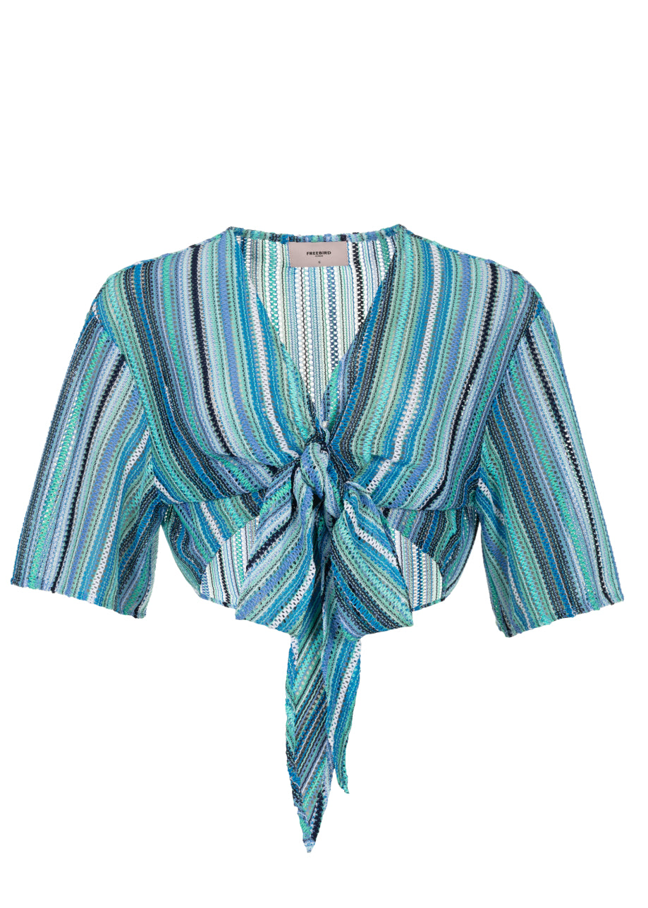 - Knitted blue kimono with stripe design.