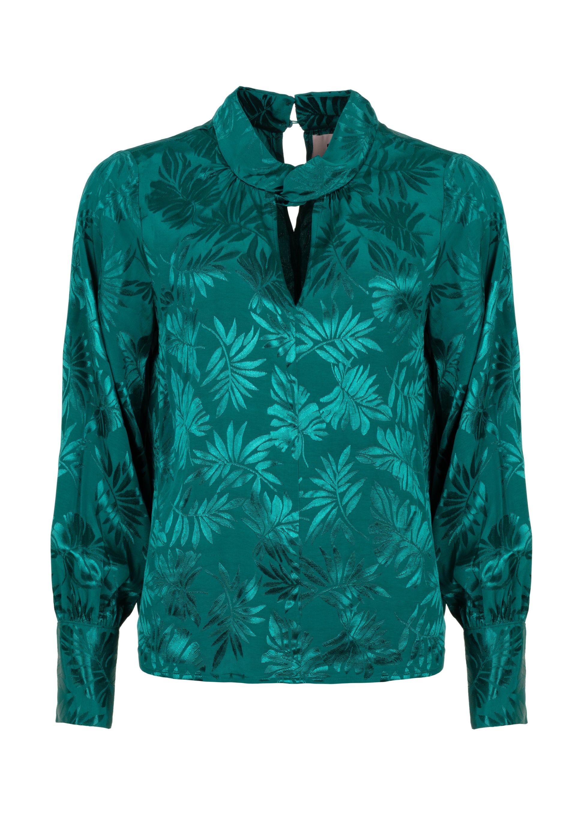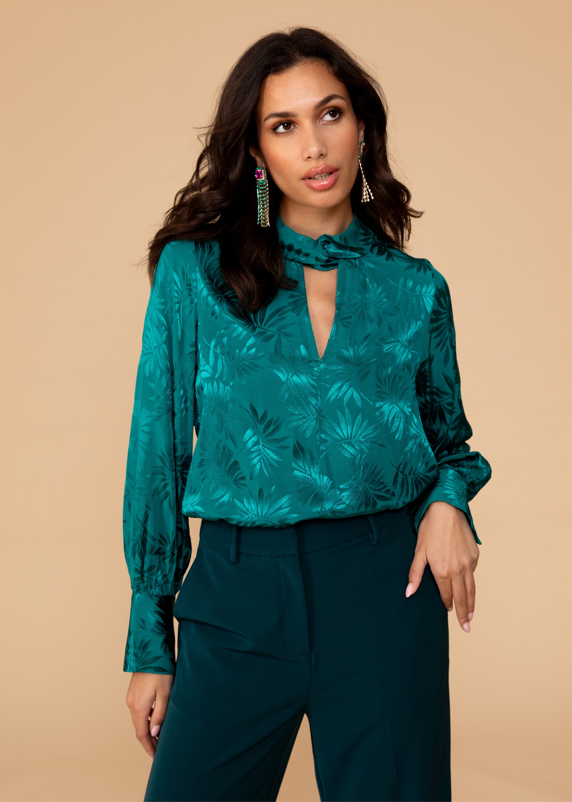 This elegant blouse is made from a shiny viscose fabric with a jacquard pattern, offering a luxurious and stylish look. The blouse features a standing collar and a beautiful tie detail at the back, adding a refined touch.