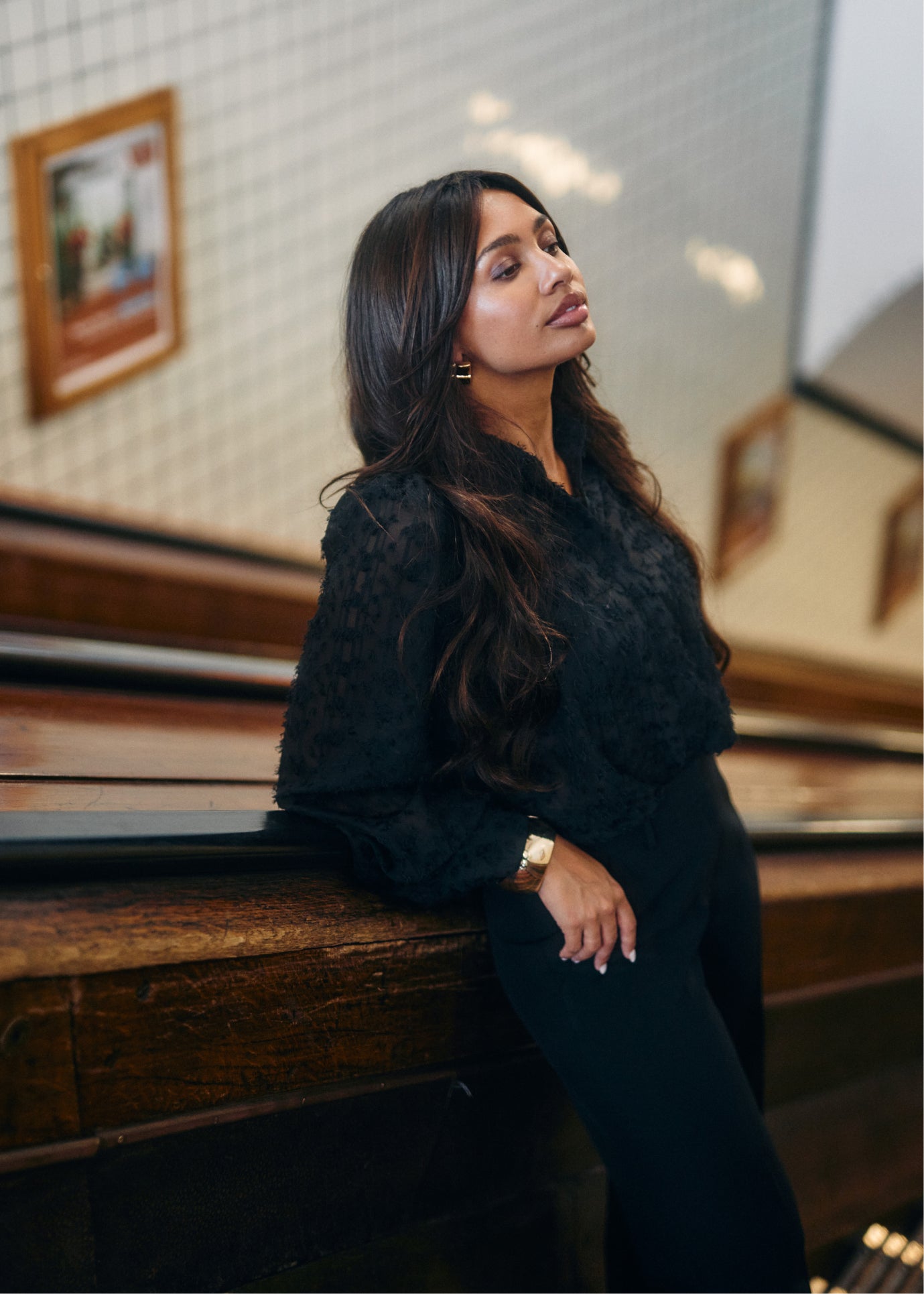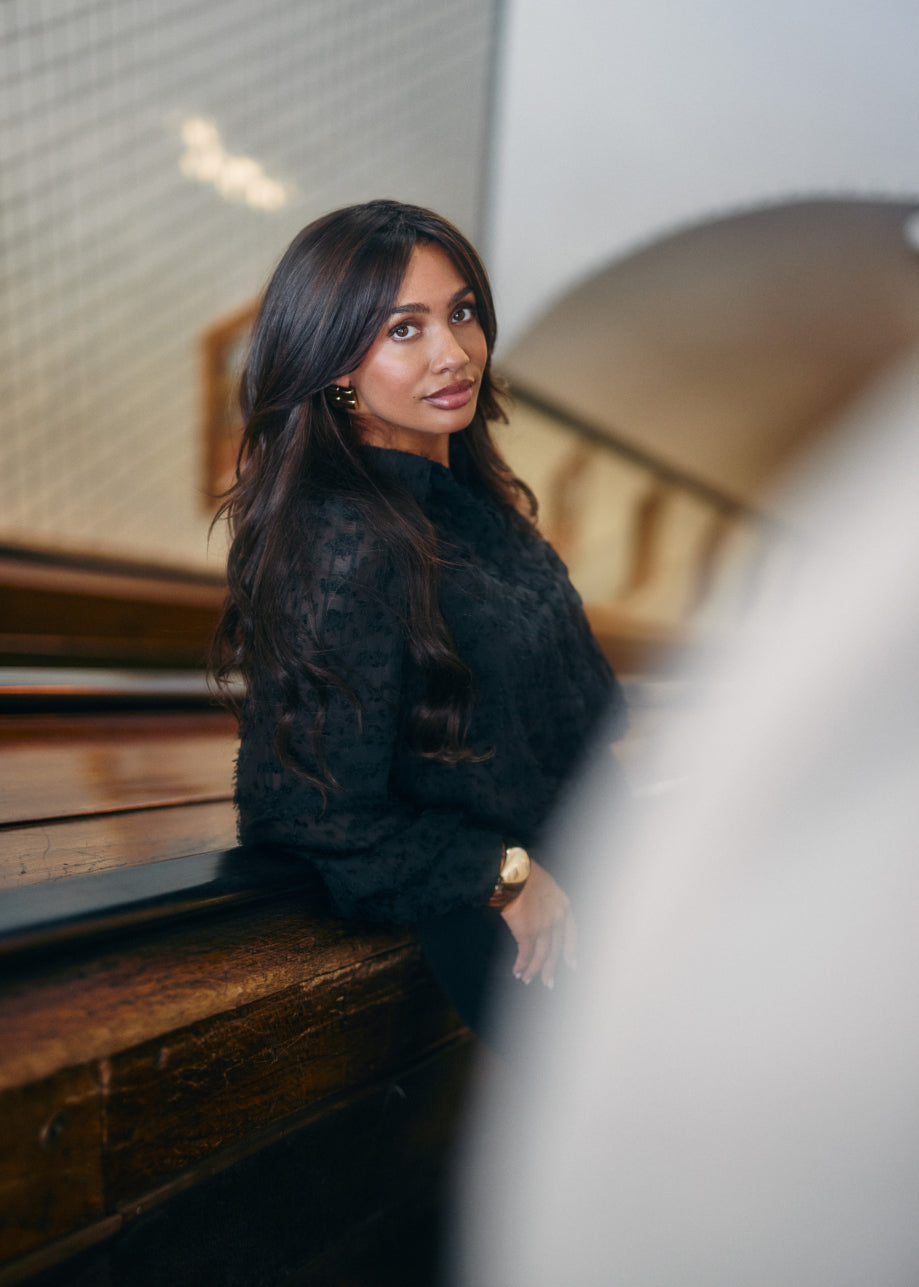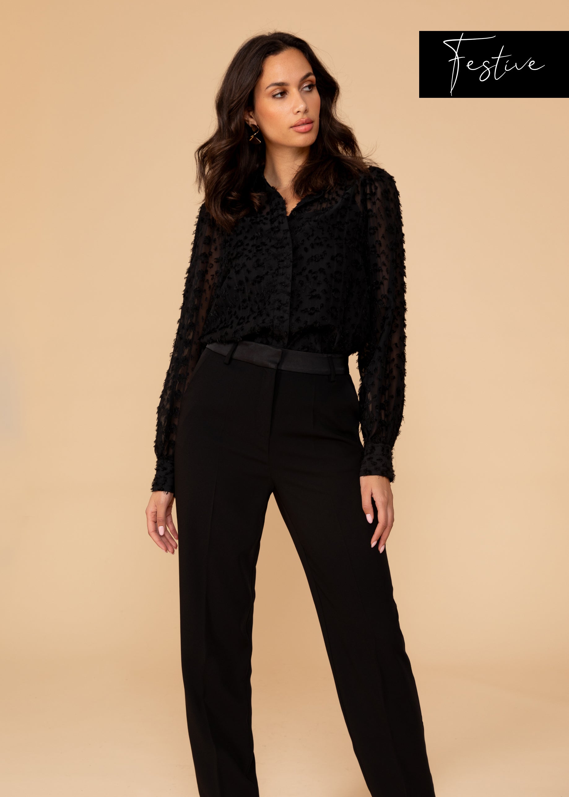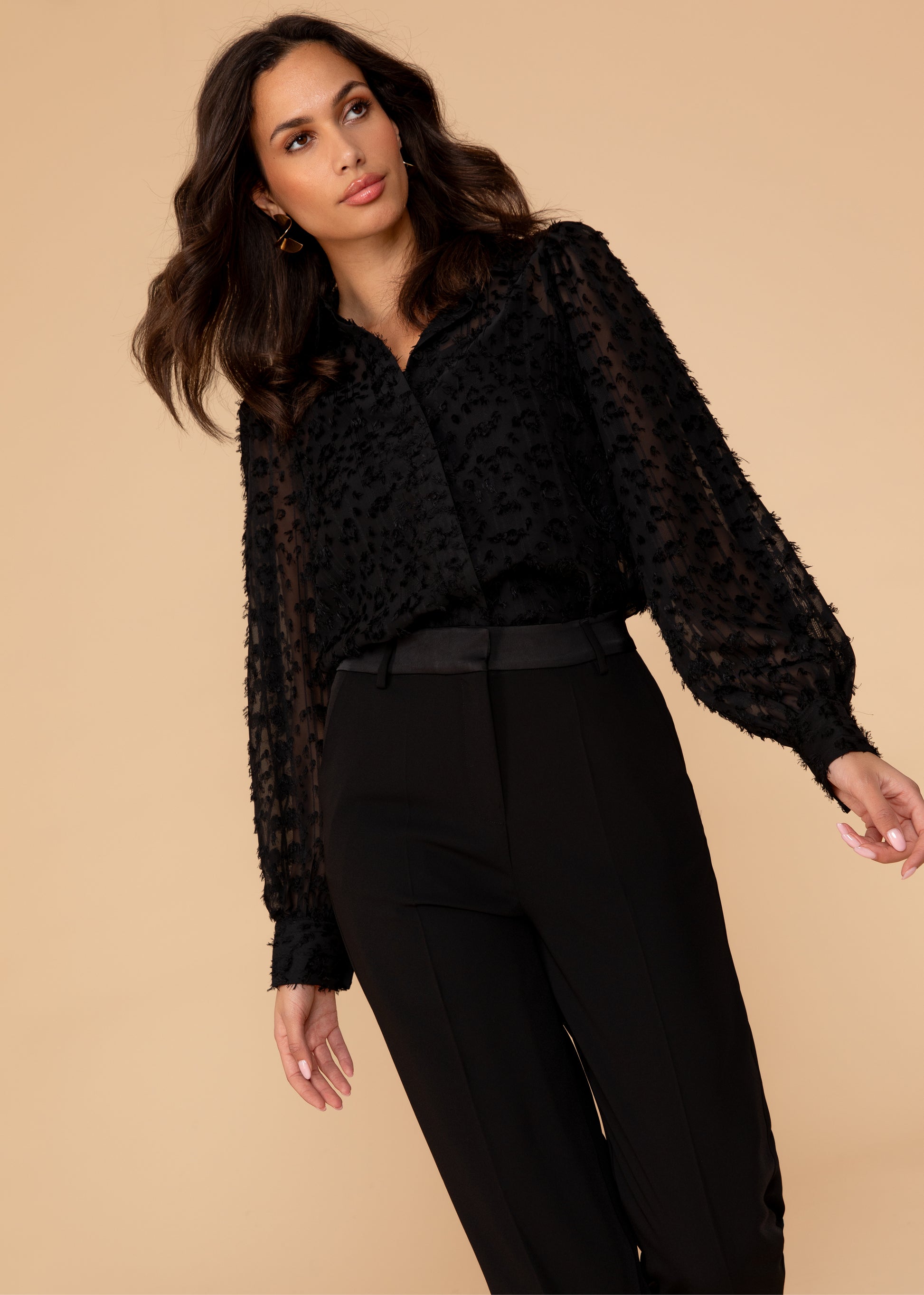 This elegant blouse is made from luxurious Hairy Jacquard fabric, offering a refined look. The blouse features a classic collar and beautiful balloon sleeves, adding a subtle voluminous effect.