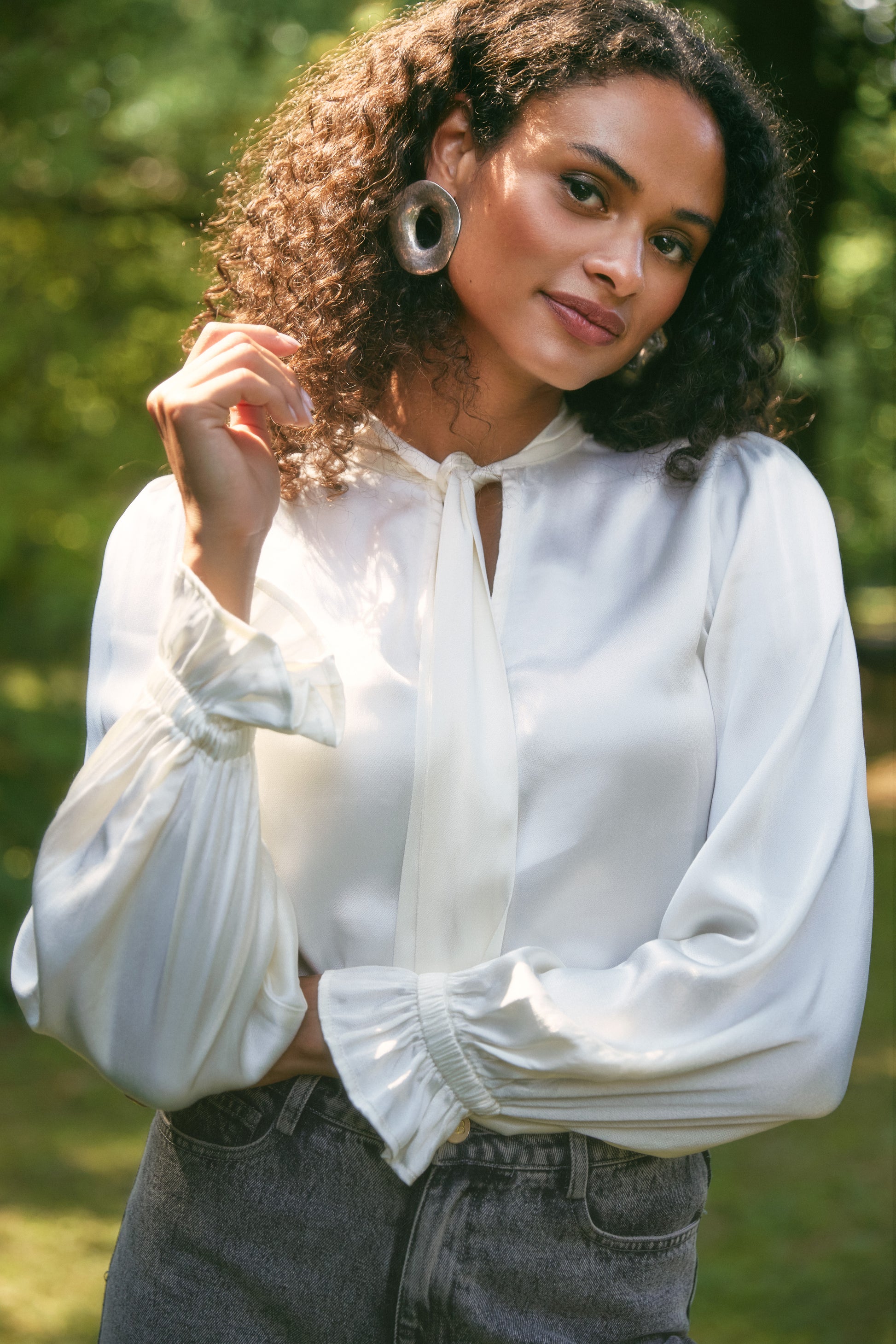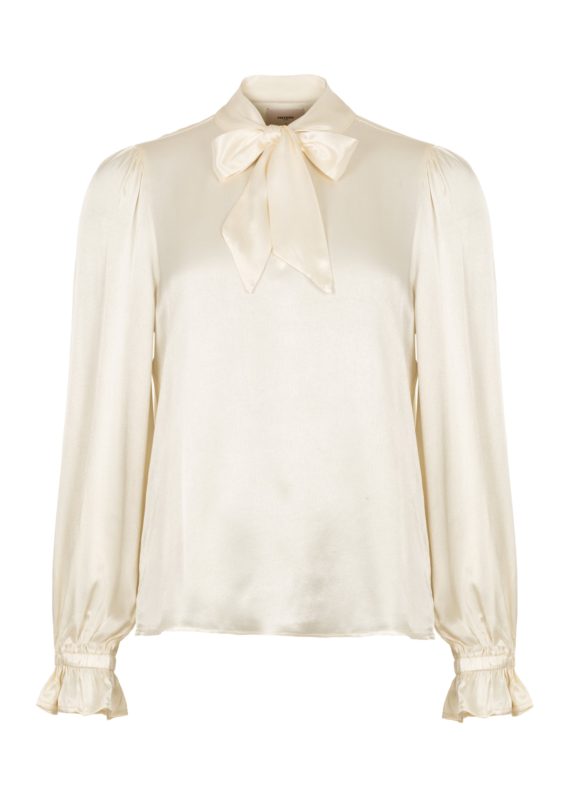 This beautiful off-white blouse is made from a lovely, shiny natural fabric. The refined details give the blouse a beautiful feminine look. Features: