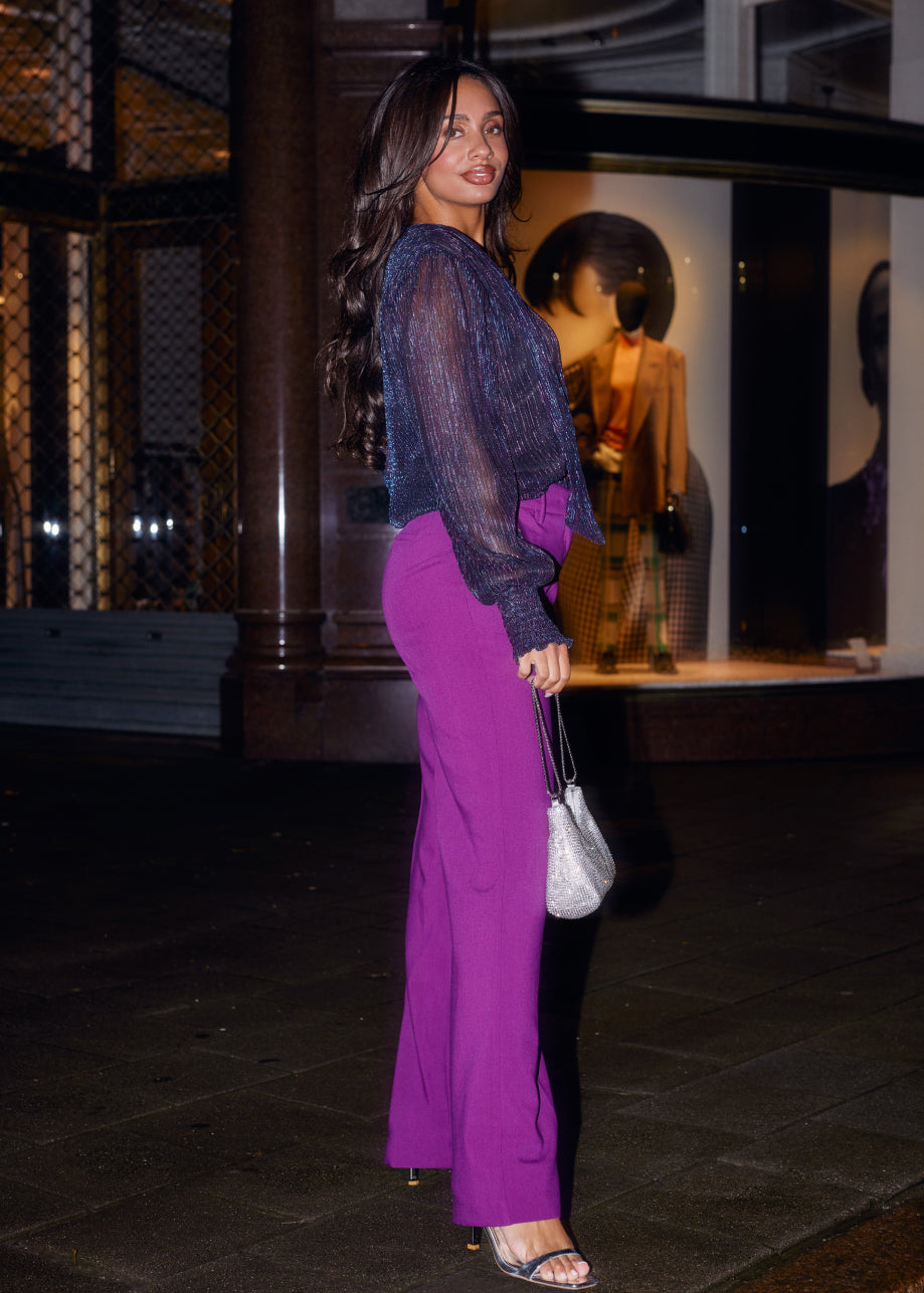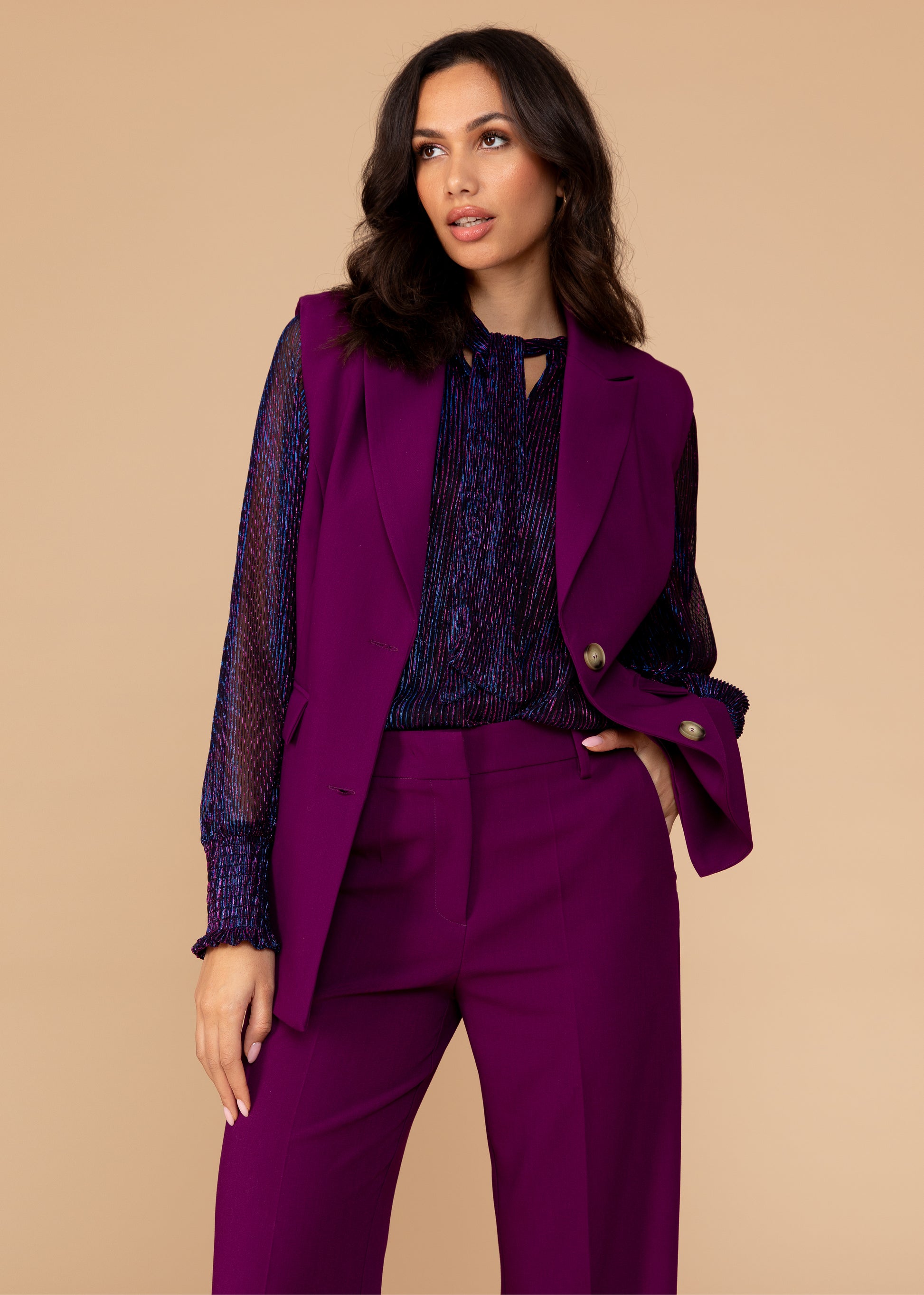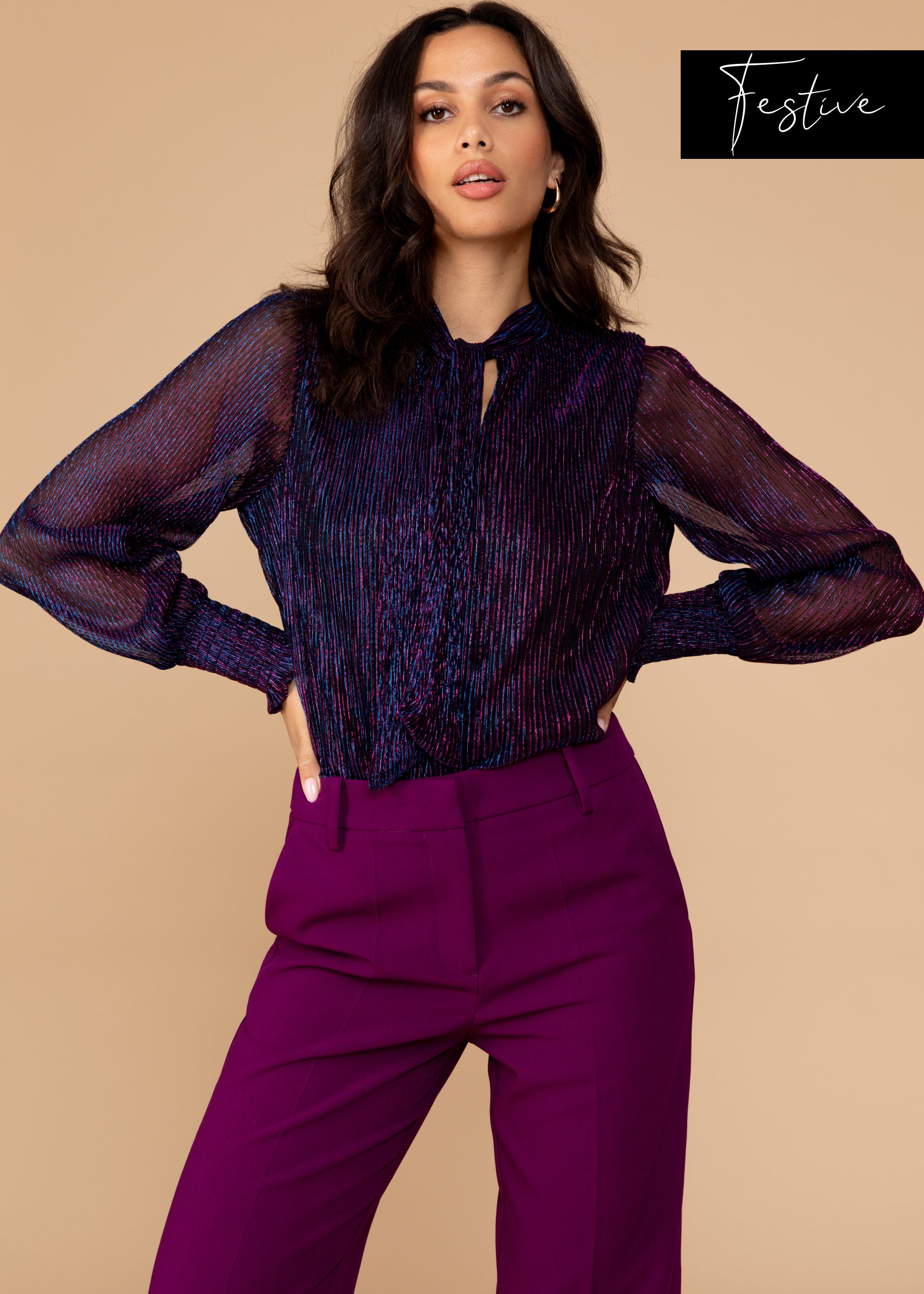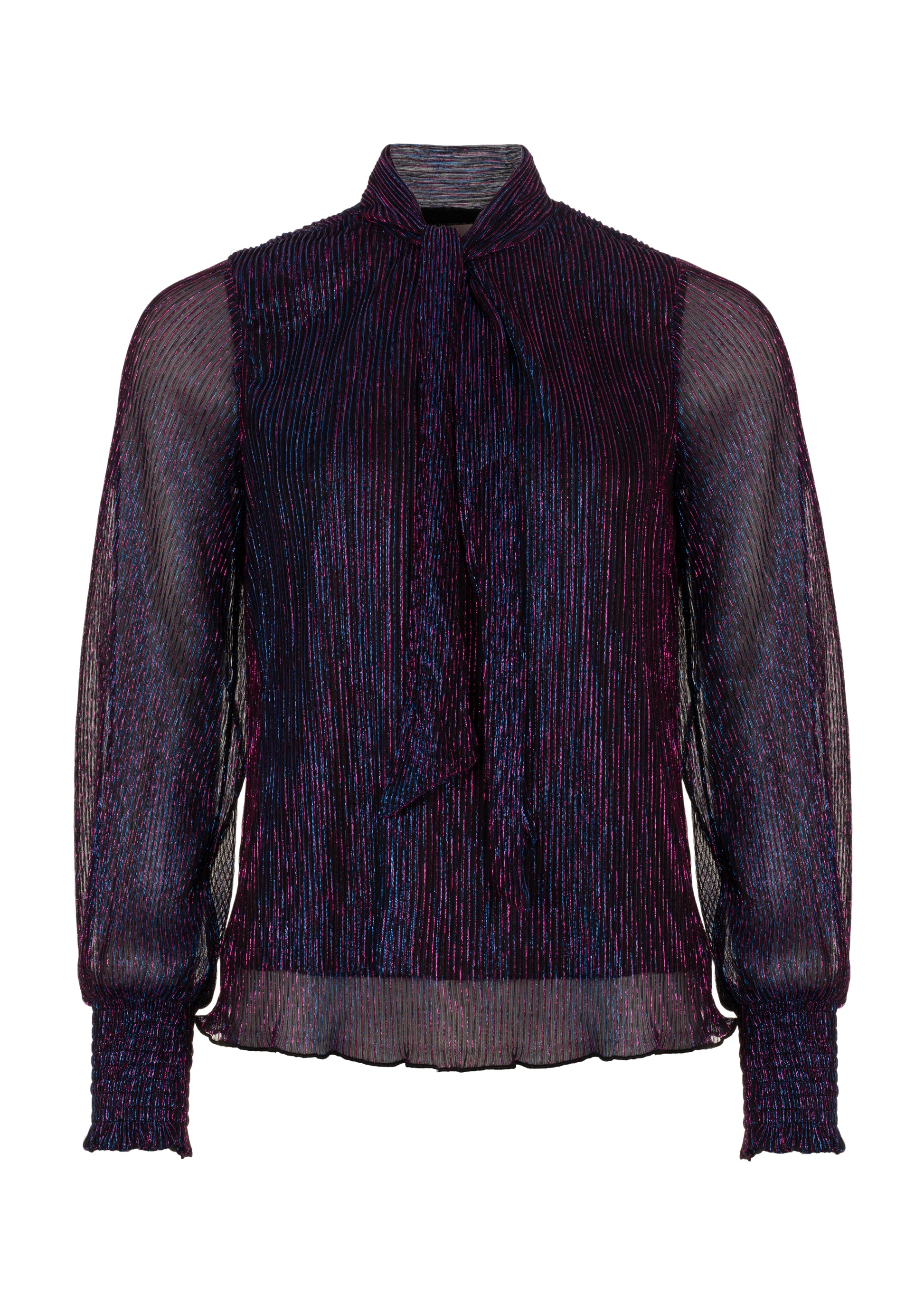 This elegant blouse is made from jersey plissé fabric with lurex, providing a subtle shine and a luxurious look. The blouse features smocked cuffs on the sleeves and has a stylish tie-neck for a refined appearance. Perfect for both formal and festive occasions.