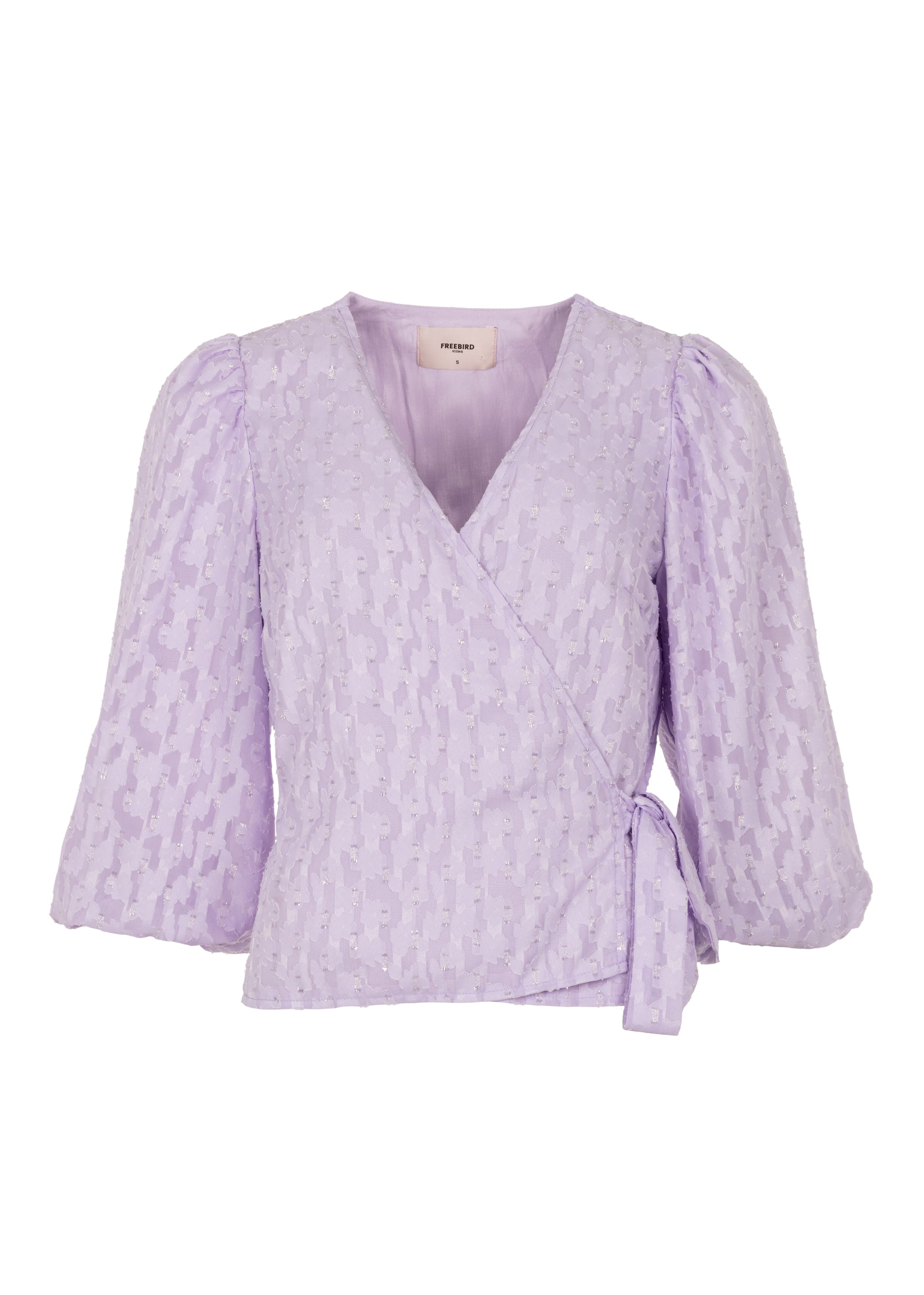 Add a touch of playfulness and elegance to your look with this stunning wrap blouse. Crafted from a unique textured fabric, this blouse offers a refined yet modern appeal. The wrap design and short sleeves create a feminine and comfortable fit.