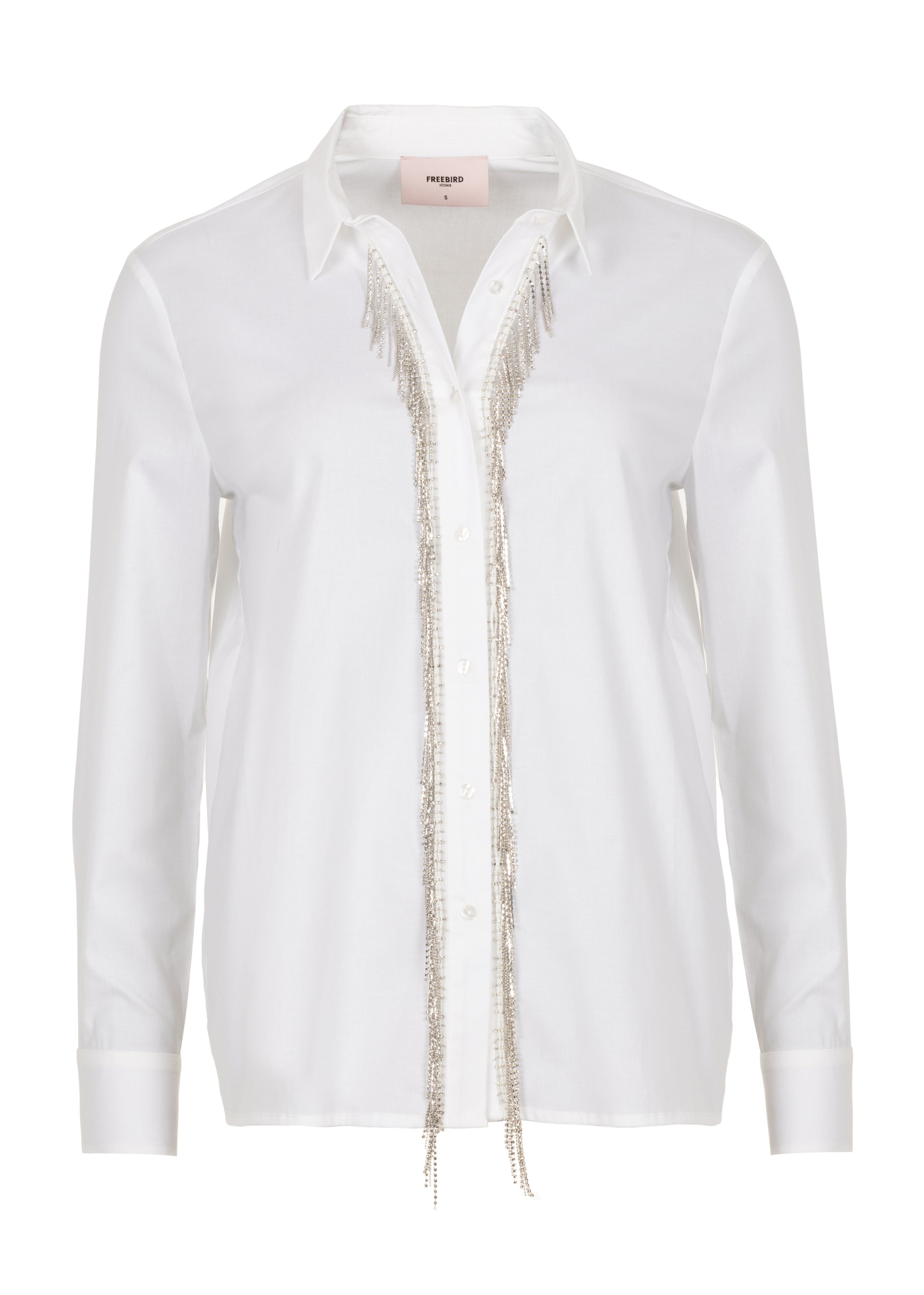 This long-sleeved blouse is crafted from a comfortable cotton poplin fabric that feels soft and holds its shape beautifully. The classic button-down design is given a glamorous upgrade with refined rhinestone detailing along the placket, adding an elegant and festive flair. Perfect for elevating your outfit — whether for a night out or to brighten up your everyday look.