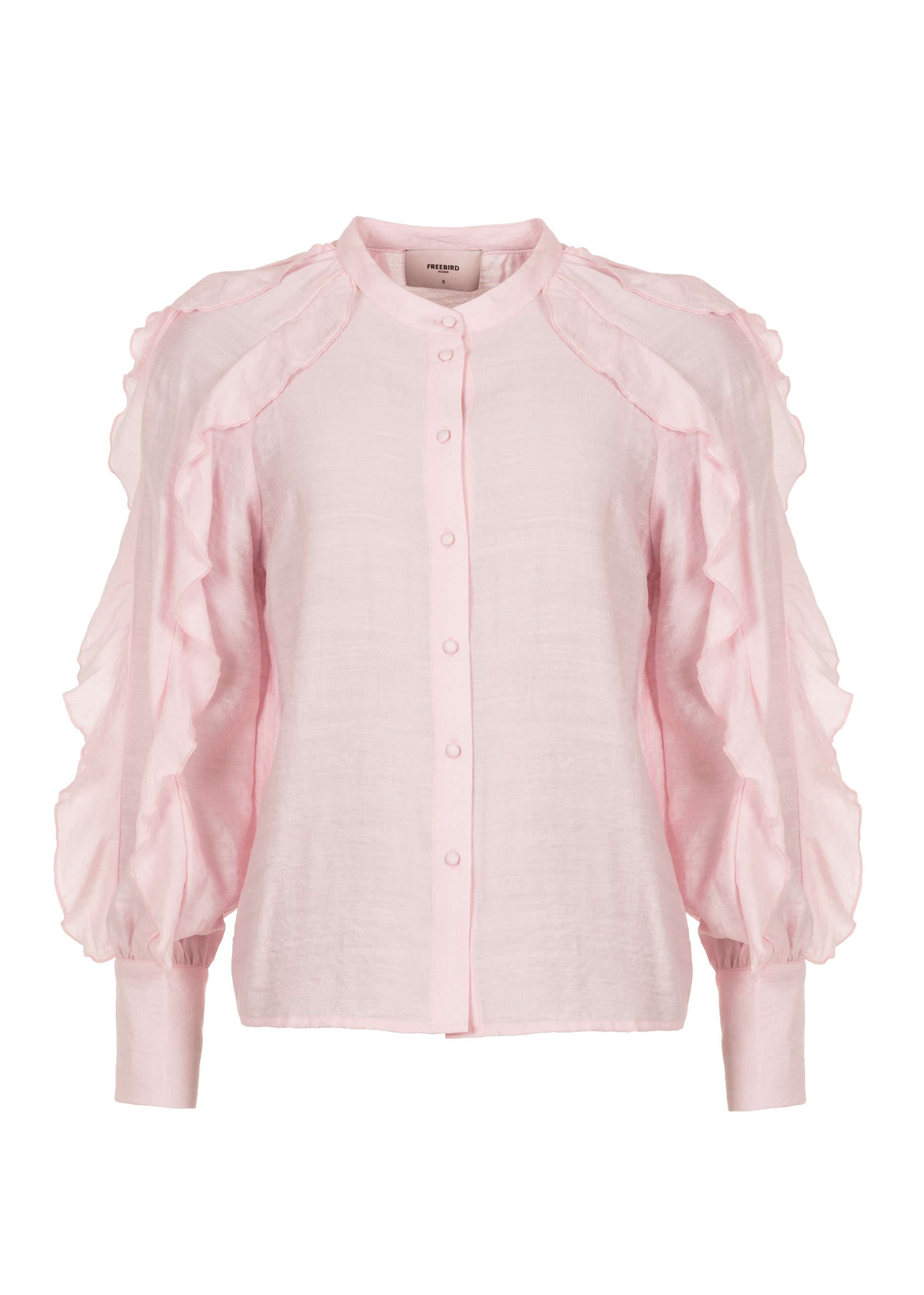 This elegant blouse in a soft pink hue is made from a flowing viscose fabric with a subtle texture. The blouse features wide sleeves and playful ruffle details, adding a feminine and sophisticated touch. Perfect for both everyday looks and special occasions.