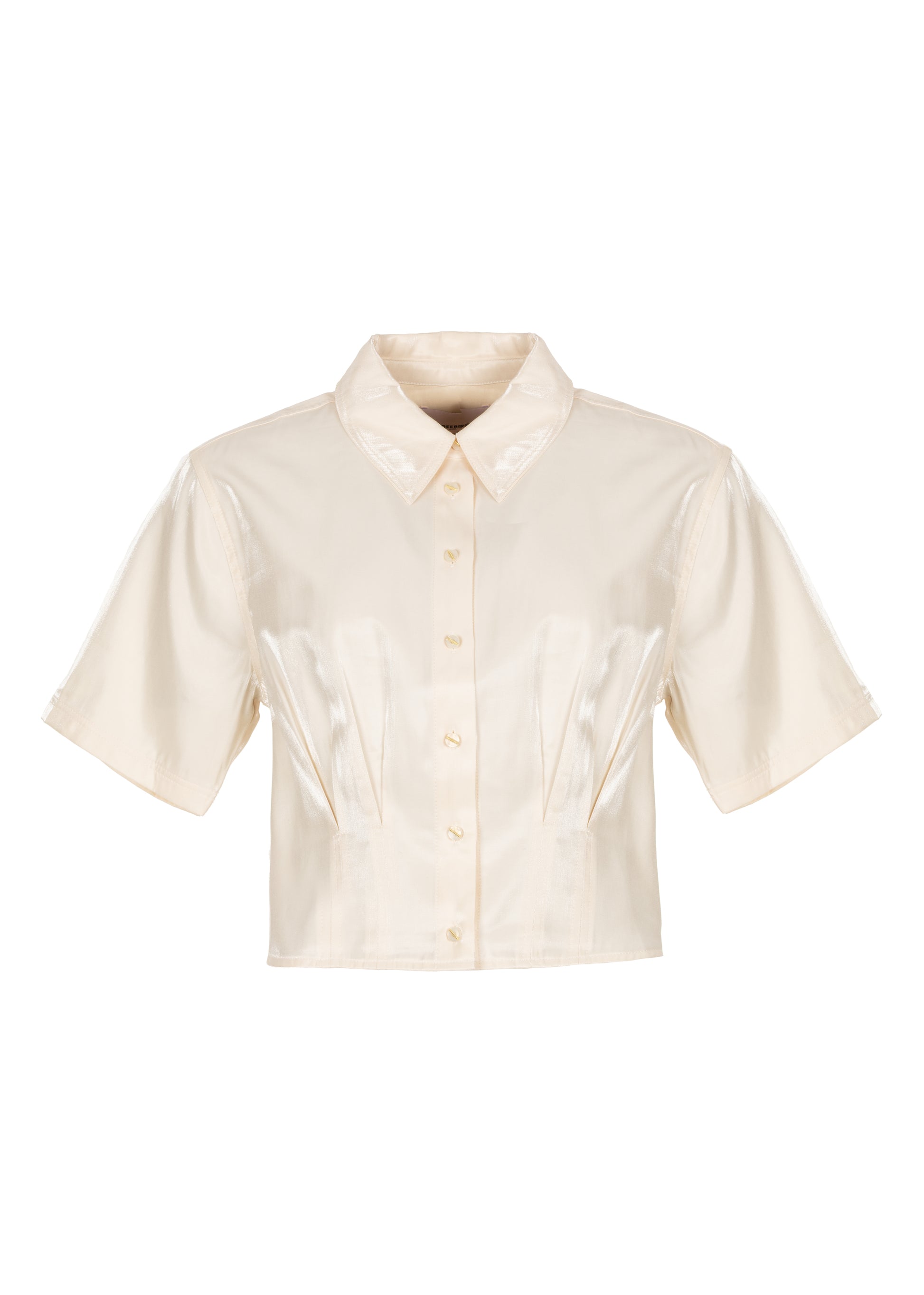This elegant blouse is crafted from a smooth woven fabric with a subtle sheen. The design is tailored towards the bottom, creating a flattering and feminine silhouette. Featuring a classic collar and short sleeves, this blouse has a timeless look that is perfect for both business and refined occasions.