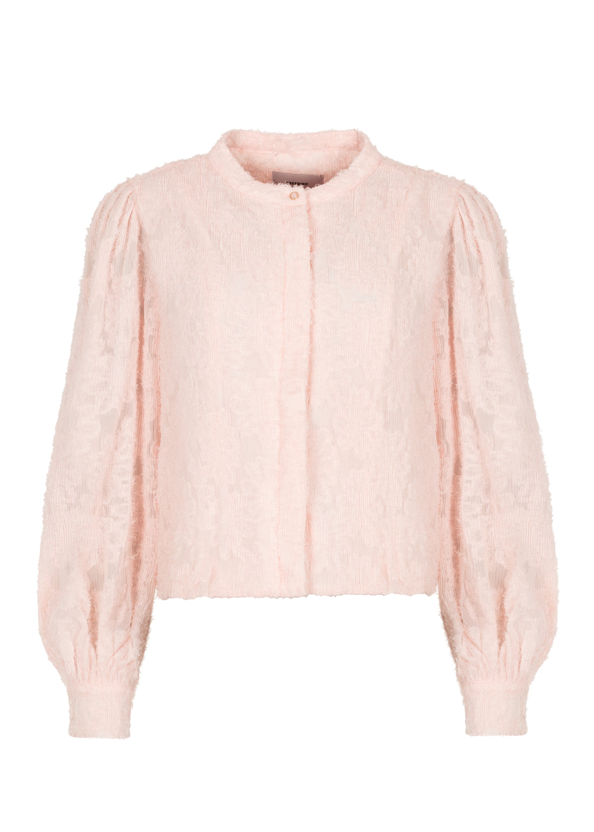 This blouse is made from a lightweight polyester fabric with a subtle, semi-sheer texture. The stand-up collar and voluminous sleeves with gathered shoulder details give the design a refined and feminine look. The straight, slightly cropped length makes this piece modern and elegant, perfect for both casual and dressed-up styling.