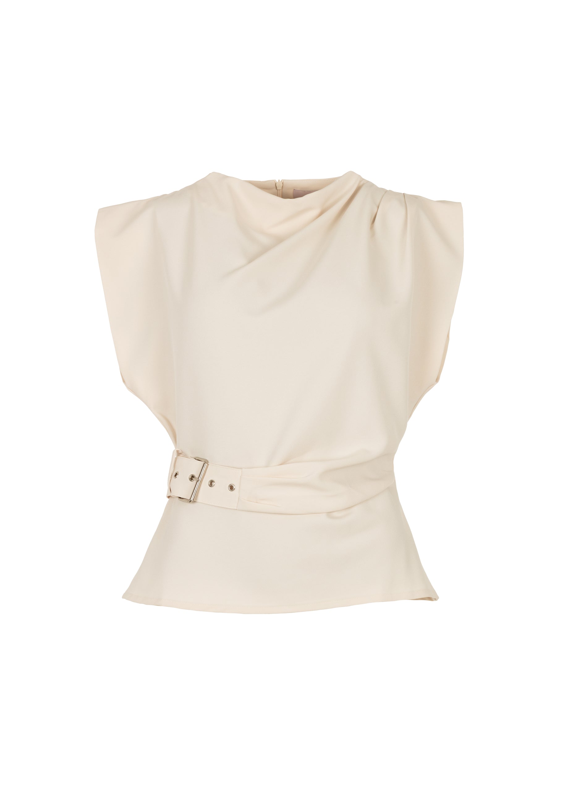 This chic top is made from a non-stretch jersey fabric, giving it a refined and structured look. The subtle shoulder shape and asymmetrical design create a modern silhouette, while the buckle detail at the waist beautifully highlights the figure. A sophisticated piece, ideal for evening wear or dressed-up occasions.