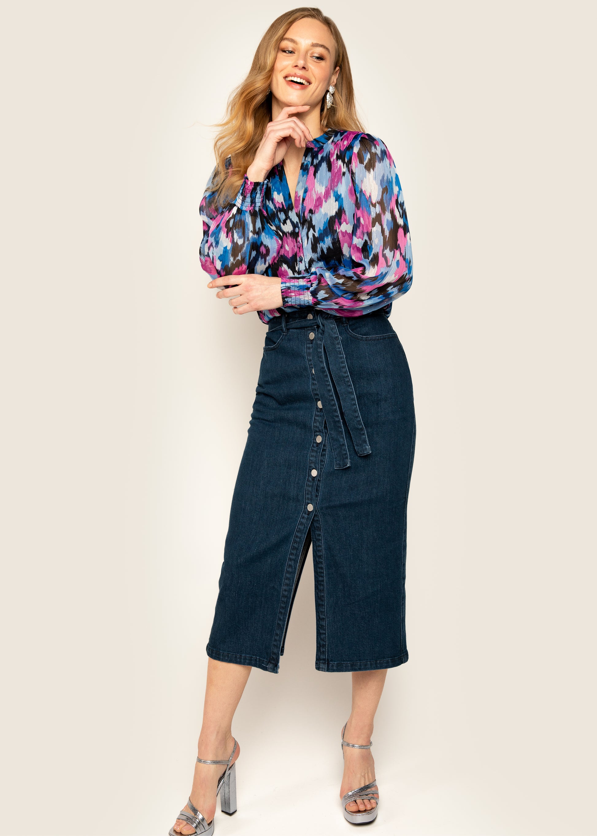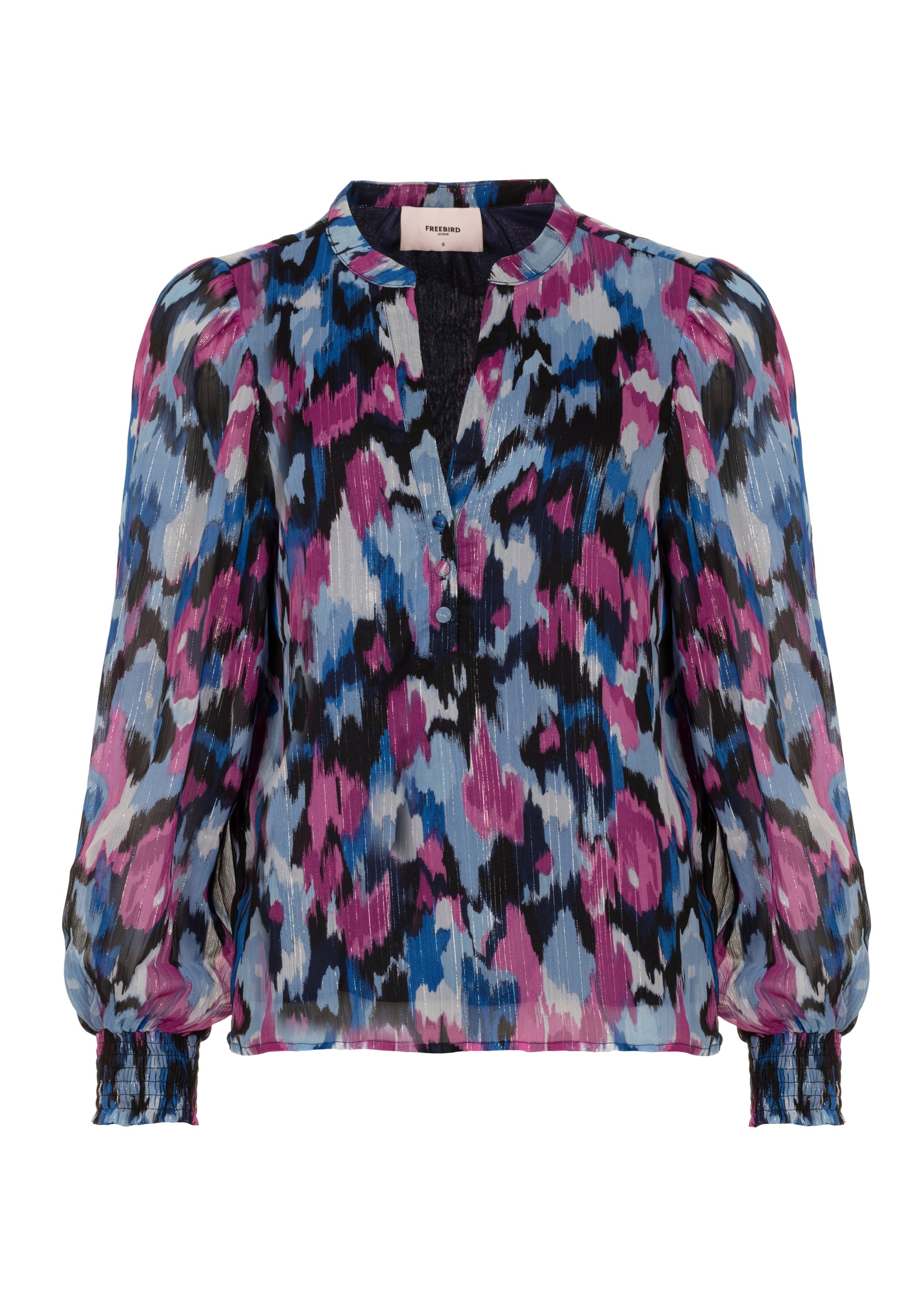 This stunning blouse is made of sheer fabric with a striking print and lurex details, creating an elegant look. Perfect for various occasions and easy to pair with other items in your wardrobe.
