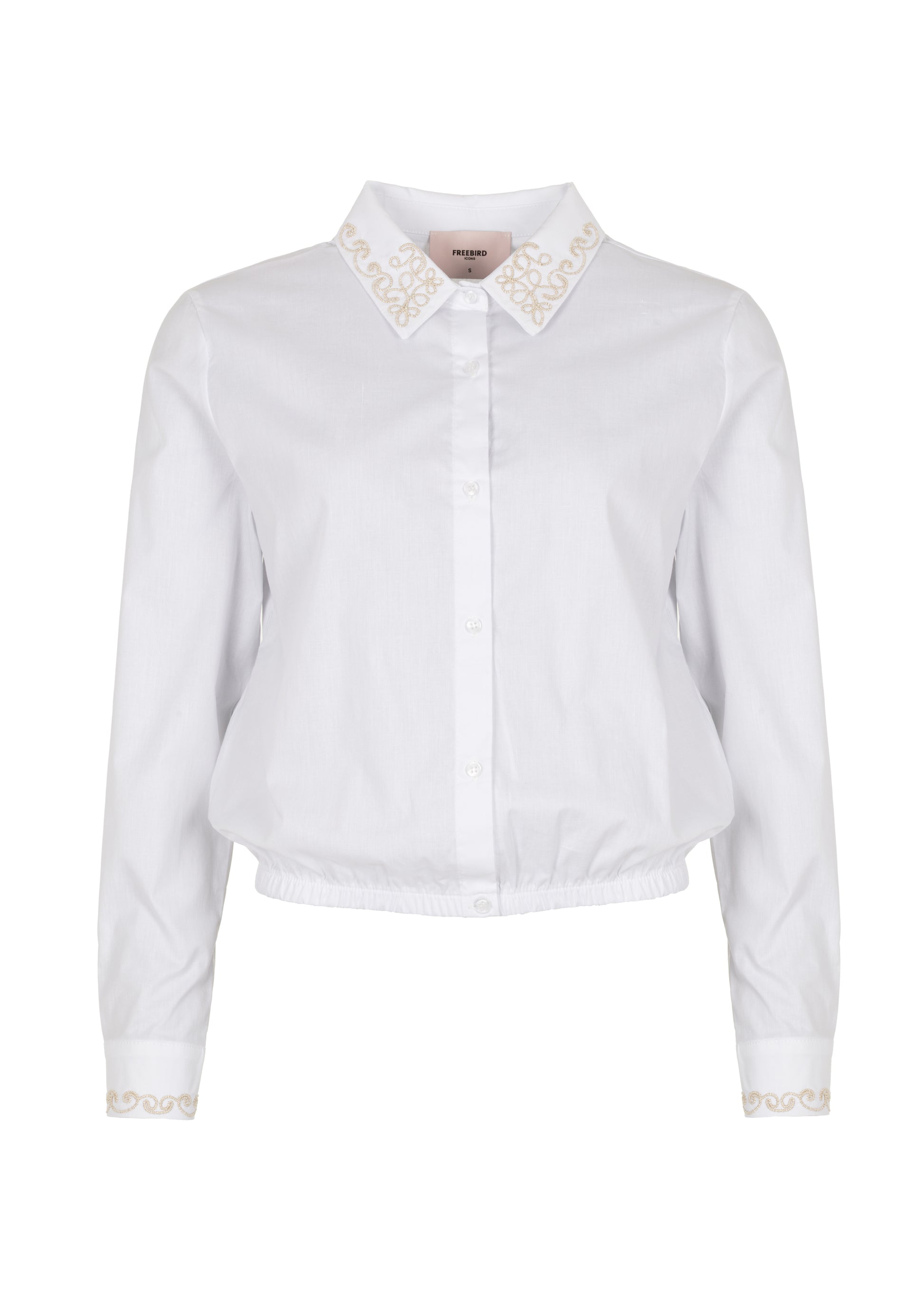 A fresh, feminine blouse with refined embroidered details. Crafted from a cotton poplin quality, this blouse offers a light and comfortable feel. The delicate embroidery on the collar adds a subtle decorative touch, while the elasticated band ensures a flattering and comfortable fit. A versatile piece that pairs effortlessly with tailored trousers, denim or skirts, perfect for both everyday wear and more polished looks.