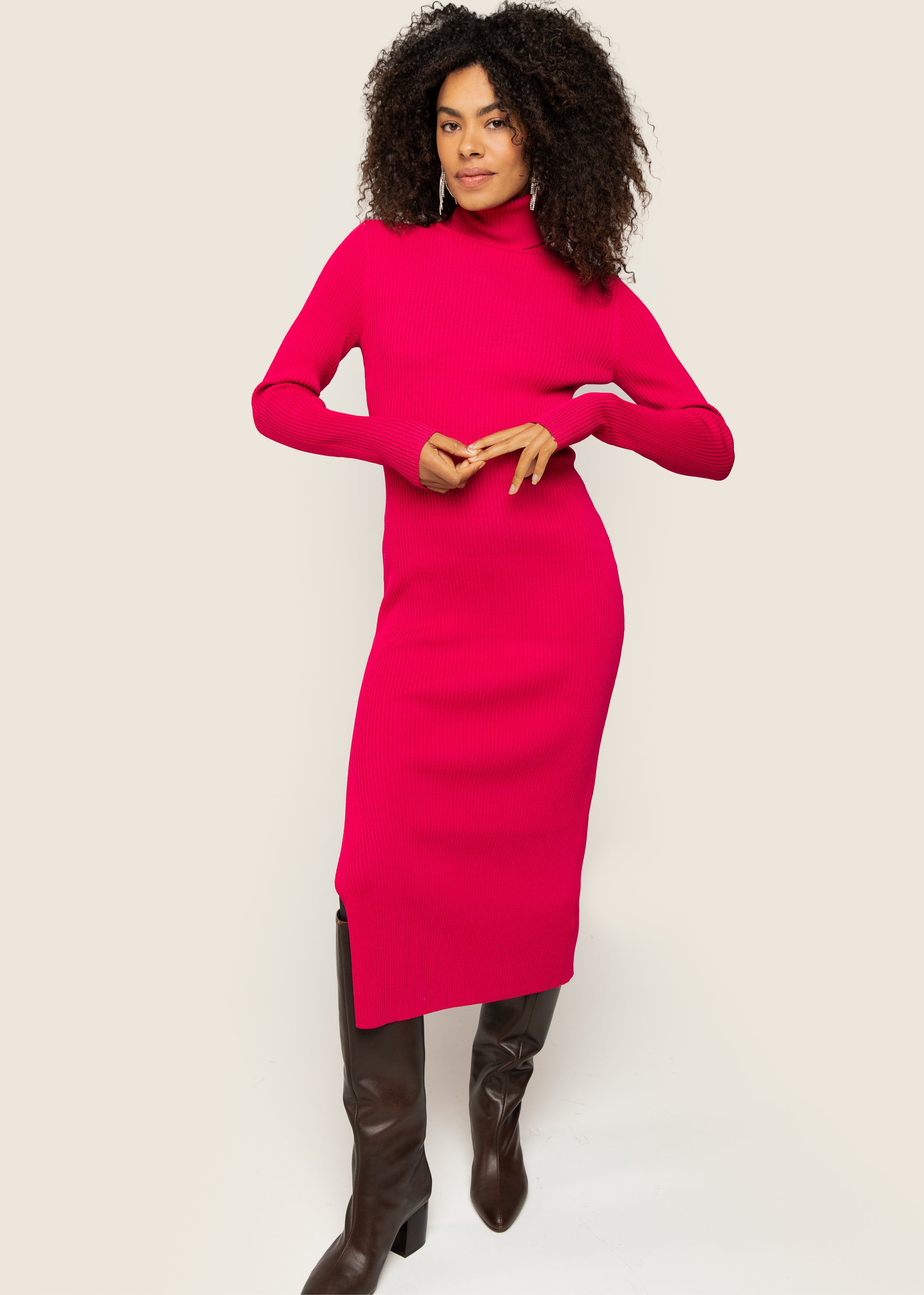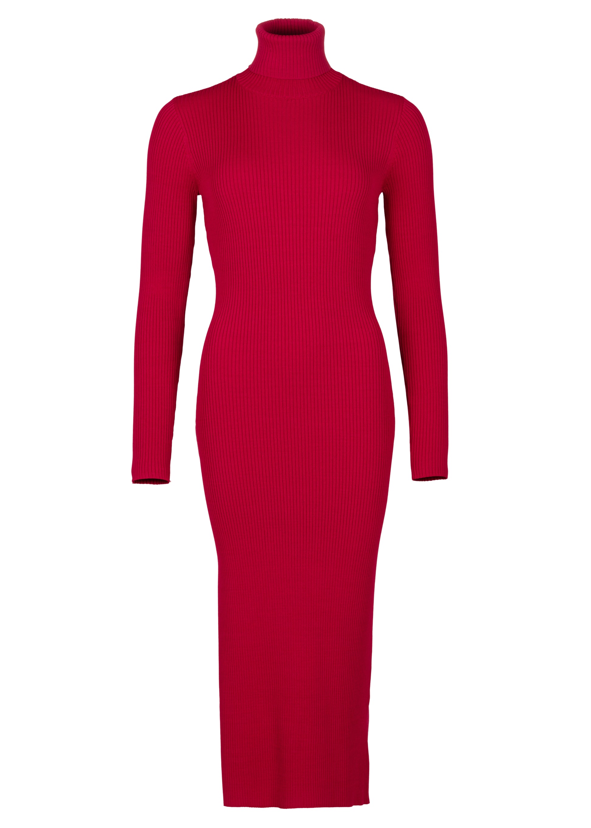 This elegant knitted dress in a heavy rib-knit fabric is a stylish must-have for your wardrobe. The fitted silhouette and turtle neck give the dress a modern and sophisticated look, perfect for both casual and formal occasions.