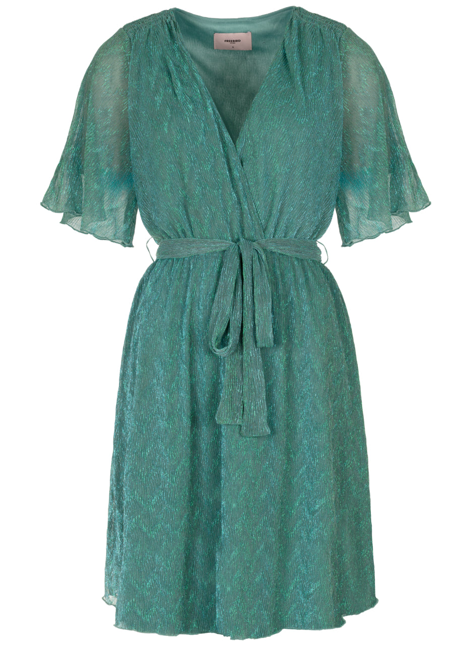 This short dress exudes pure elegance, thanks to the festive lurex plissé fabric with stretch, which beautifully catches the light. The design features a flattering wrap V-neckline and a tie belt at the waist, accentuating your silhouette perfectly.
