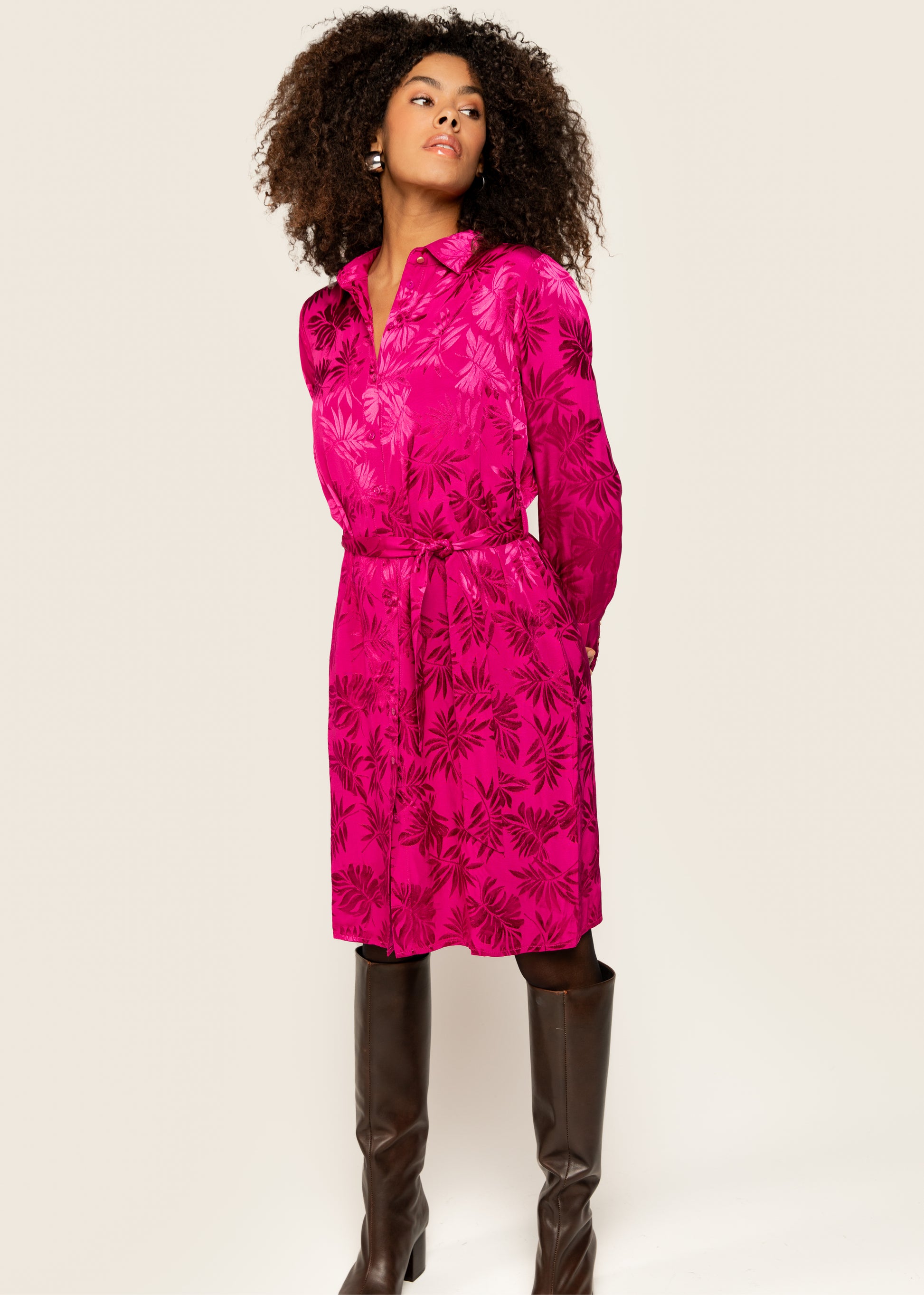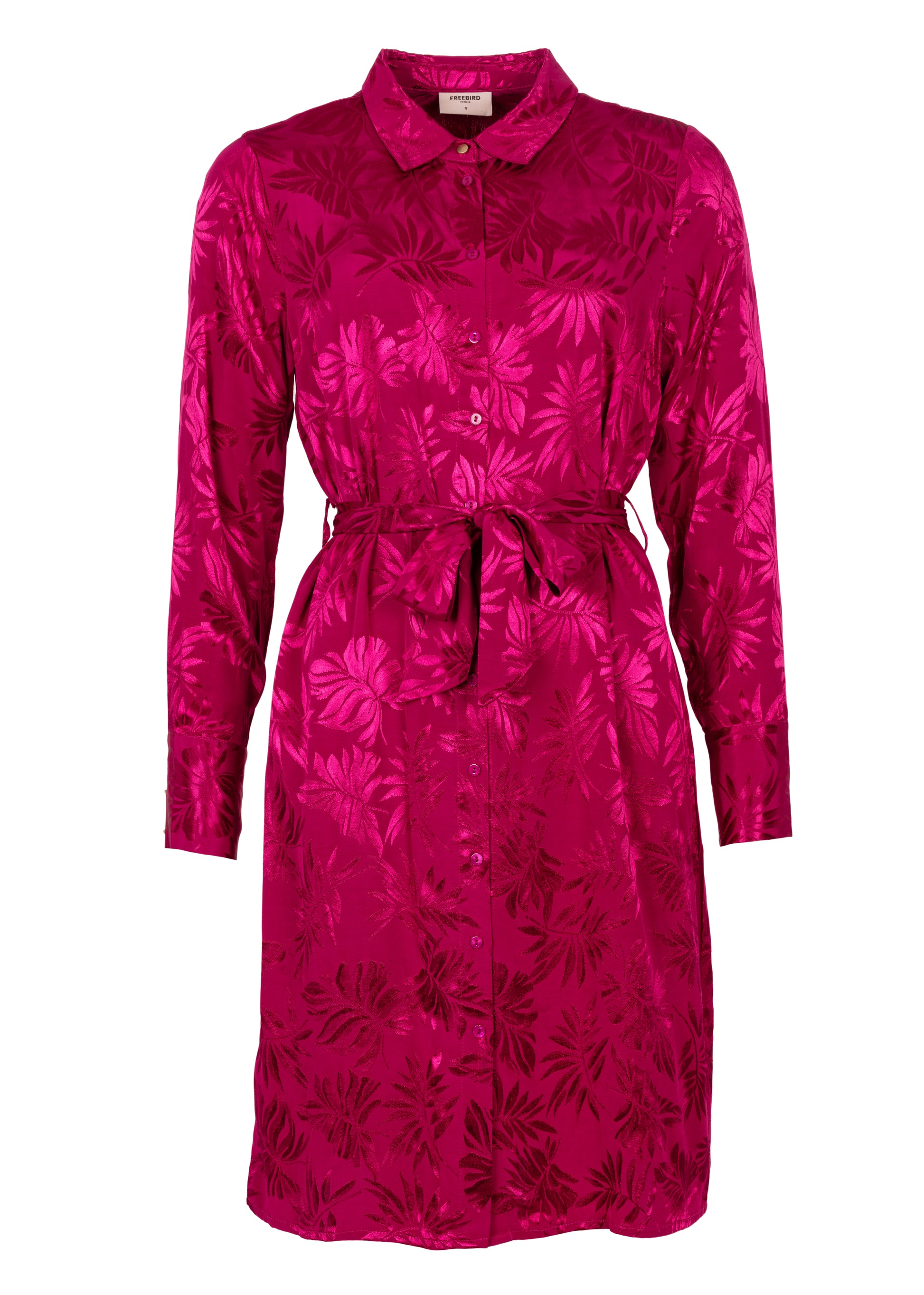This beautiful shirt dress in the color Raspberry Rose is made from a shiny fabric with a subtle floral jacquard pattern. The dress features an elegant waist strap to accentuate your waist, offering a refined and stylish look for any occasion.