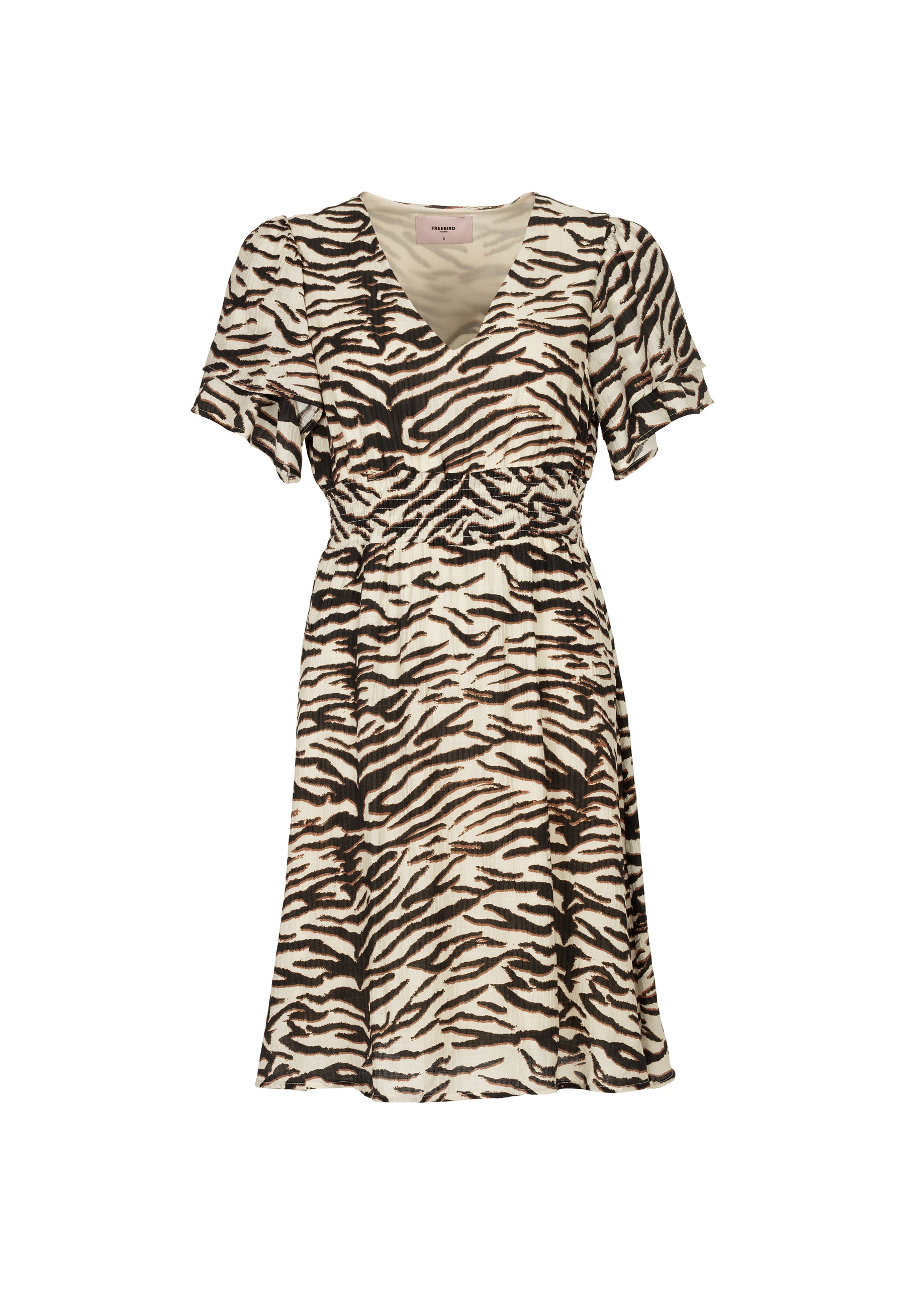 This elegant long dress is crafted from a woven fabric with a subtle hammered texture, creating a refined and airy look. The feminine V-neckline and playful sleeves add a soft, romantic touch. The smocked waistband defines the waist beautifully, resulting in a flattering silhouette. A stylish piece, perfect for summer days as well as special occasions.
