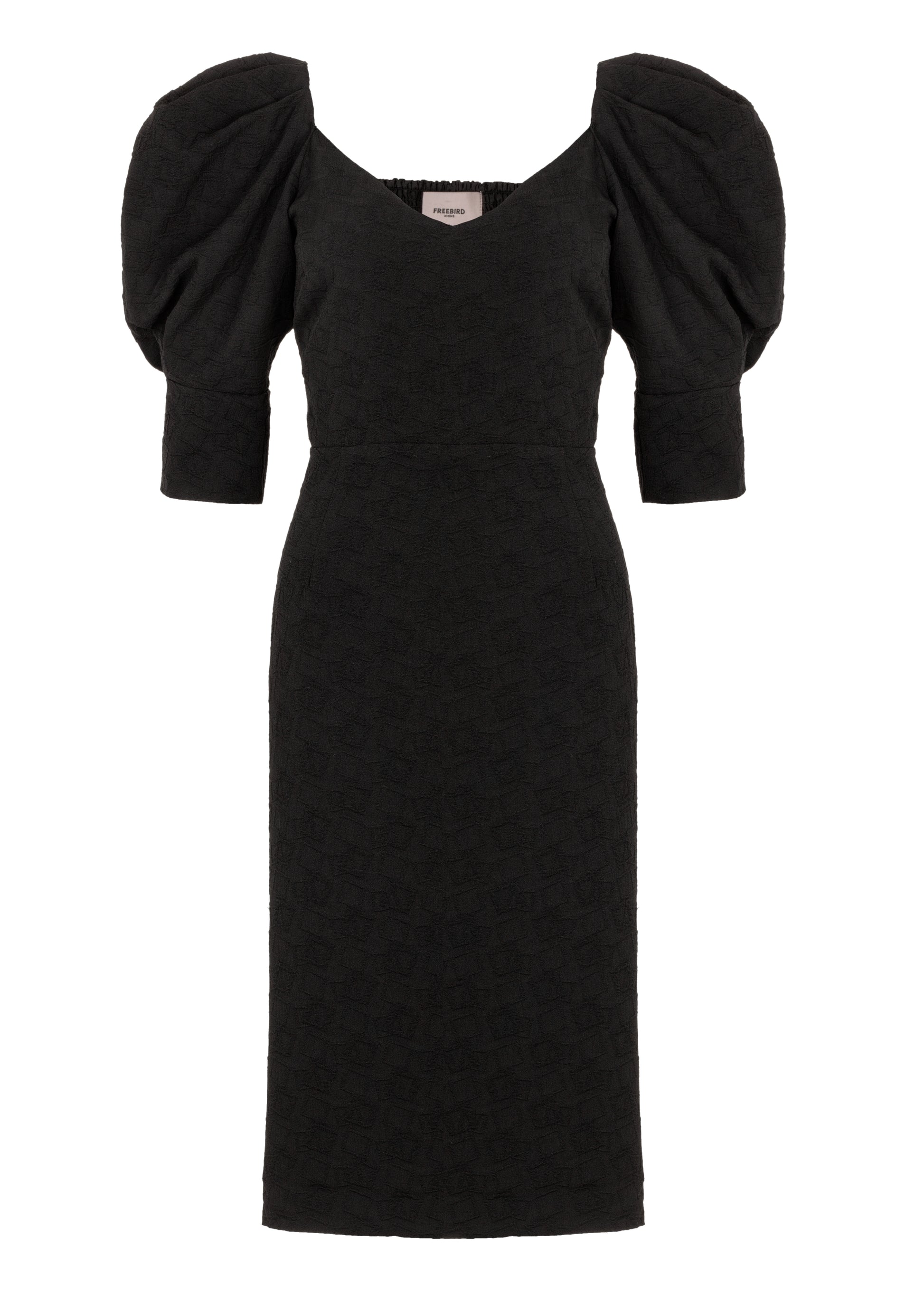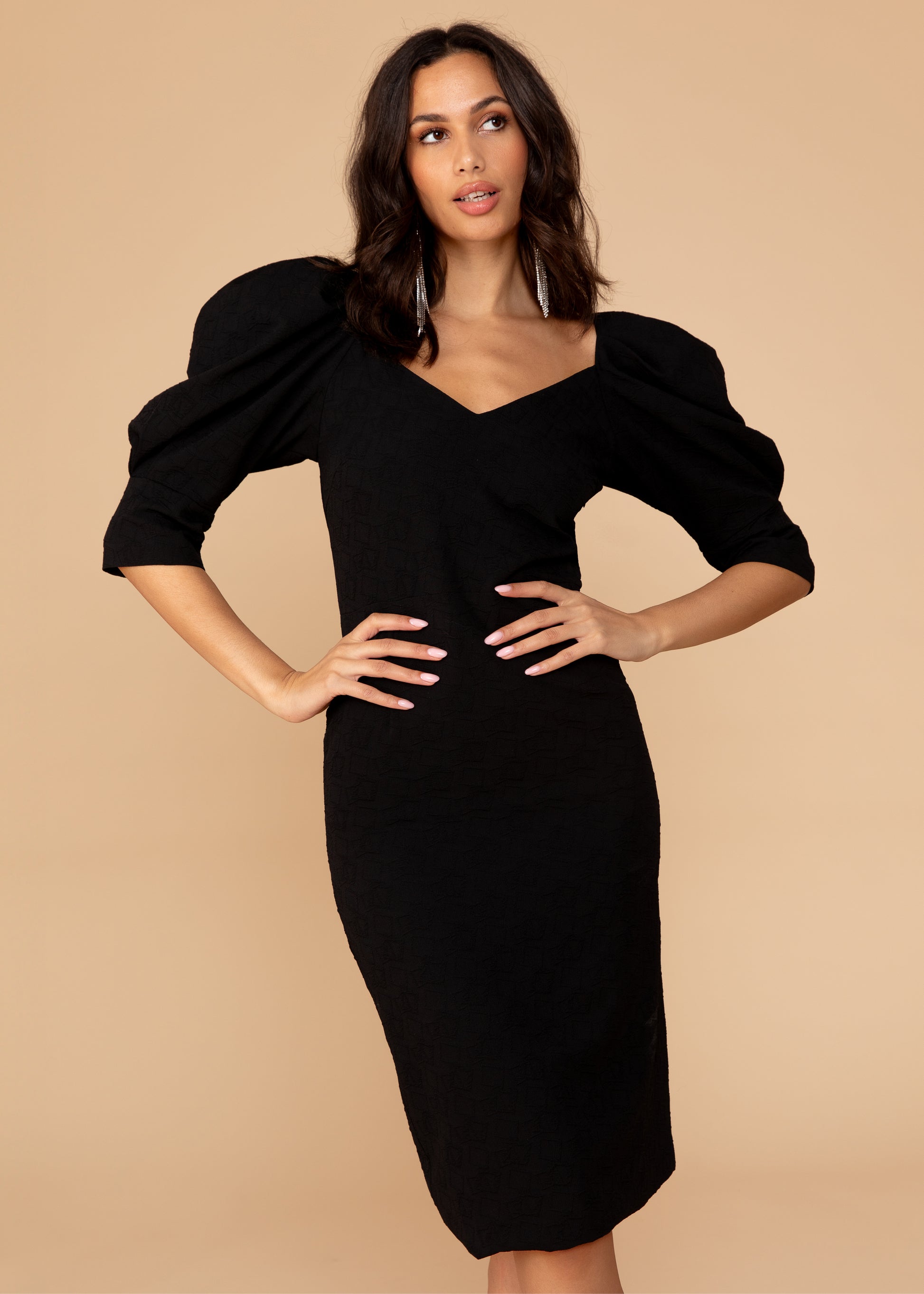 This elegant dress is made from a structured fabric with a bit of stretch for a comfortable fit. The dress falls just below the knee and features striking, beautiful puff sleeves, creating a refined and stylish look.