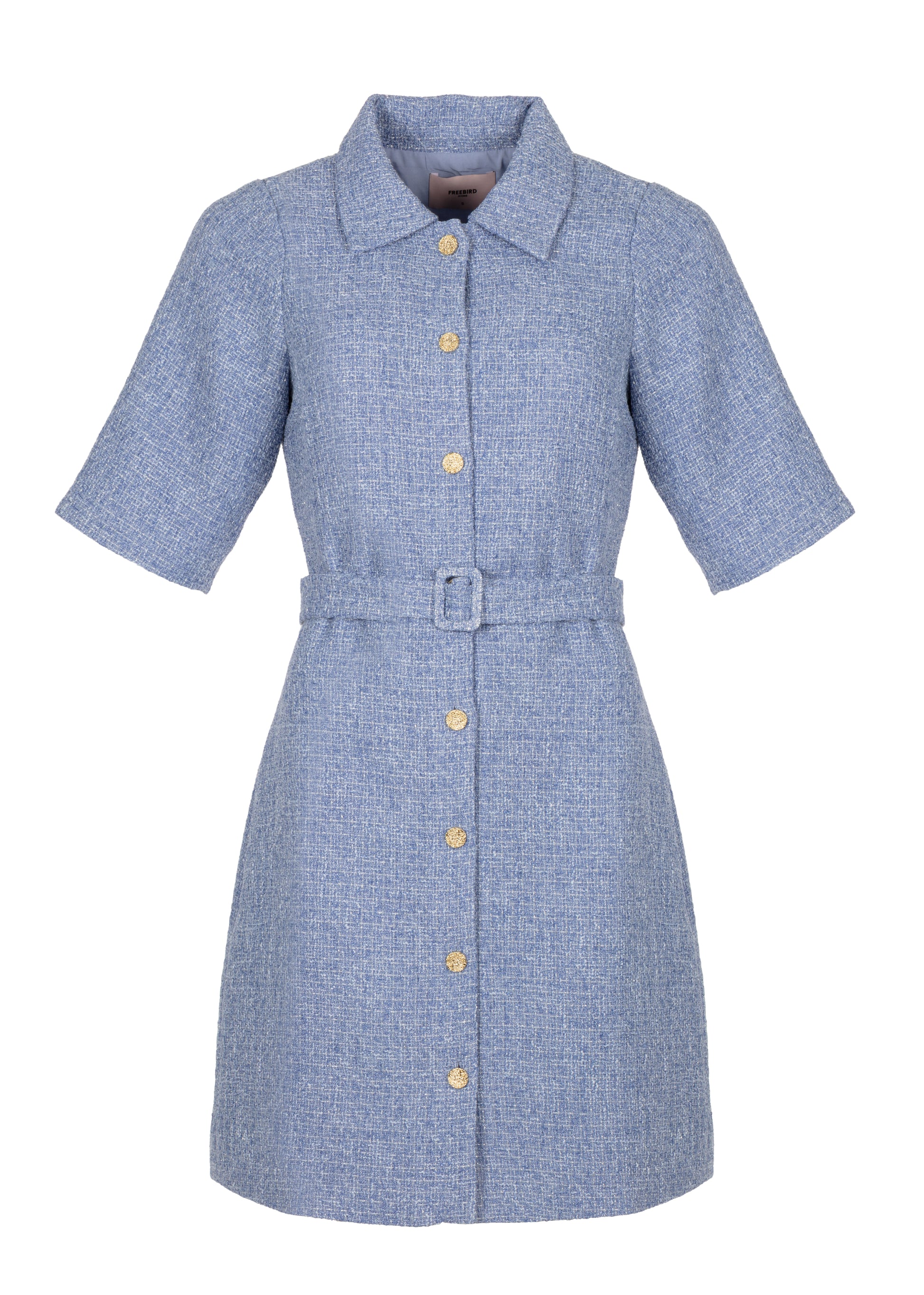 An elegant dress with a refined and timeless appeal. This straight-fit dress is crafted from a woven bouclé fabric with subtle sequins, adding a soft shimmer and a luxurious feel. The short sleeves and classic collar create a modern yet chic look. The matching belt defines the waist for a flattering silhouette.
