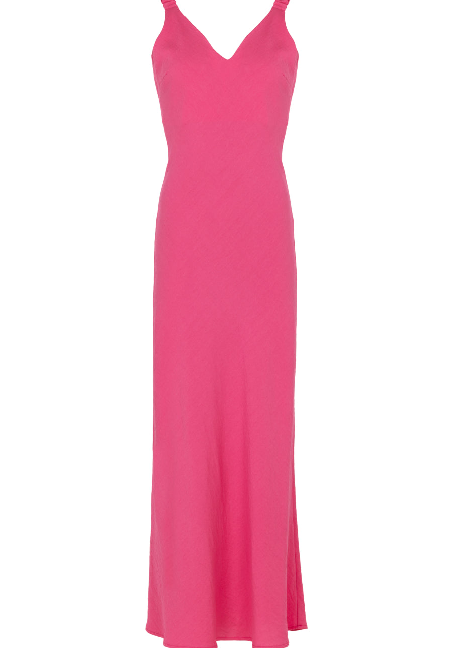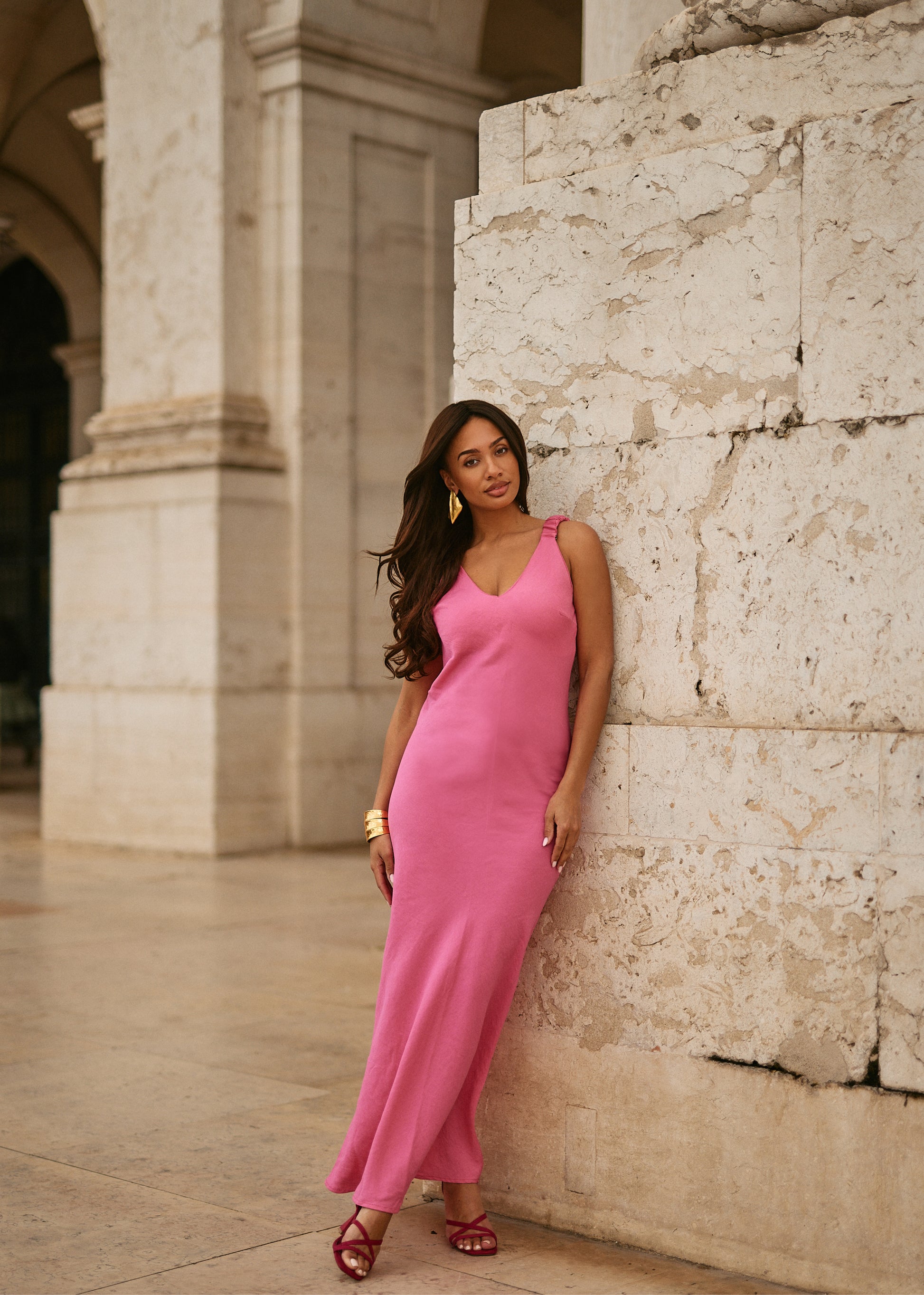 - Pink sleeveless maxi dress with a fitted silhouette.