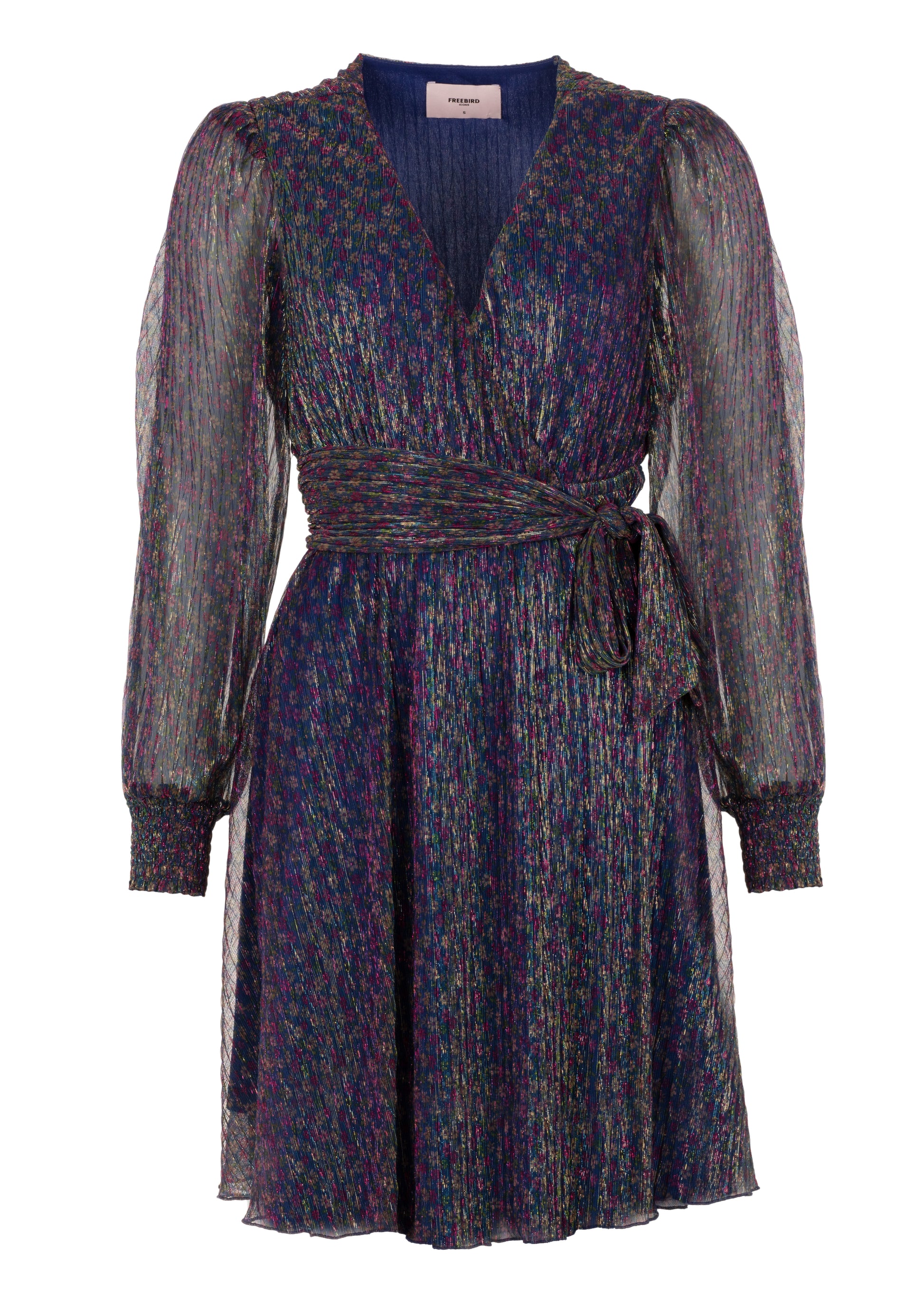 This beautiful short wrap dress is made of pleated lurex fabric with a subtle print. The dress features a flattering waistband that ensures a beautiful fit.