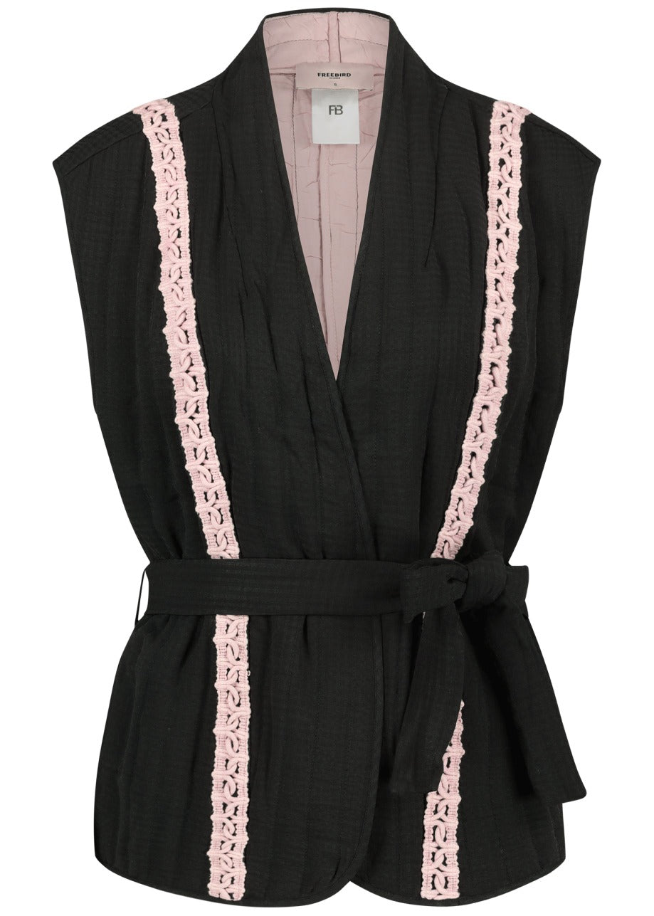 - The black sleeveless gilet features pink details.