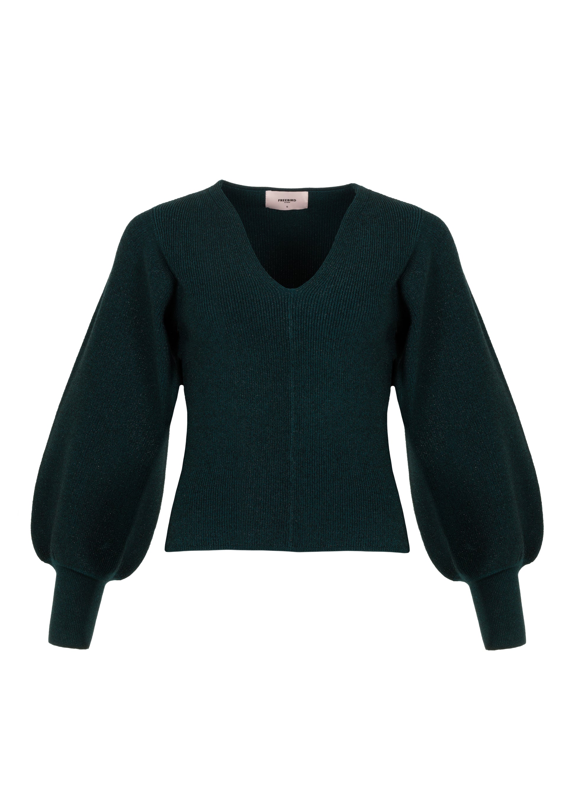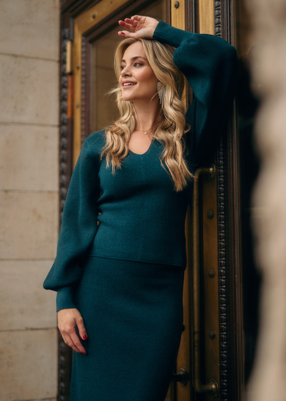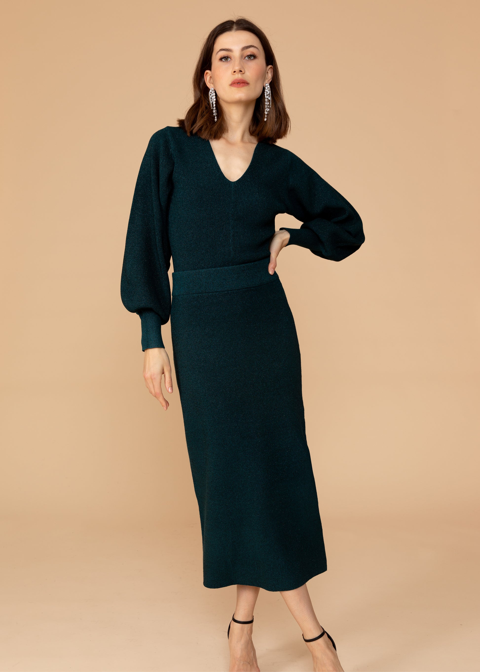 This elegant knitted top is made from a luxurious blend of viscose and lurex yarn, giving it a subtle shine. The top features long sleeves and a flattering V-neck, making it both stylish and comfortable. Pair the sweater with the Stefanie skirt.