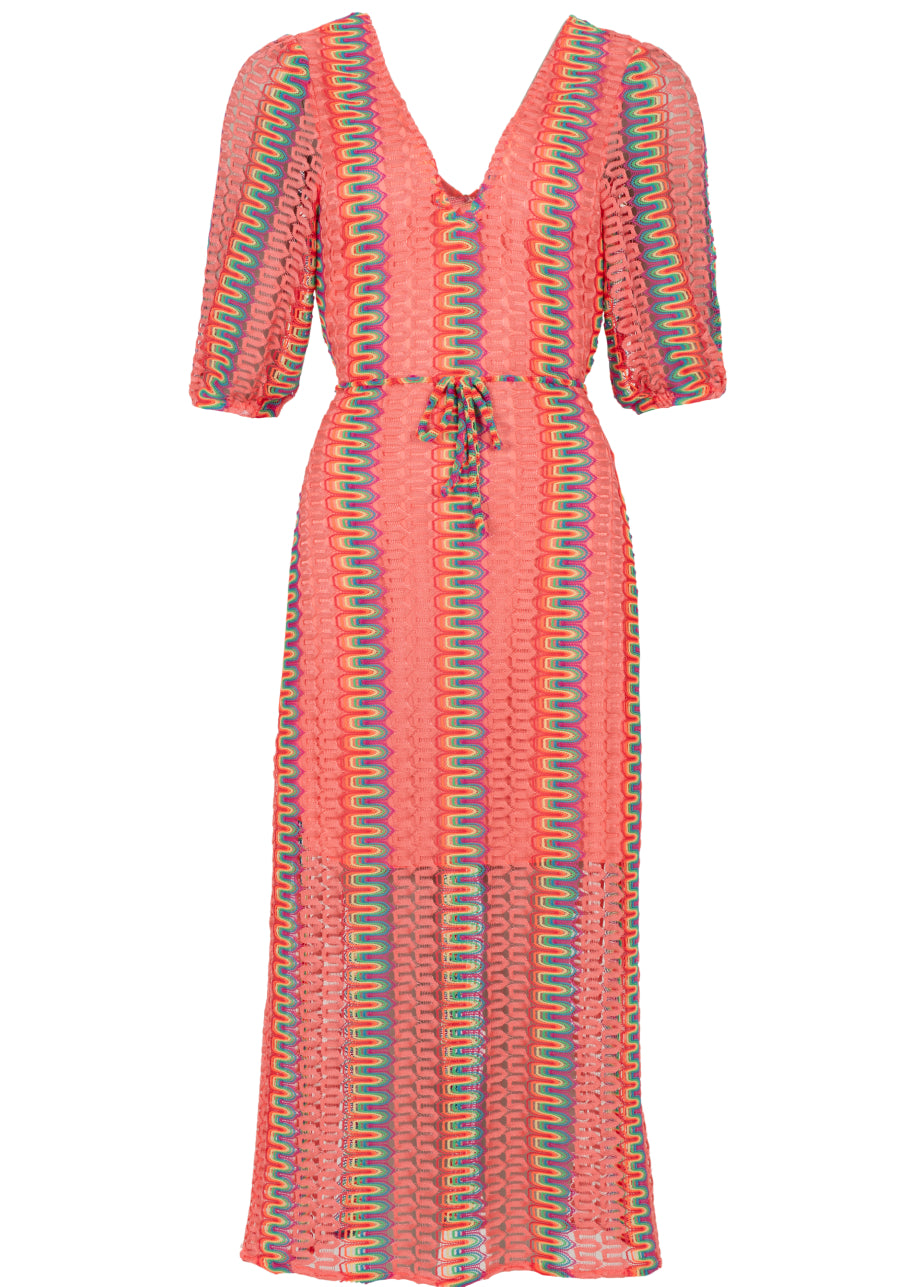 - The dress features a V-neck, three-quarter sleeves, and a rainbow print.