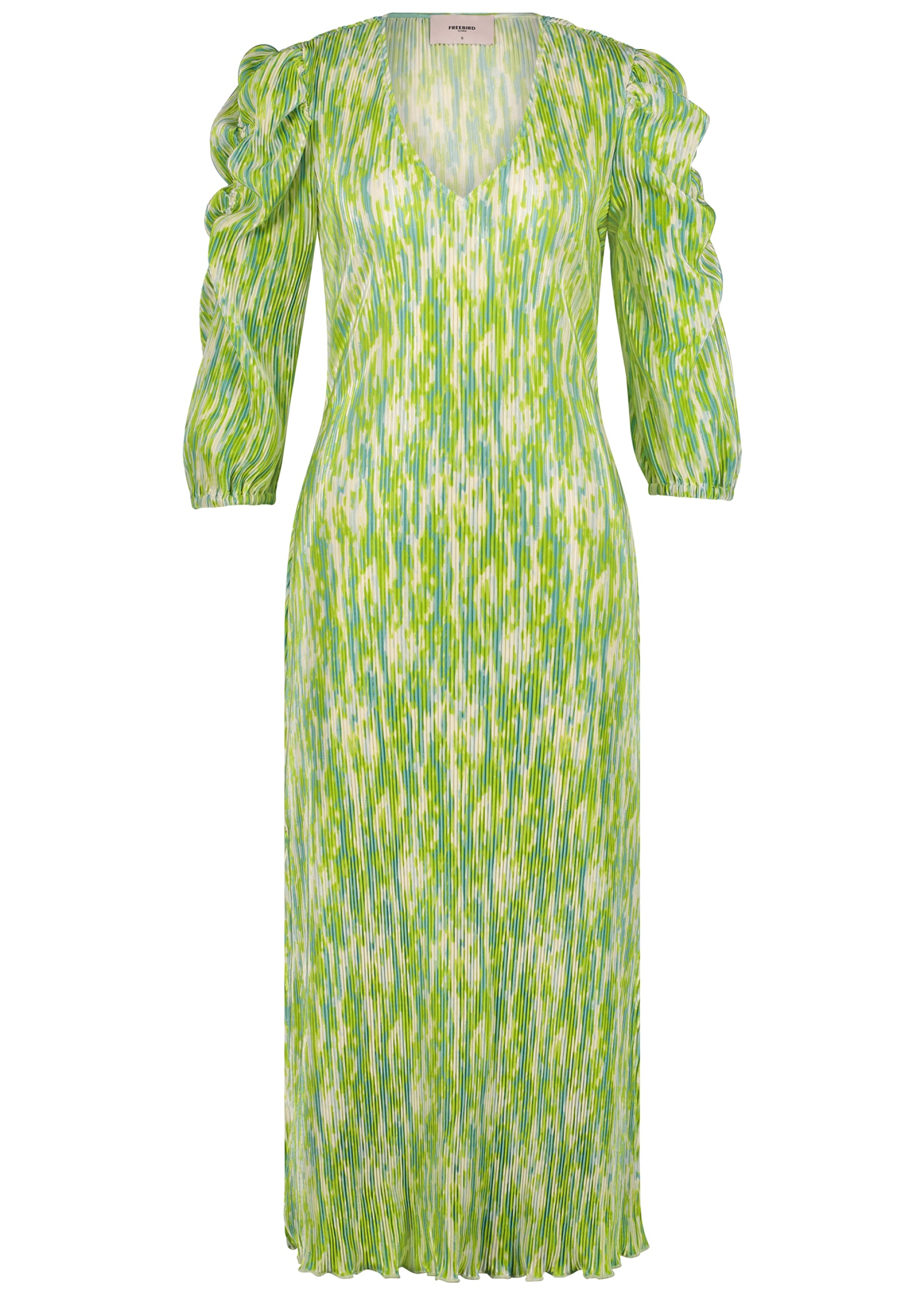 - Green fitted dress with short sleeves, a V-neck, and a snug fit.