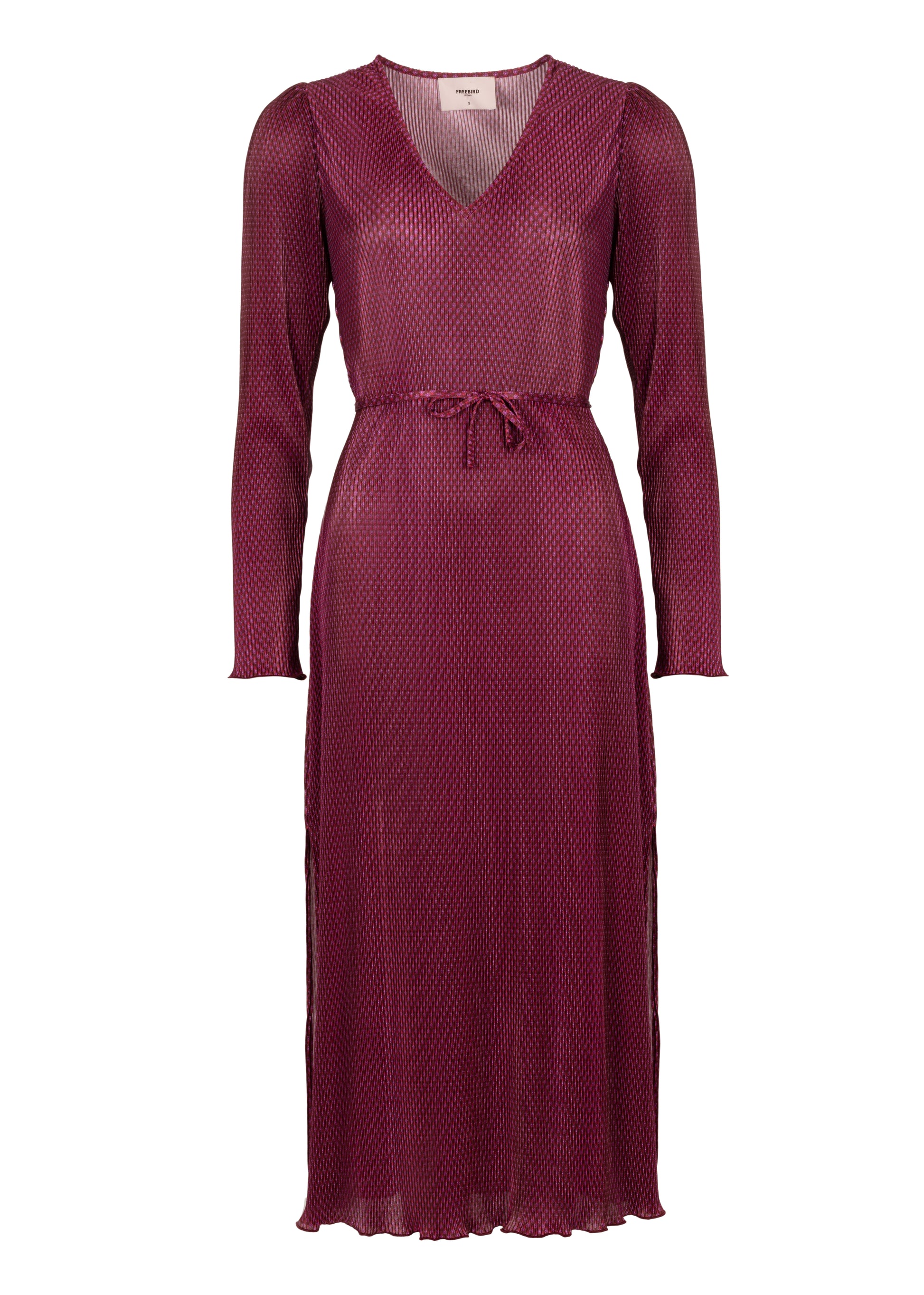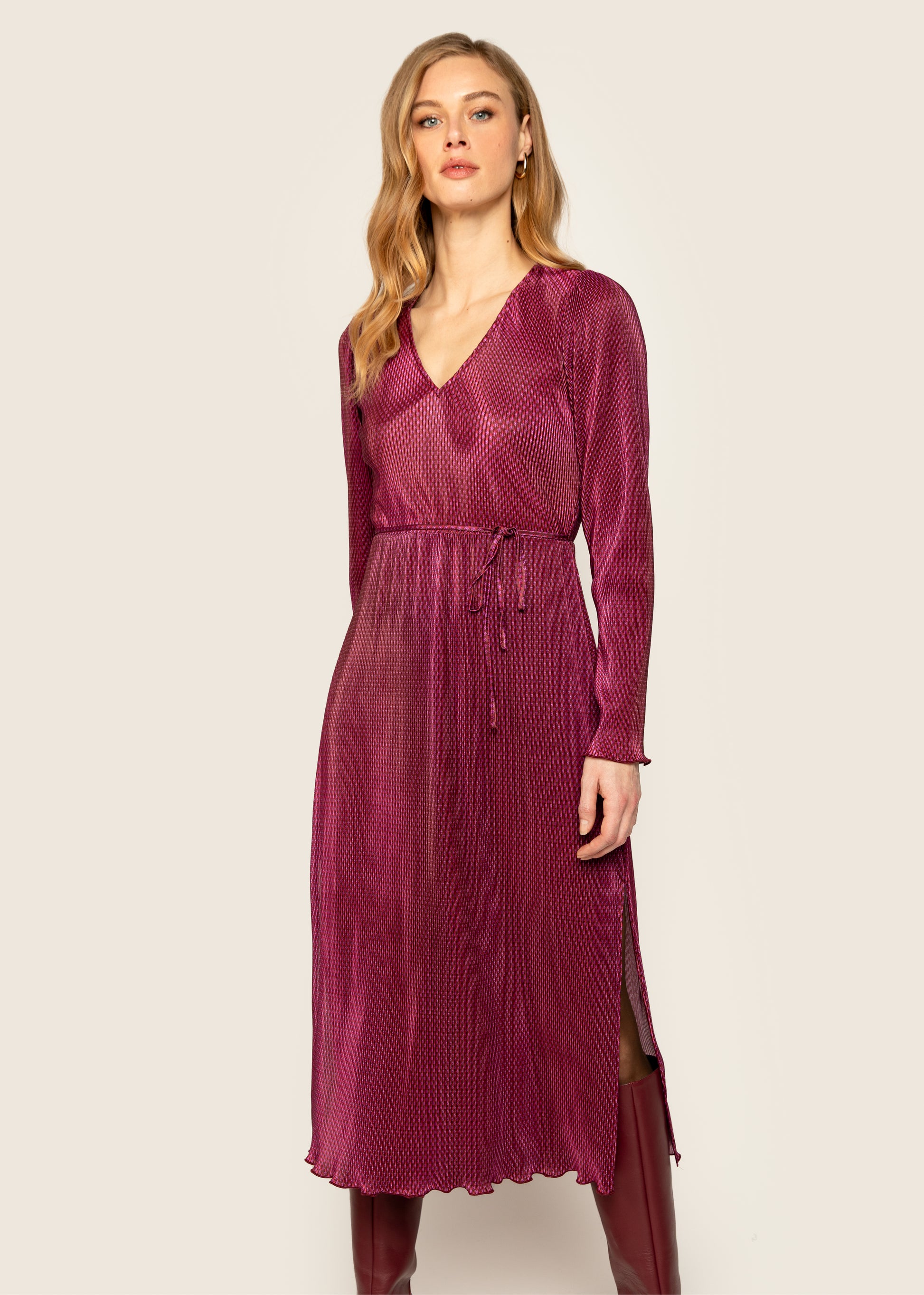 This elegant long pleated dress in the color Multi Pink is a refined choice for various occasions. The dress features a flattering V-neck and comes with waist ties for a feminine look.