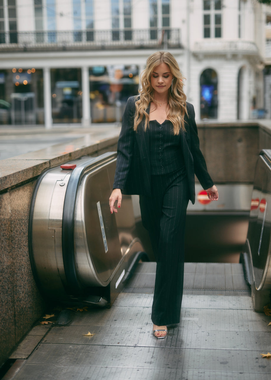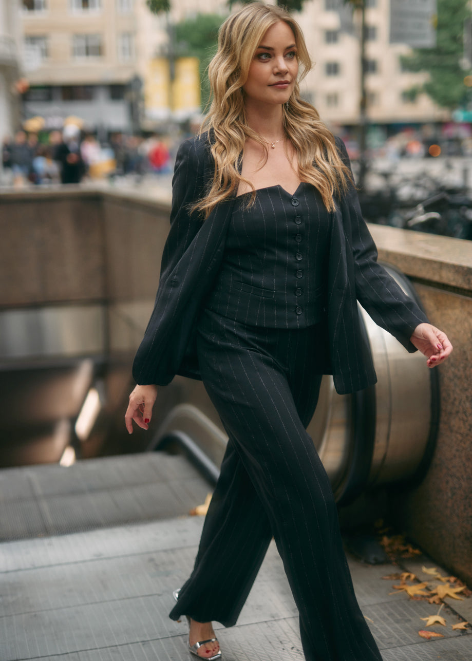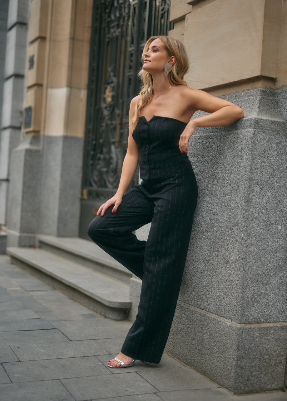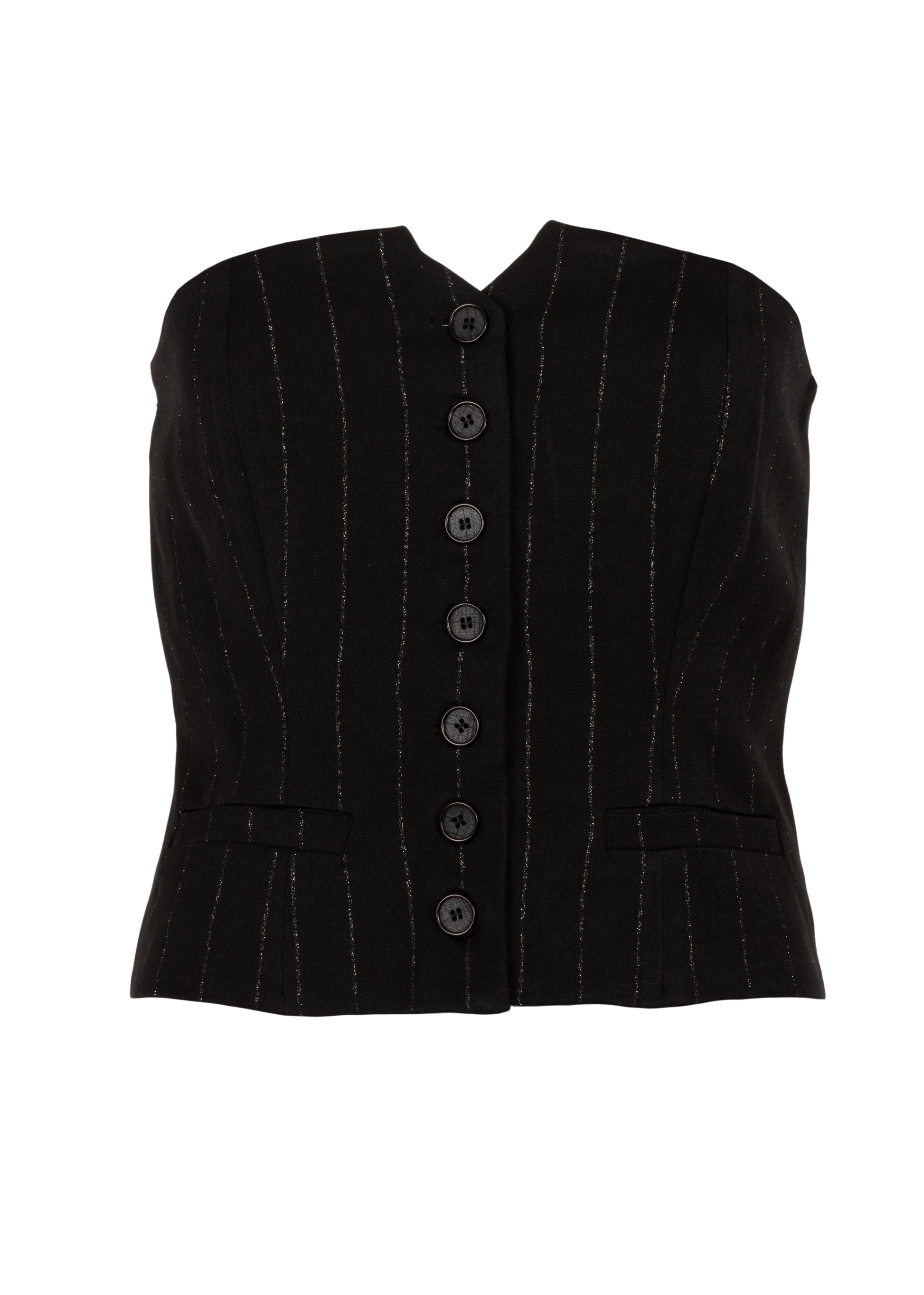 This stylish strapless corset has an elegant look. The corset features a button closure at the front and is equipped with silicone tape at the top to ensure it stays in place.