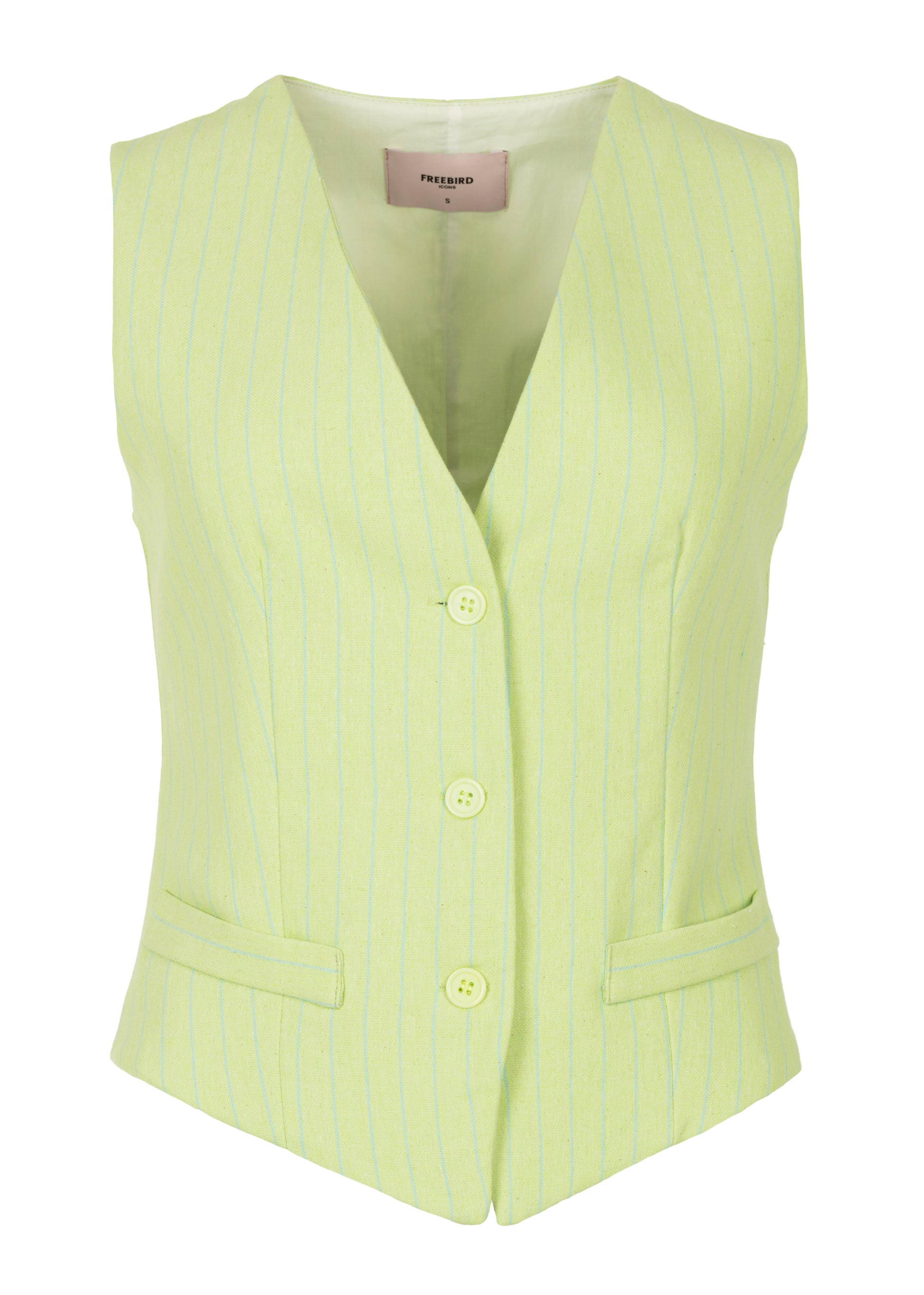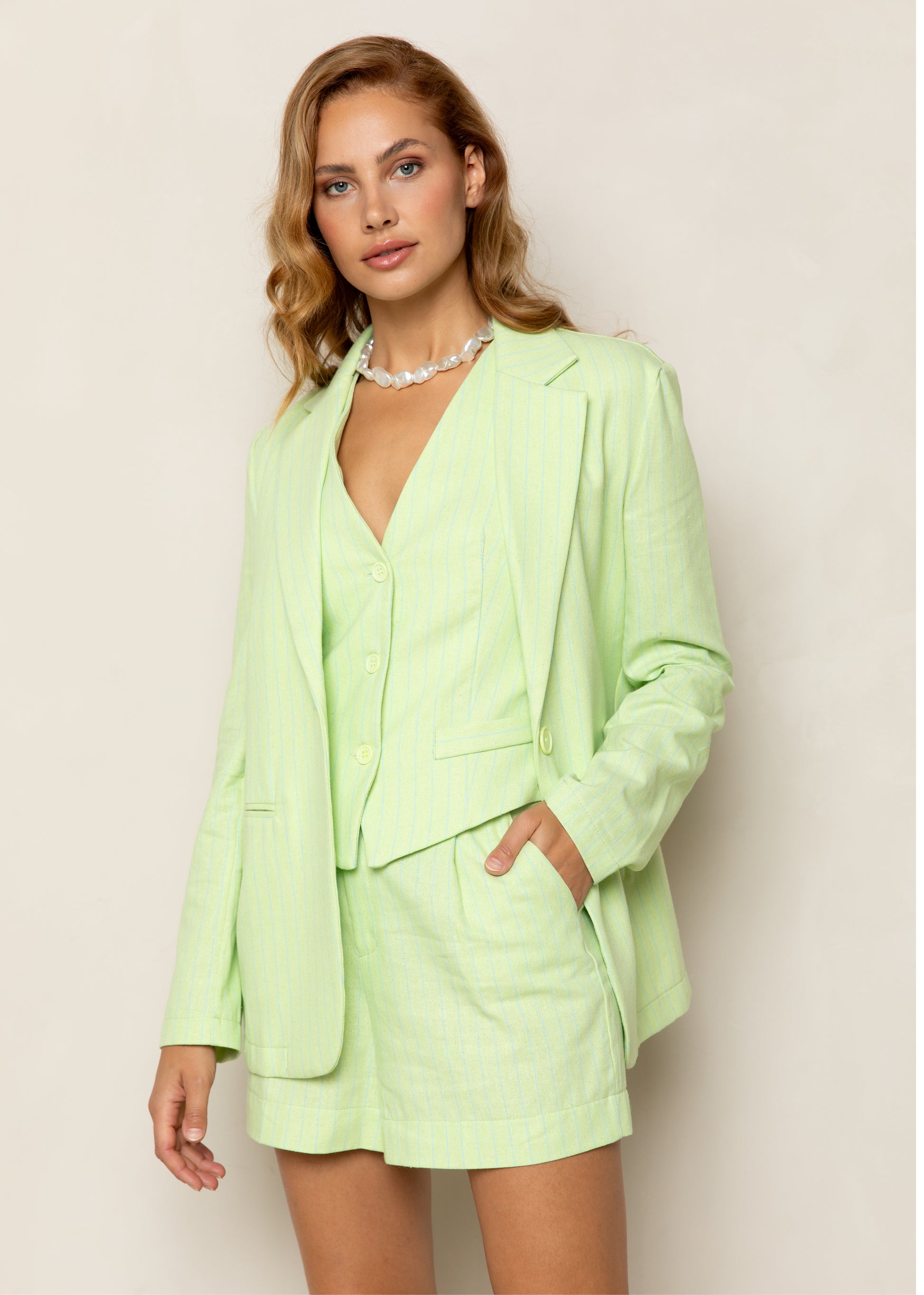 This waistcoat is made from a comfortable cotton fabric with a refined stripe pattern, giving it a fresh and modern look. The classic button closure at the front and the welt pockets add an elegant and timeless touch. Wear it as a set with the matching blazer or style it separately for a playful twist.