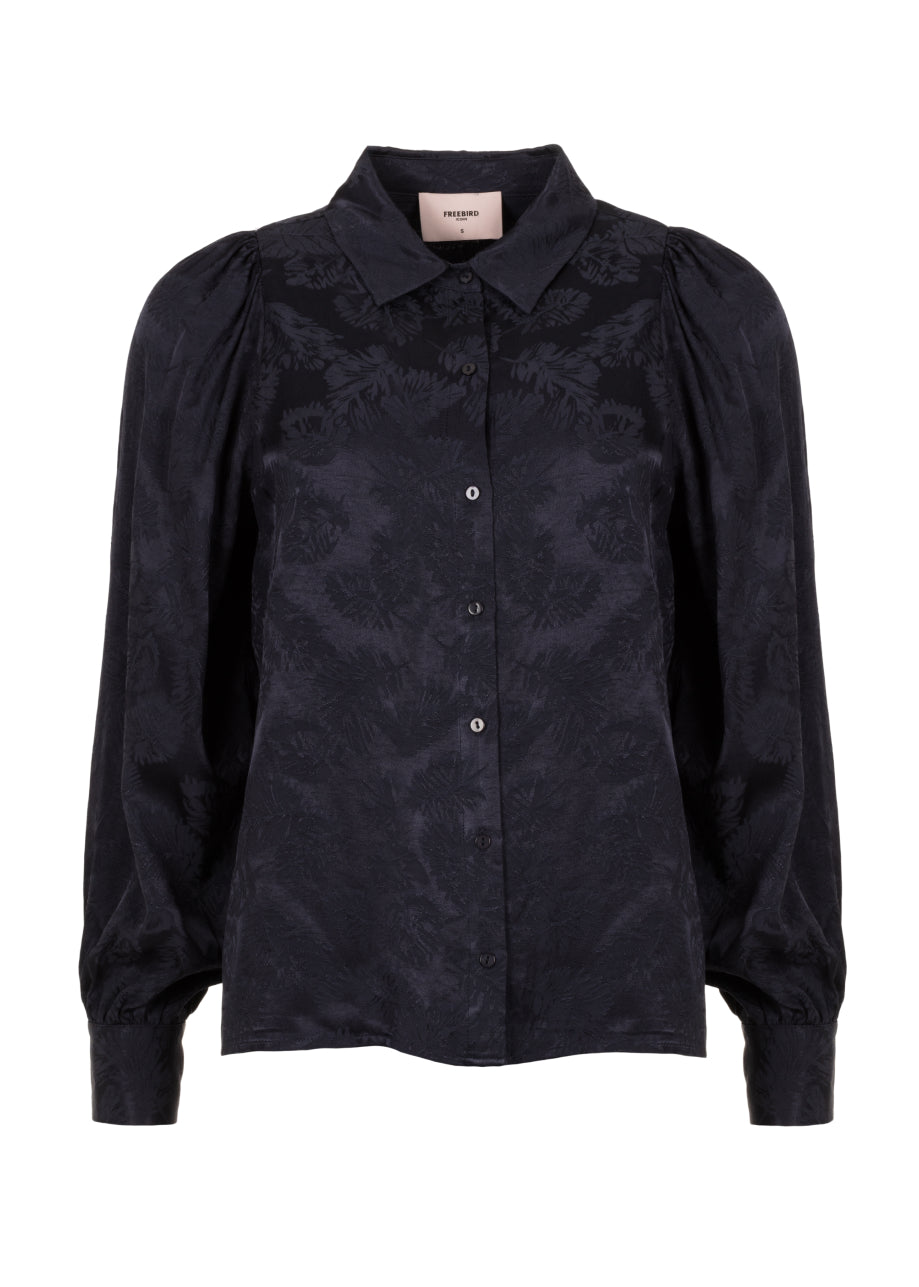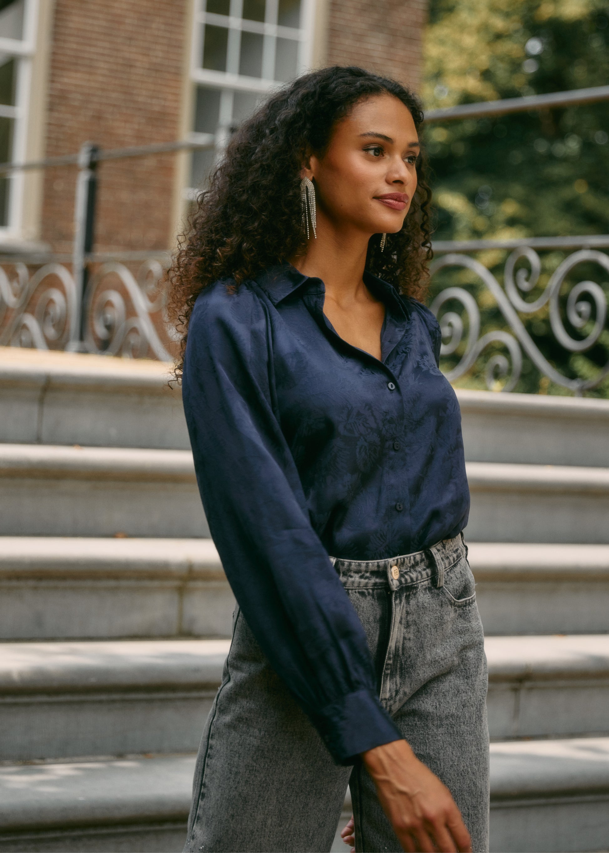 This elegant blouse in Navy is made from a luxurious, shiny fabric with a subtle floral jacquard, giving it a refined look.
