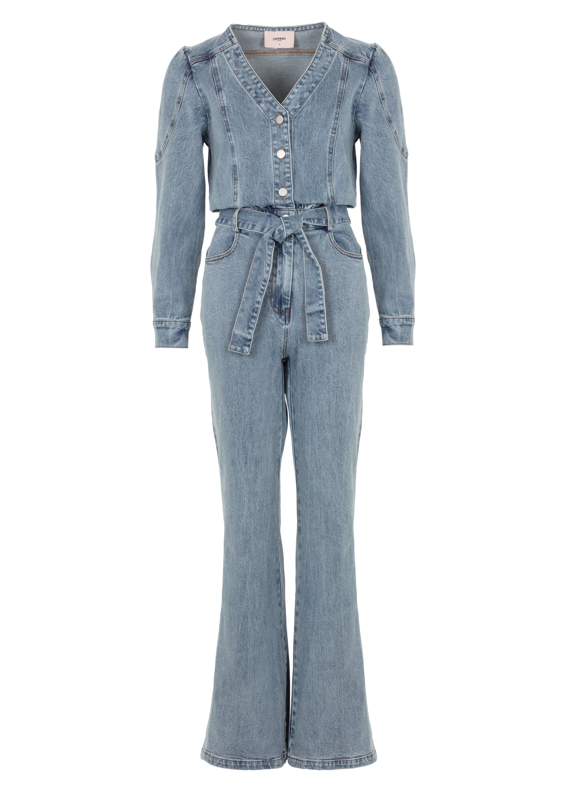This stylish blue denim jumpsuit combines comfort and fashion effortlessly. Made from a cotton blend with a bit of stretch, it offers ease of movement and a flattering fit. The jumpsuit features flare legs and a waist strap, accentuating your taille while adding a touch of retro flair.