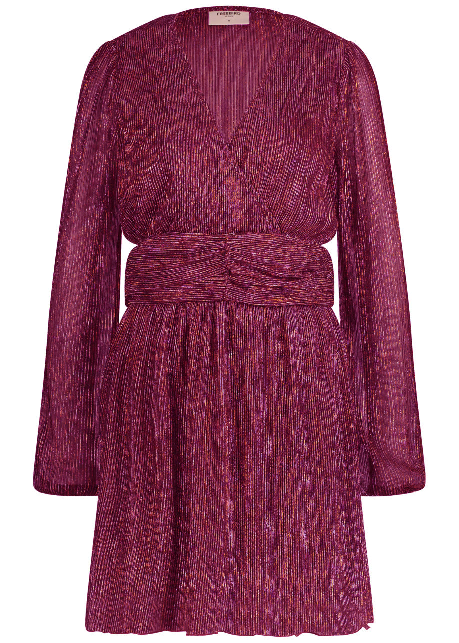 This elegant dress in Pink/Red is made from a luxurious plissé fabric with lurex, providing a subtle shimmer. The dress features an elastic waistband for a flattering fit and smock cuffs on the sleeves, adding a stylish finish.