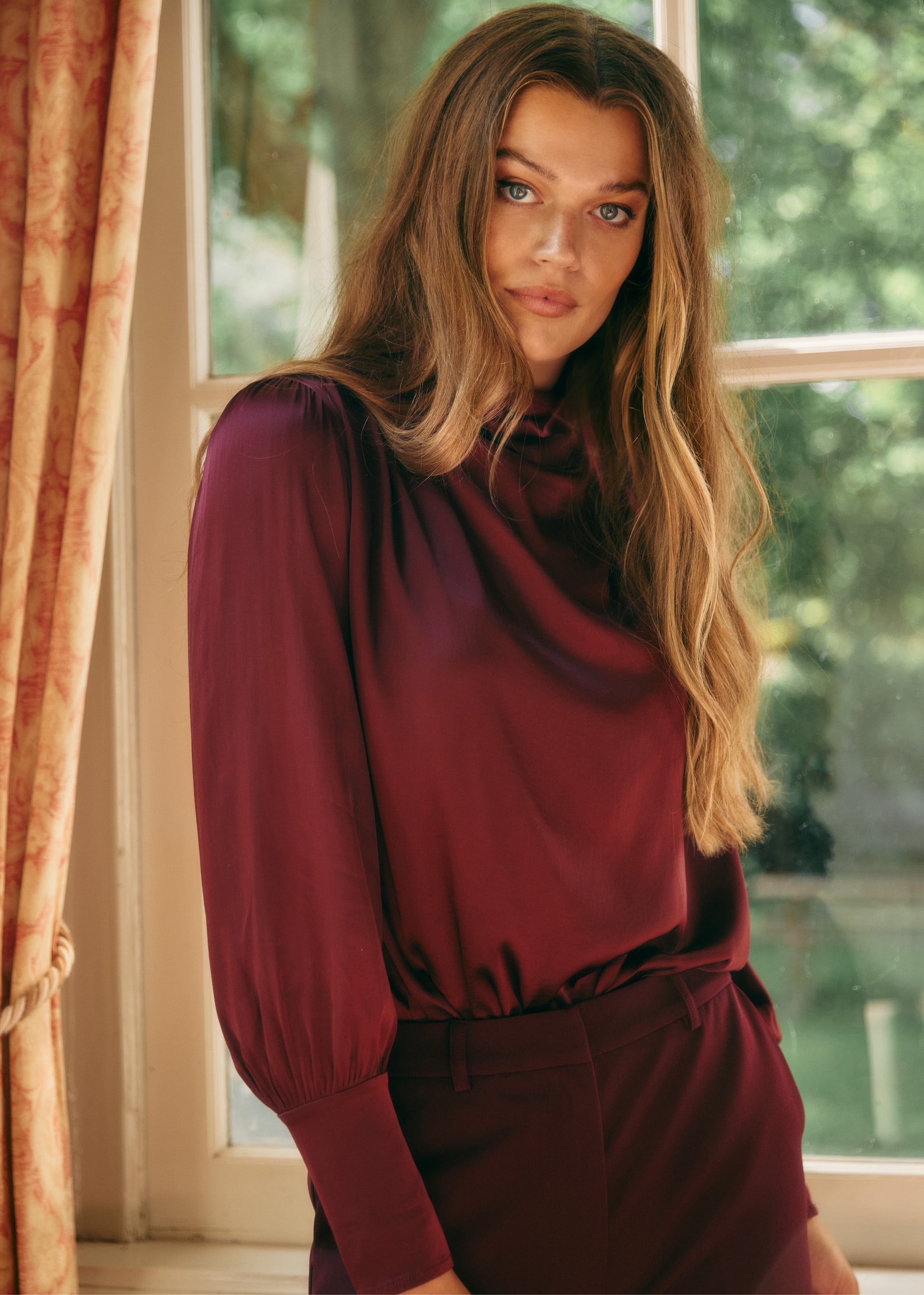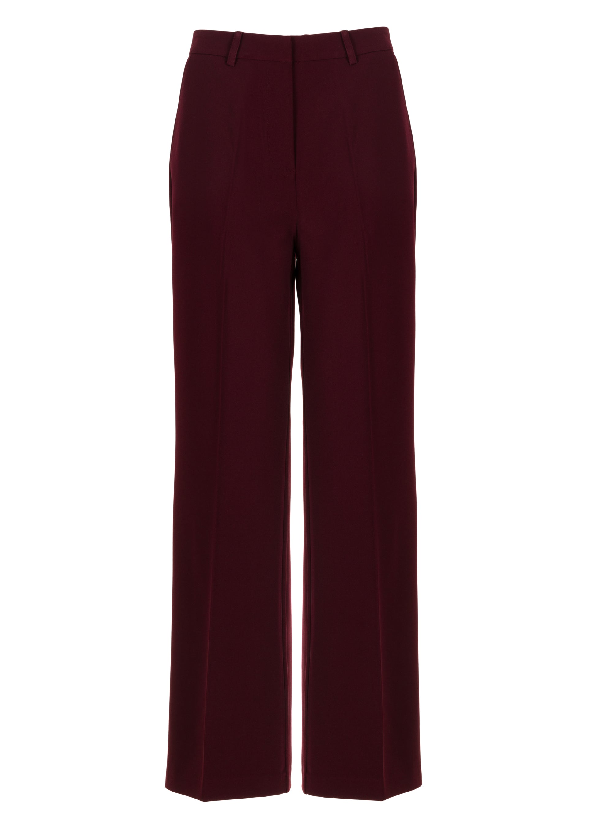 This elegant high-rise pants in the color Burgundy is a refined addition to your wardrobe. Made from a luxurious polyester blend with stretch, the pants offer both comfort and style. The wide legs, belt loops, and side pockets provide a modern and versatile look.