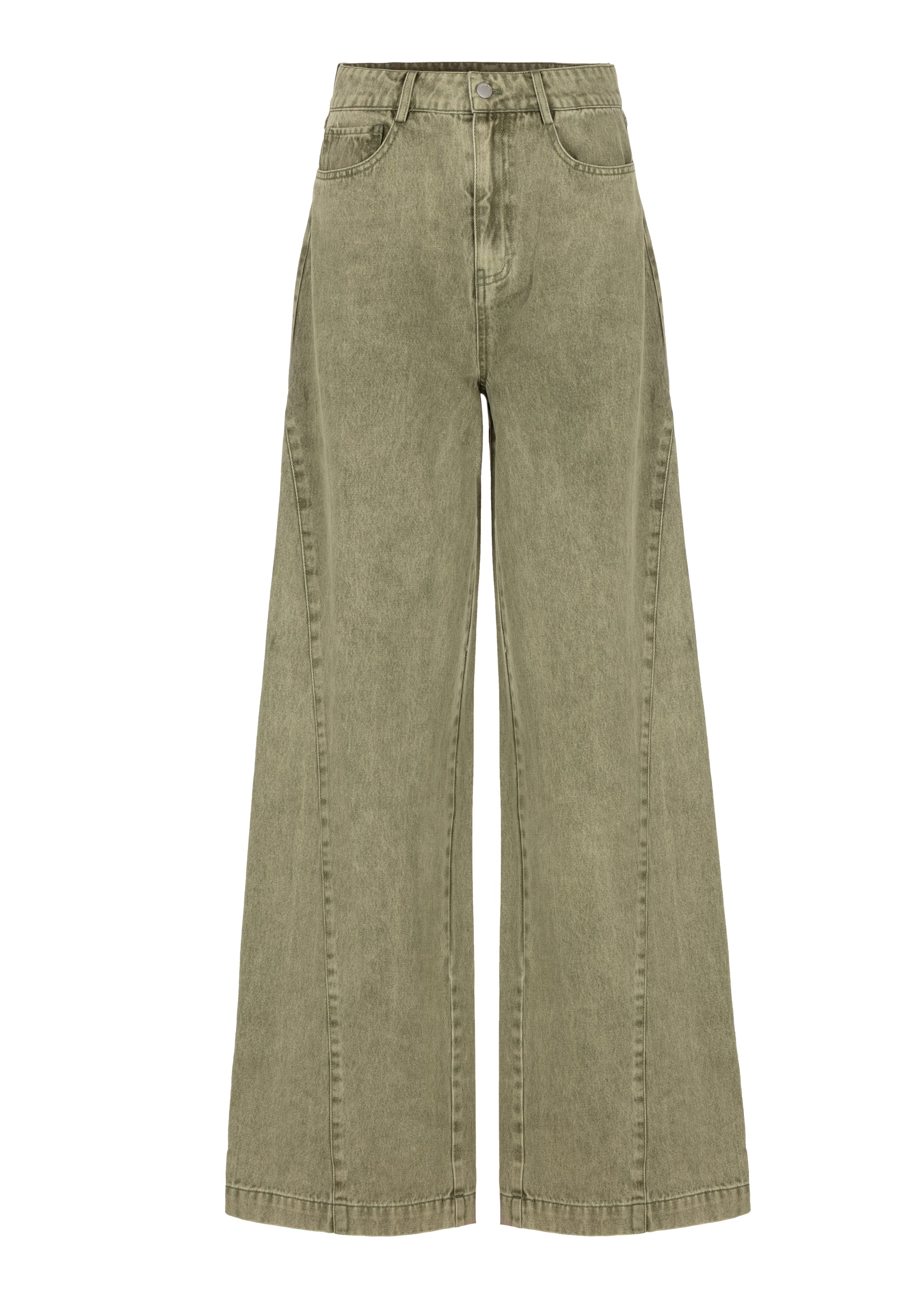 This pair of trousers is made from a sturdy cotton fabric with an authentic, lightly washed finish. The design features a high waist and straight, wide legs that create a timeless and flattering silhouette. The classic five-pocket styling and clean finish make these trousers a versatile piece, easy to style for both casual and more polished looks.