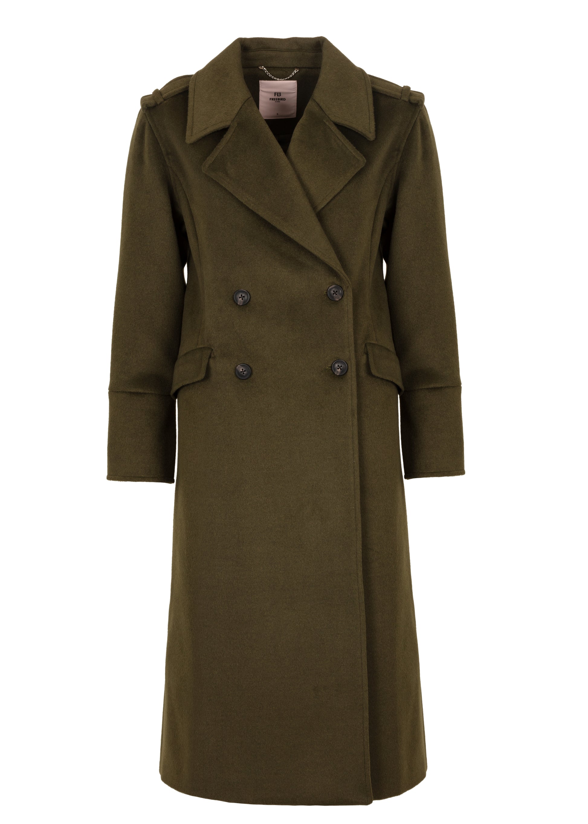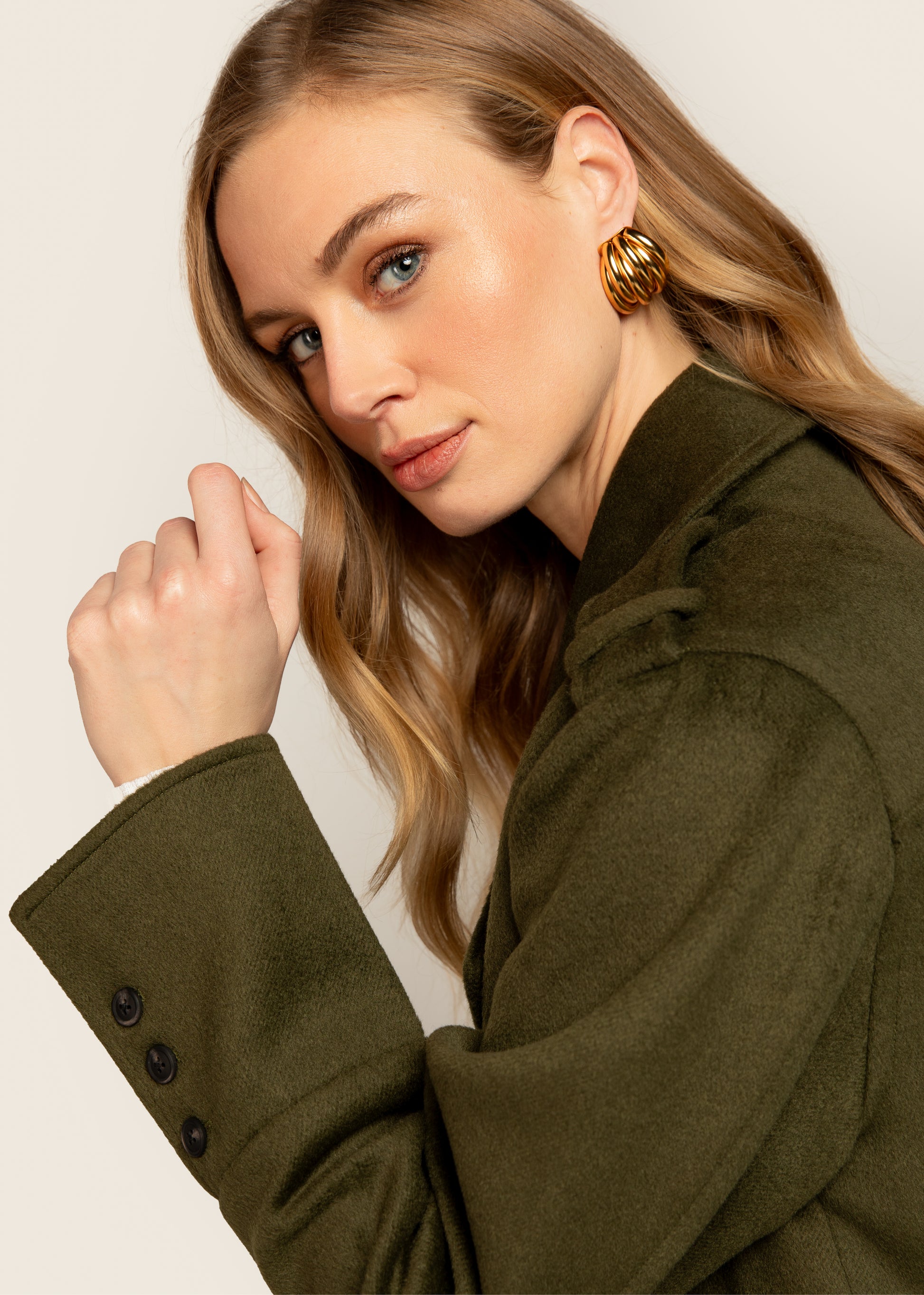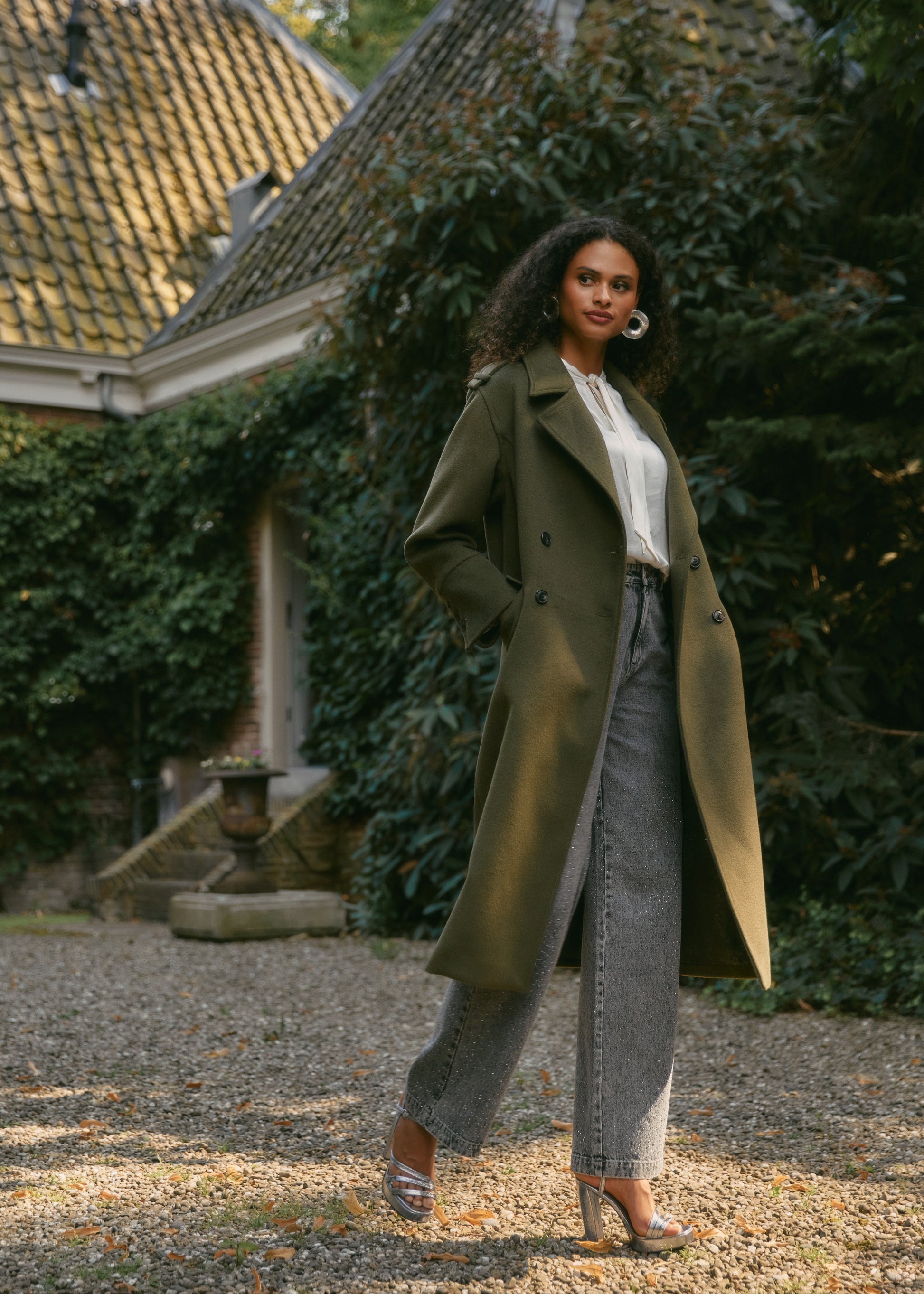 This stylish long coat in the color Cypress Green is made from a wool-like fabric, perfect for the colder months. The green color makes it easy to combine with various outfit.