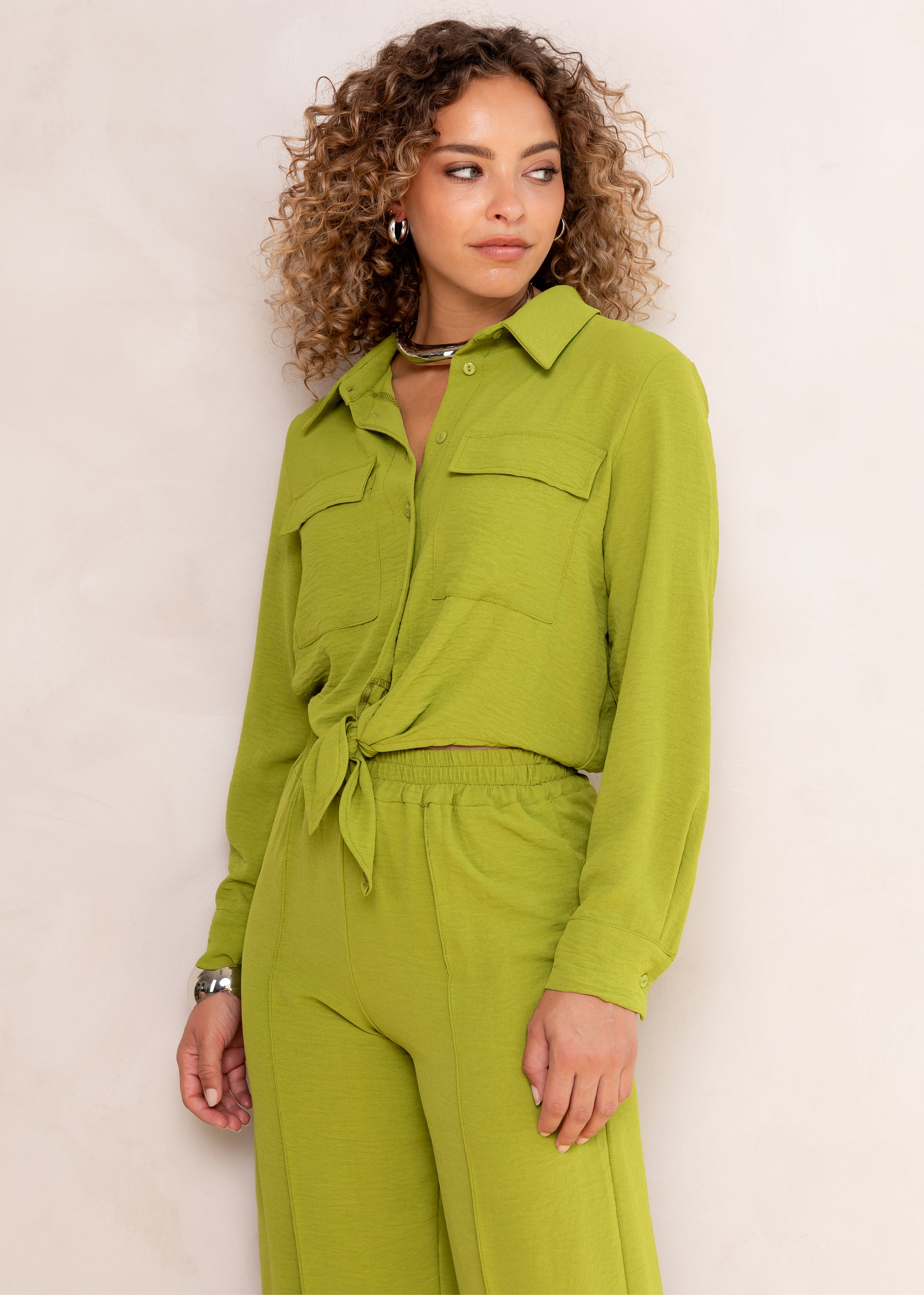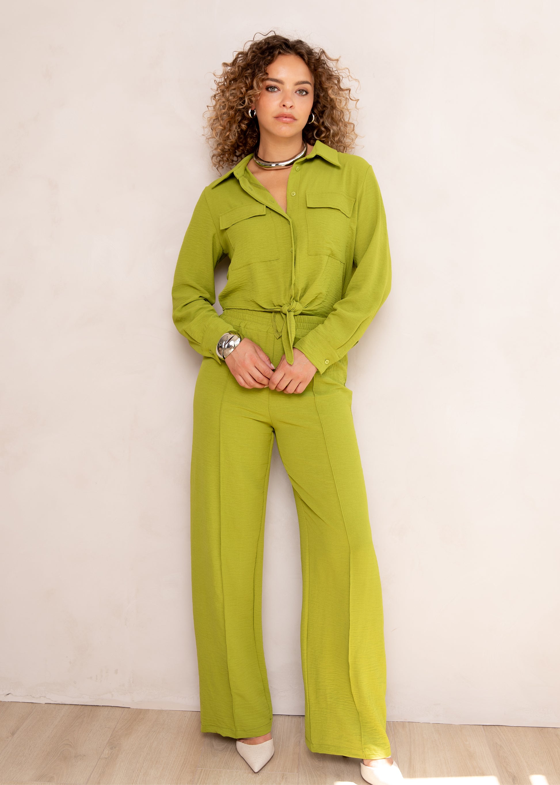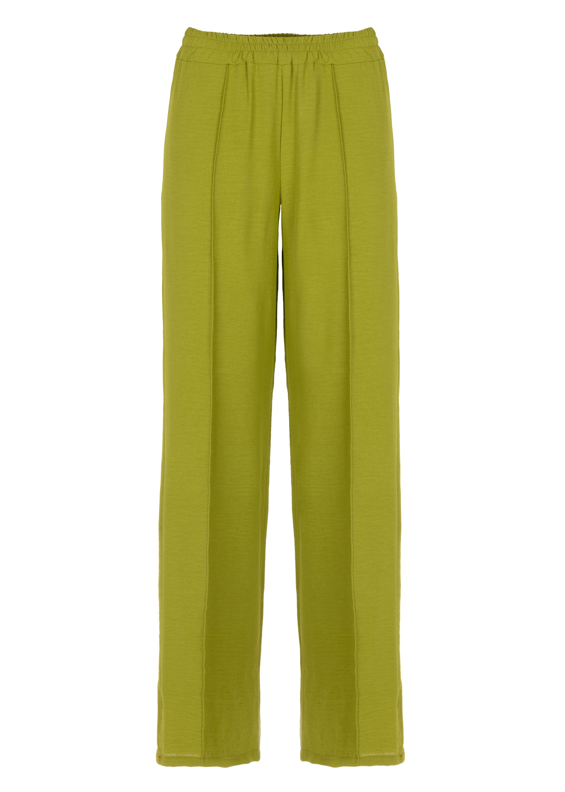 These trendy wide-leg trousers in a fresh green shade are made from a textured polyester fabric, offering comfort and a modern look. The trousers feature an elastic waistband for a perfect fit and a pintuck detail on the front for a refined finish.
