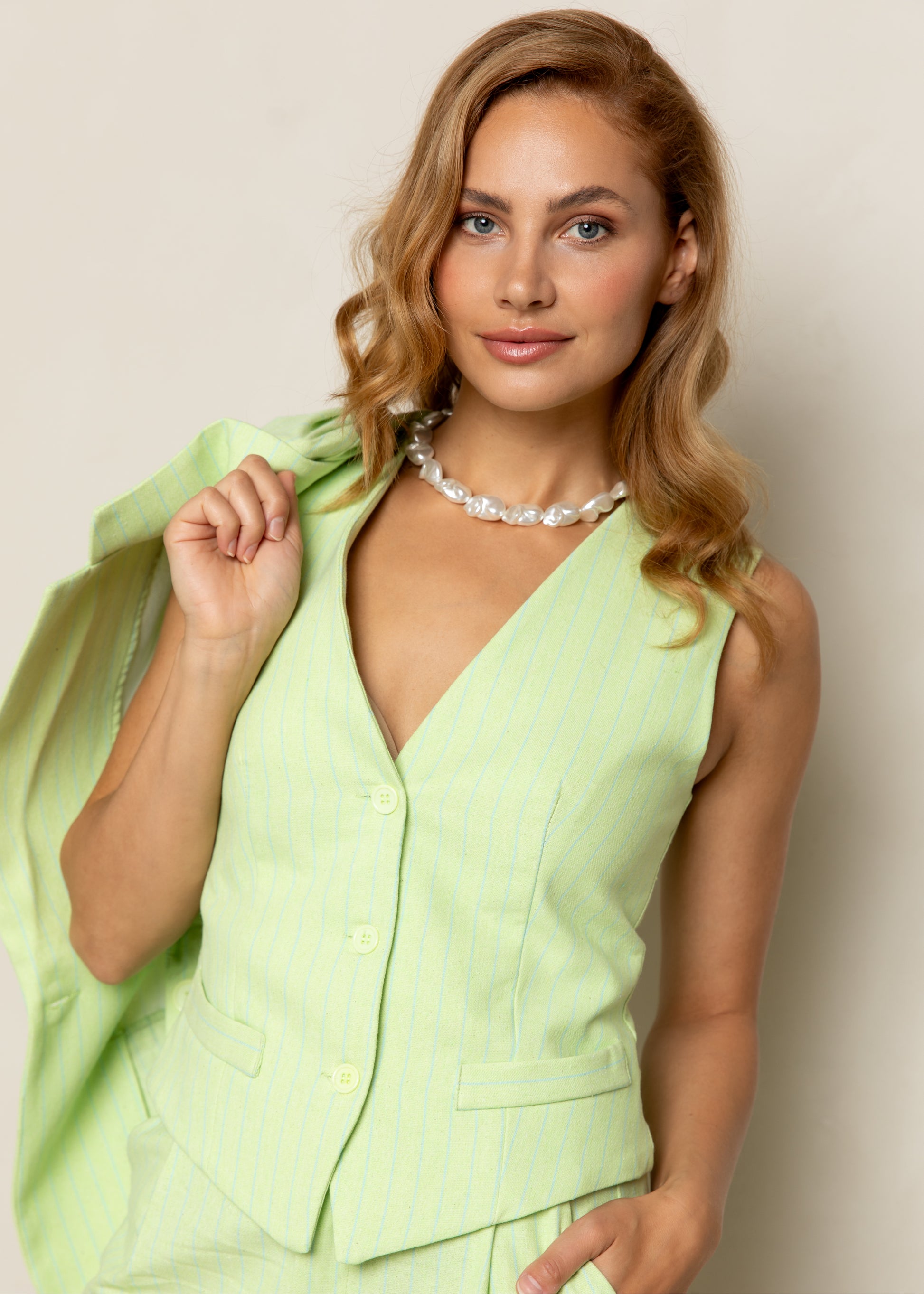 These shorts are made from a comfortable cotton fabric with a refined stripe pattern, perfect for summer days. The wide legs offer a breezy fit and a modern look. With practical side pockets and a timeless silhouette, these shorts are both stylish and functional. Pair them with a blouse or the matching blazer for a complete outfit.