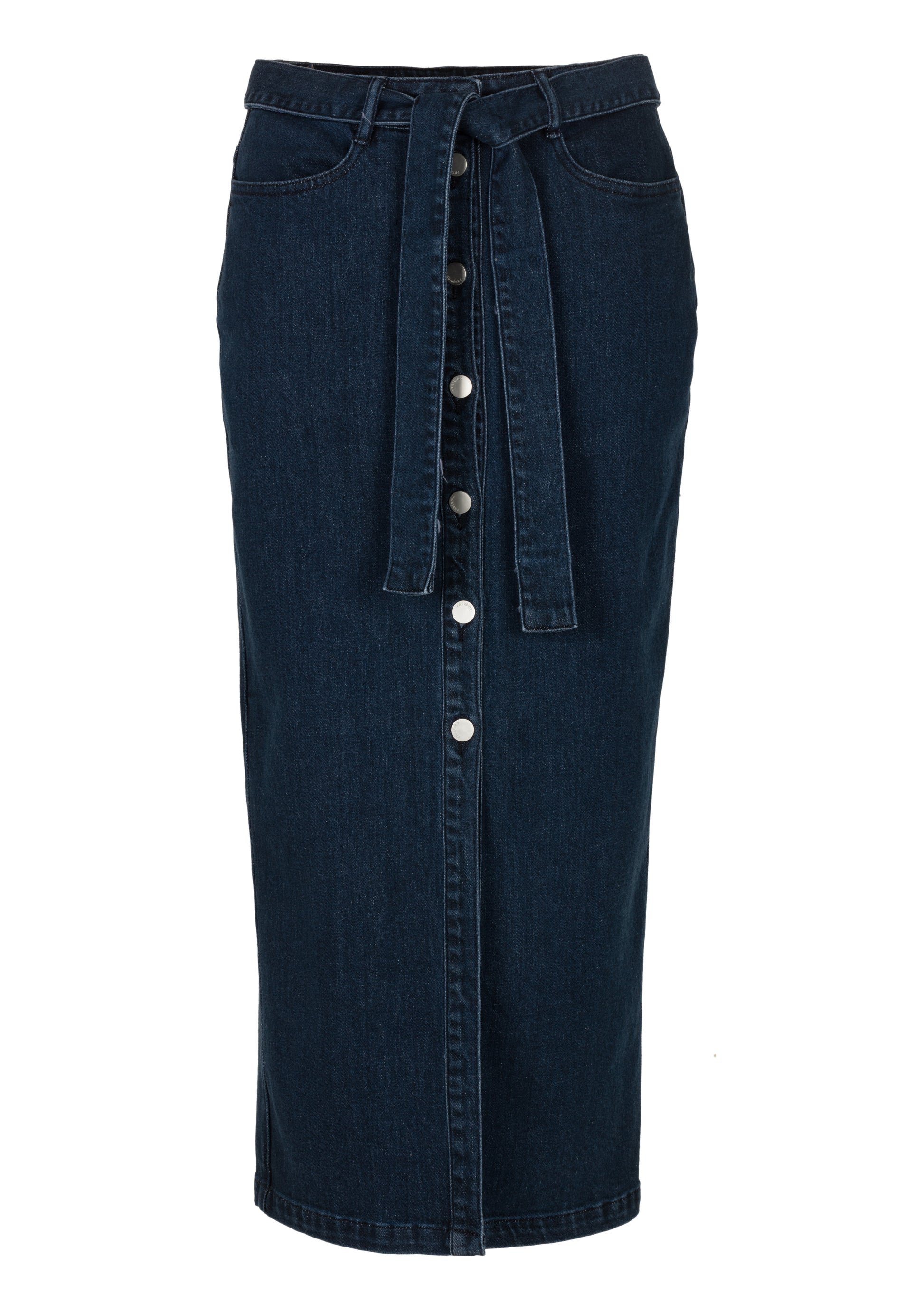 This elegant mid-blue denim skirt with a bit of stretch is a versatile addition to your wardrobe. Perfect for wearing to the office, a dinner, or a night out. Features: