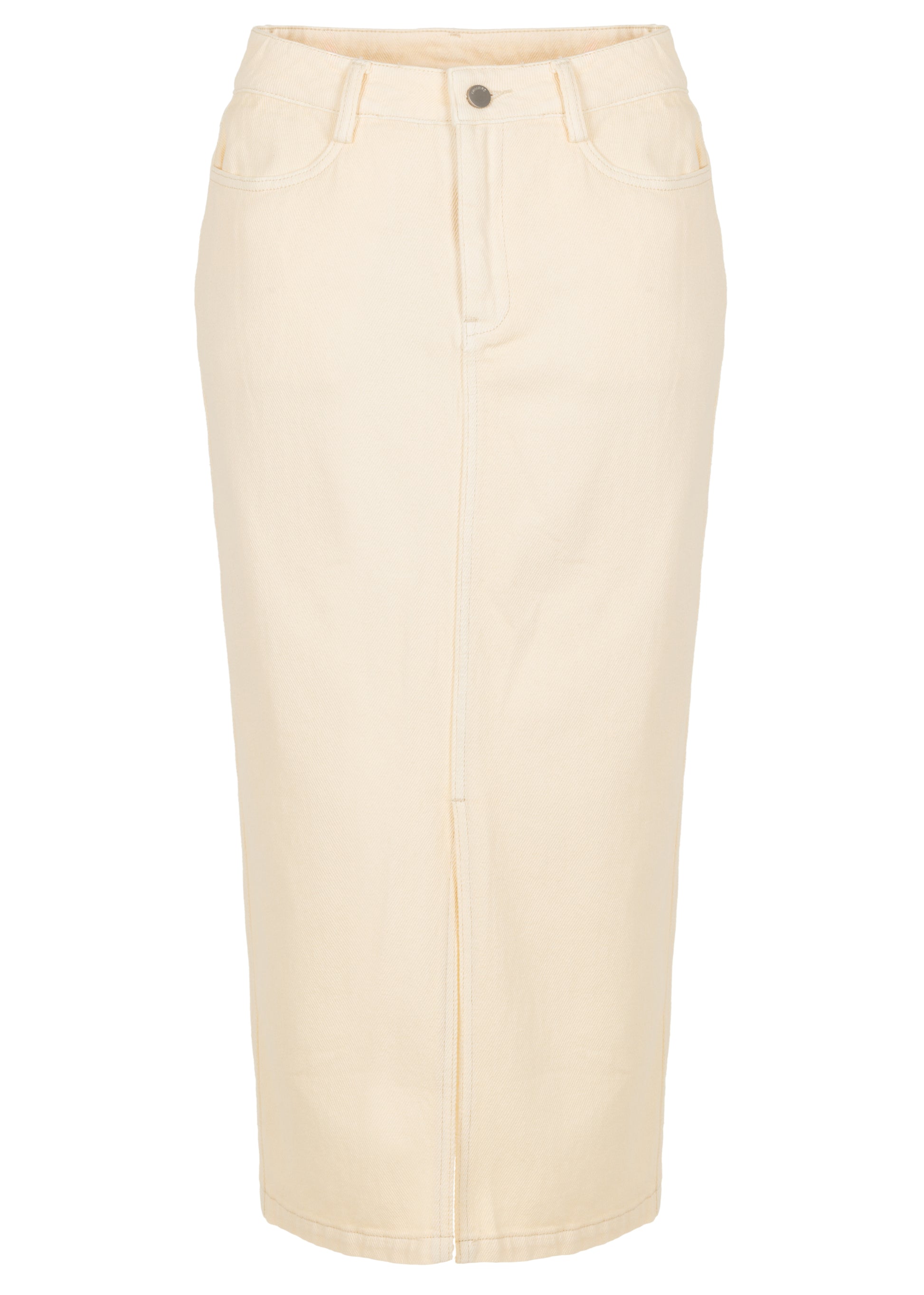 This high-waist denim skirt features a garment-dye finish, creating a unique and authentic look. The classic denim quality and back pockets give the skirt a timeless and edgy appeal. Perfect for pairing with both casual and dressed-up outfits.