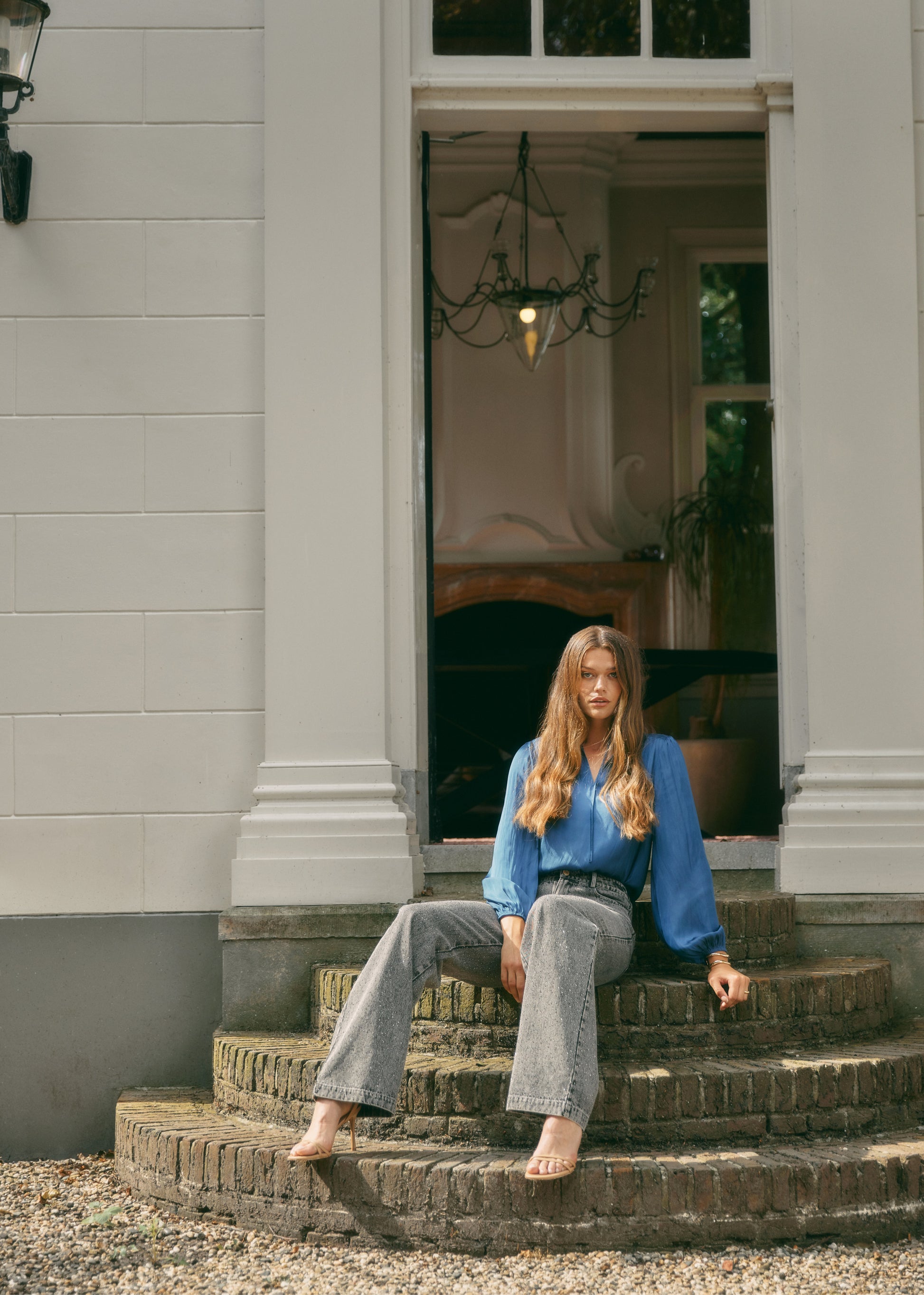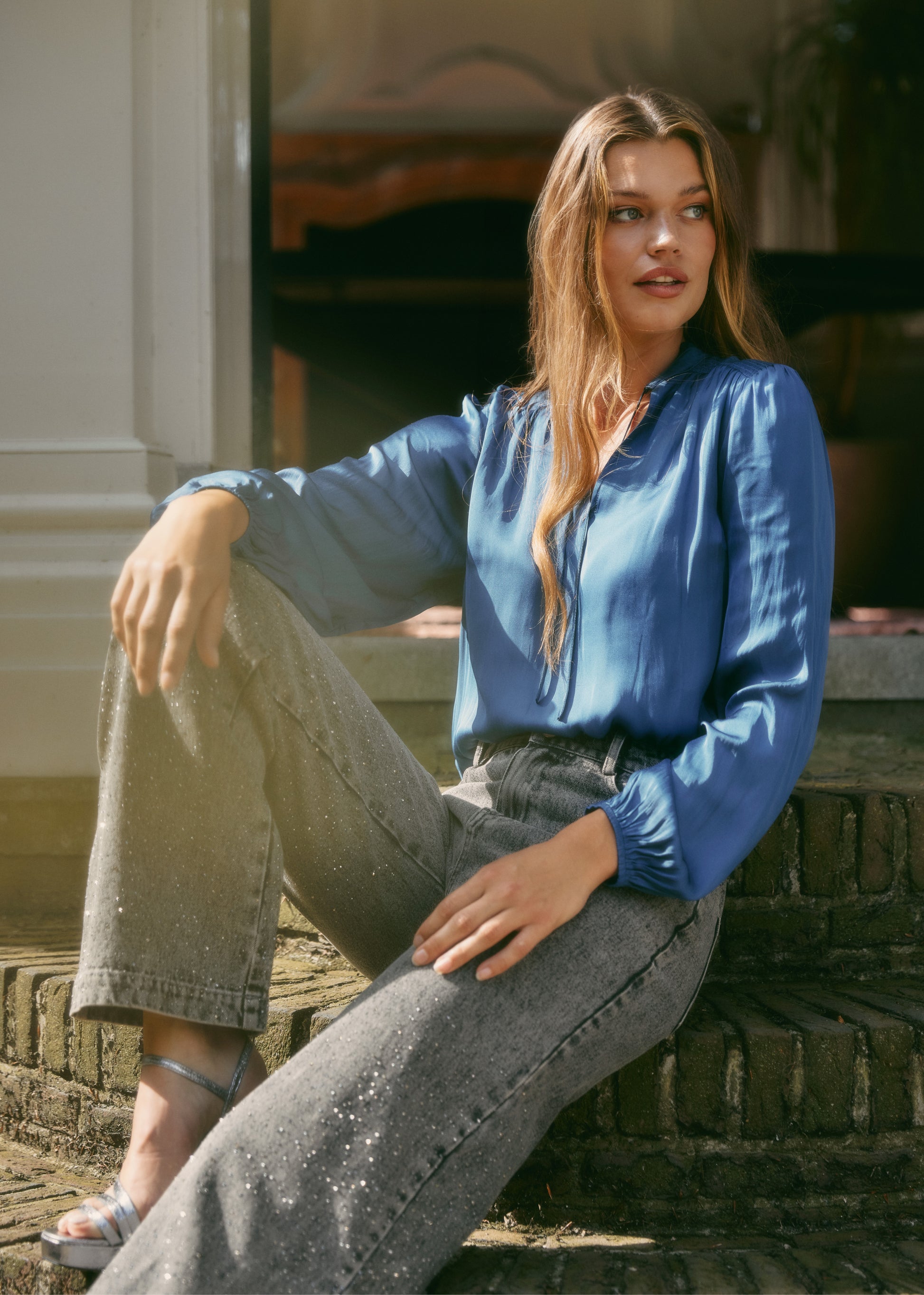 This elegant top in Ashleigh Blue is made from a flowing fabric of recycled polyester. The blouse features long sleeves and a refined V-neckline, finished with a smock detail and subtle straps.