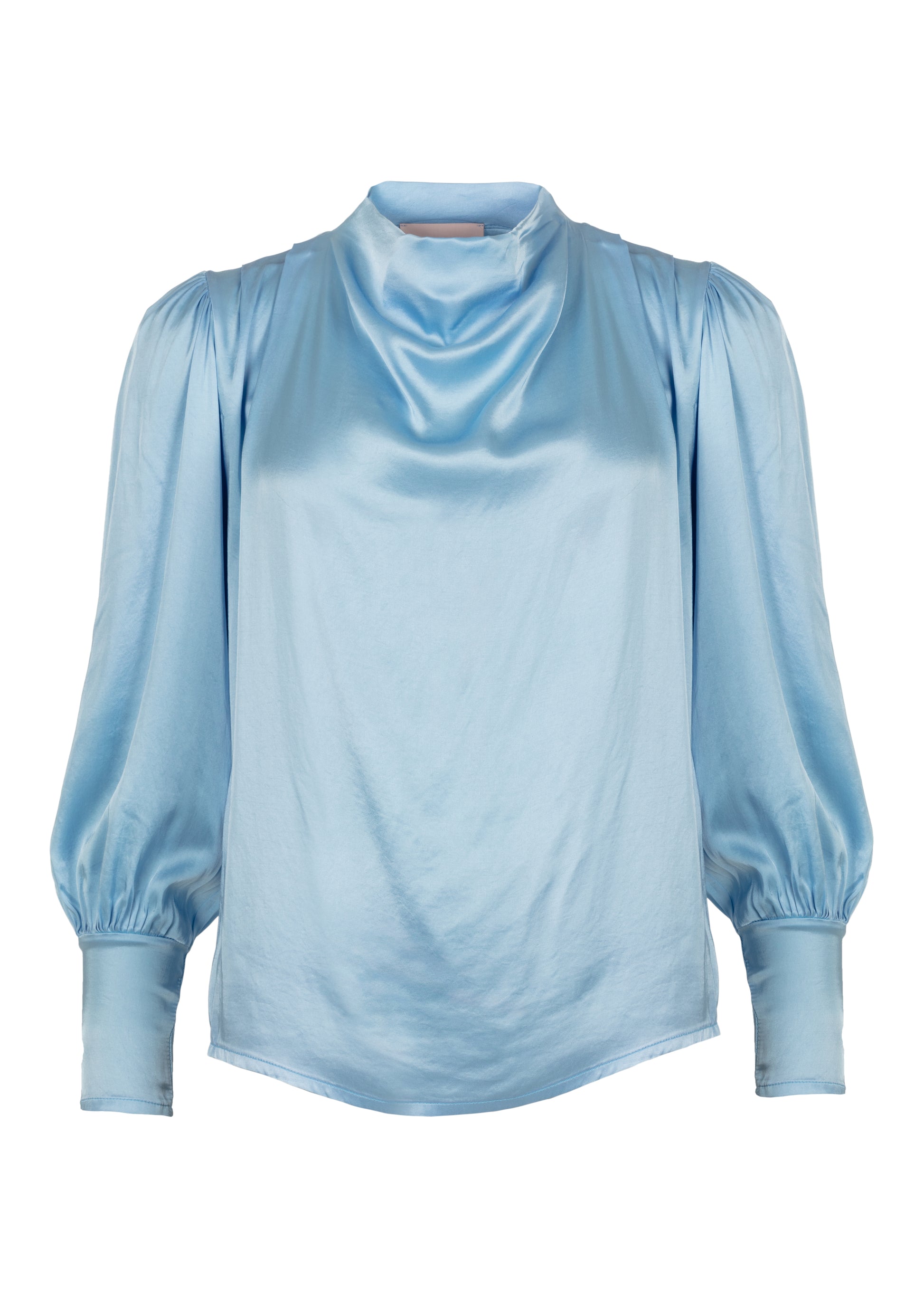 This elegant blouse is made from a shiny viscose fabric with stretch, offering a comfortable fit and a luxurious appearance. The long sleeves and the stylish cowl neckline provide the piece with a refined and feminine look.