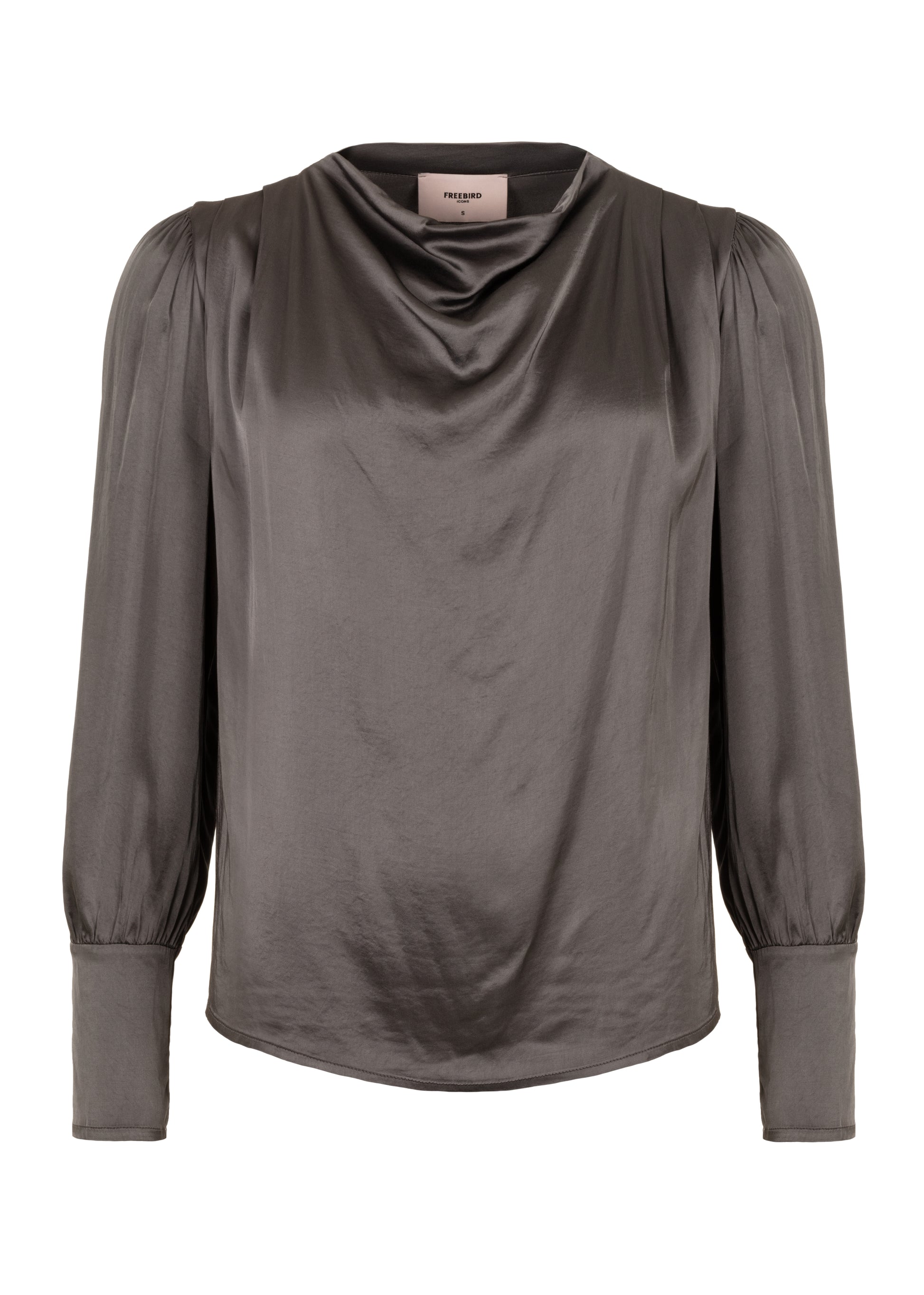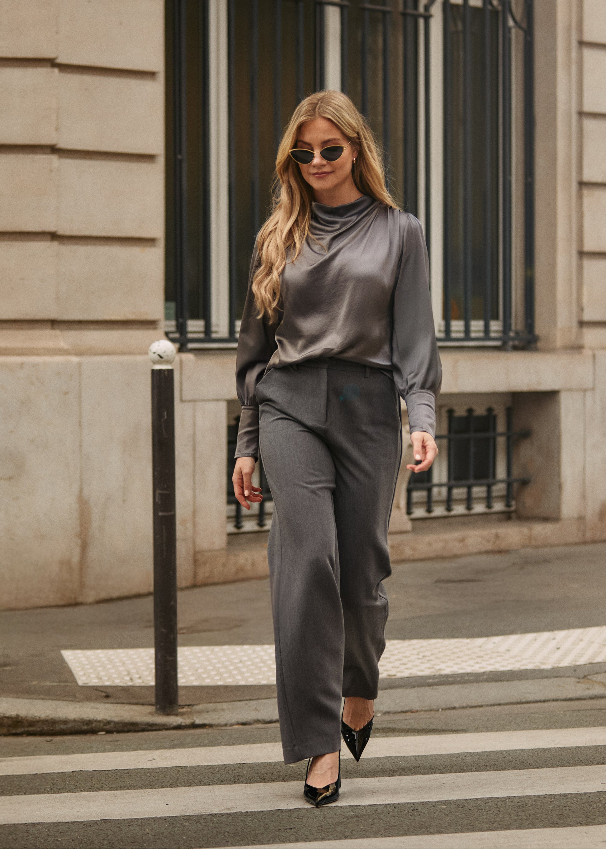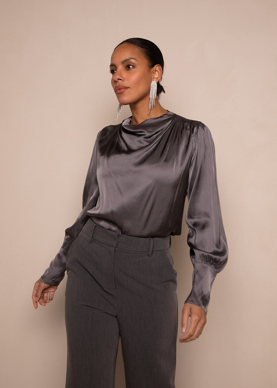 Crafted from a shiny viscose fabric with added stretch, this long-sleeved top drapes smoothly along the body. The waterfall neckline creates a chic and flattering effect, making it perfect for both business and festive occasions.