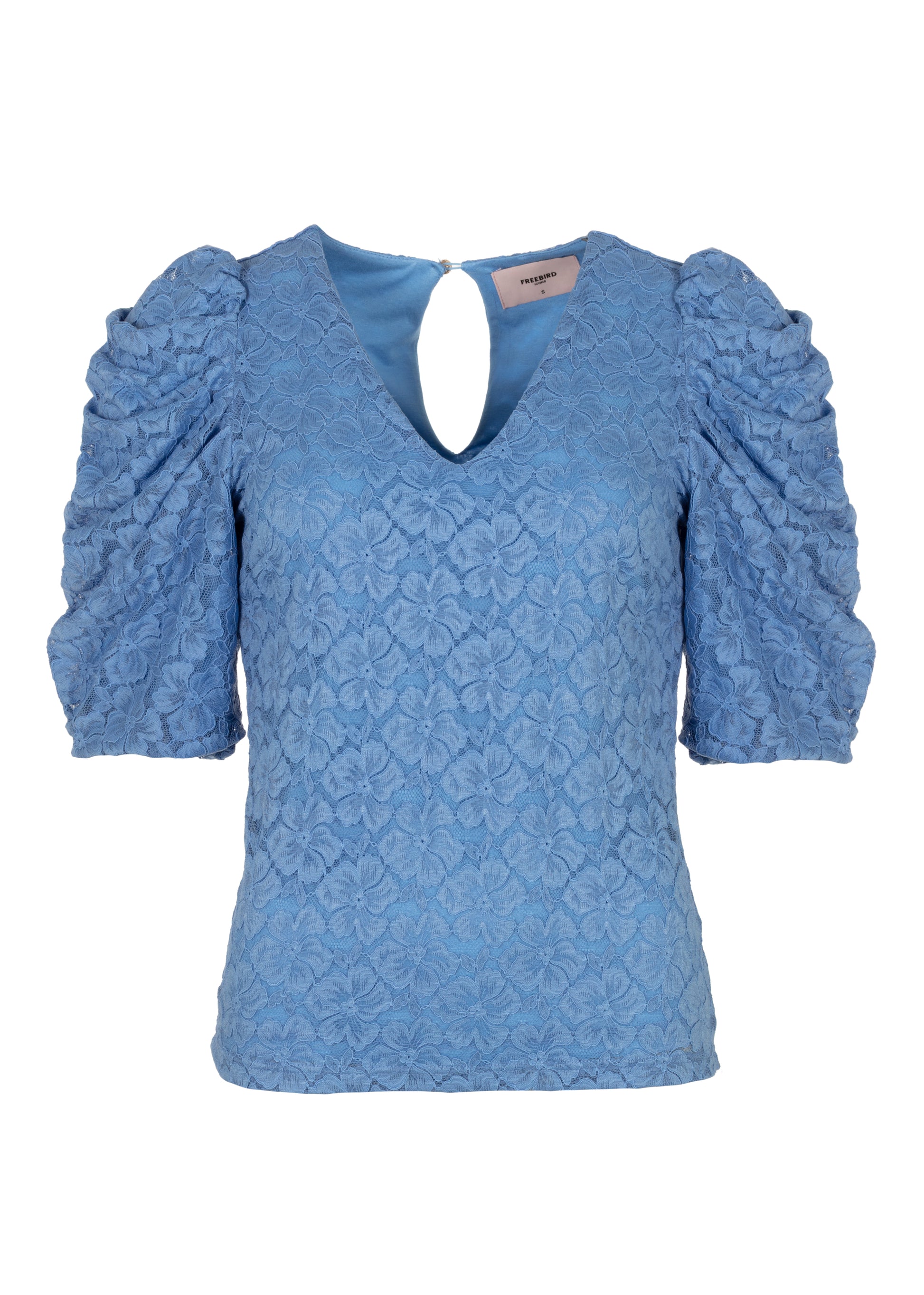 This top is crafted from refined stretch lace jersey, offering a feminine look with comfortable wear. The V-neckline and voluminous puff sleeves add an elegant and contemporary touch, making it suitable for both dressed-up and casual styling.