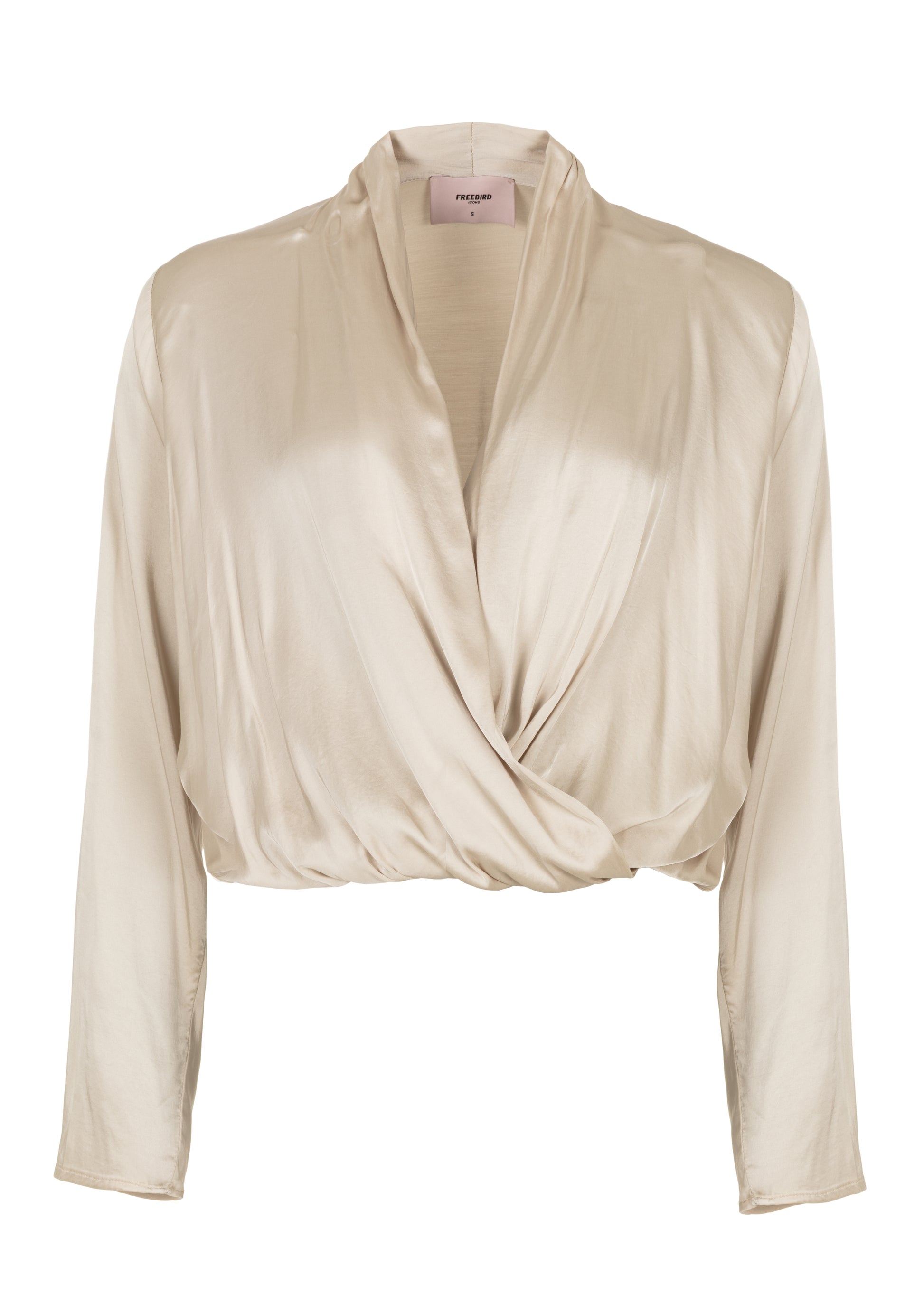 This blouse is made from a soft viscose jersey with a slight stretch, offering a comfortable fit and an elegant drape. The wrap design creates a feminine V-neckline, while the soft pleats at the front subtly enhance the silhouette. The long sleeves and cropped length give this piece a modern and refined look, making it perfect to pair with high-waisted trousers or a skirt.