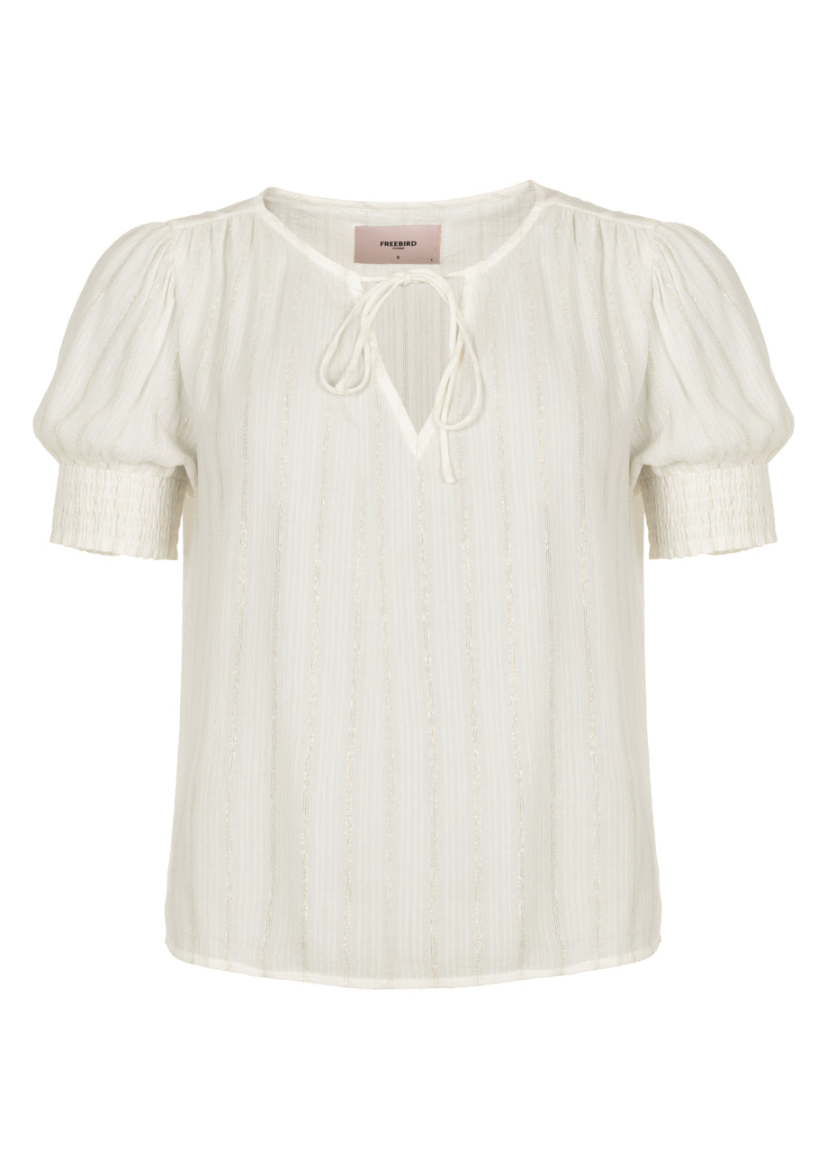 This airy short-sleeved top is made from a fluid viscose fabric with a subtle shimmer, thanks to the woven-in lurex thread. The elegant print gives the top a summery and feminine look. The smocked sleeve cuffs add a playful touch and extra comfort. A versatile piece that pairs perfectly with shorts, skirts, or jeans.