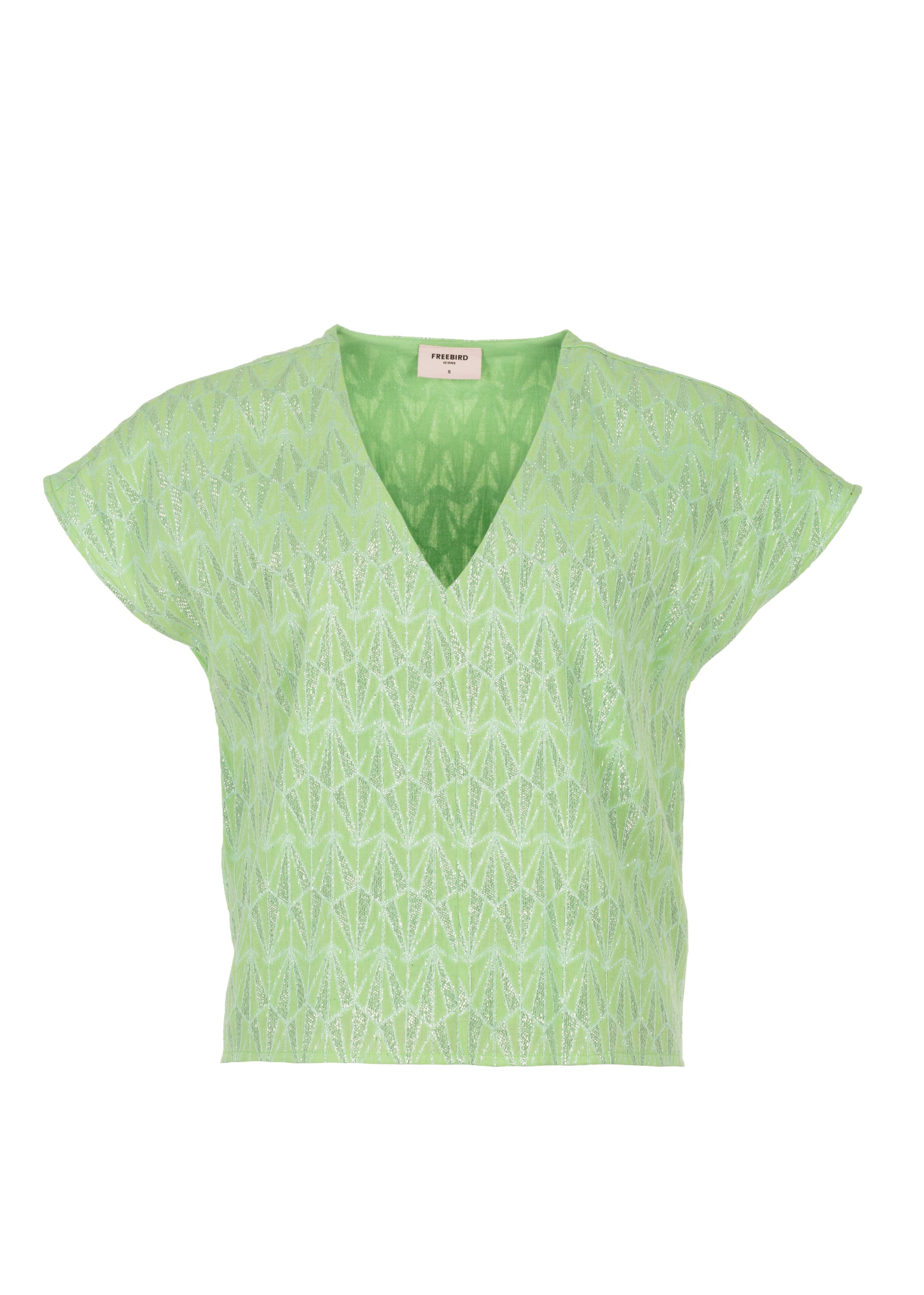 This stylish top is made from a luxurious cotton jacquard fabric with shimmering lurex yarn, creating a refined and modern look. The V-neckline and short sleeves add an elegant and airy touch, making it perfect for various occasions.