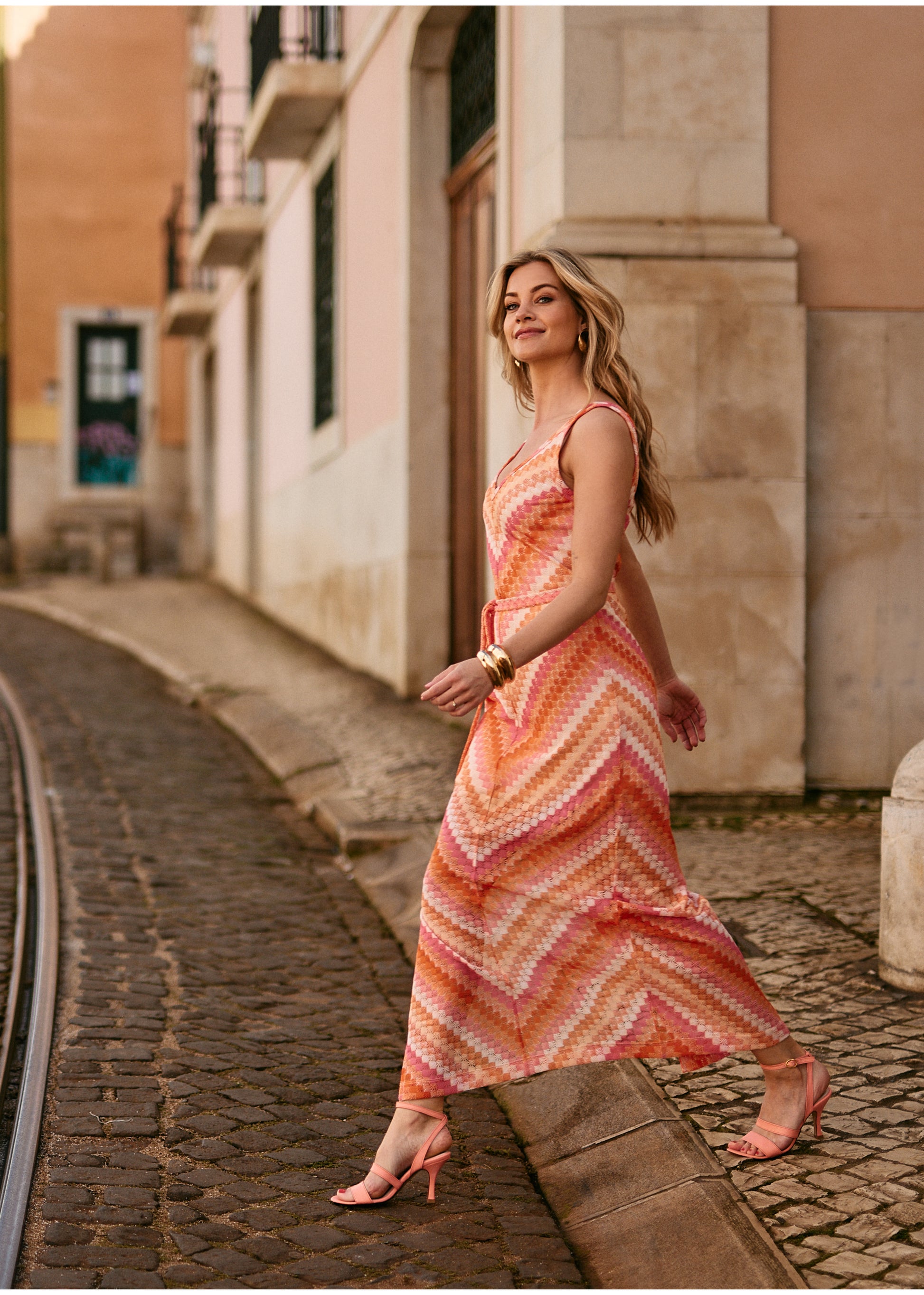 - Coral-colored heels with a peeptoe.