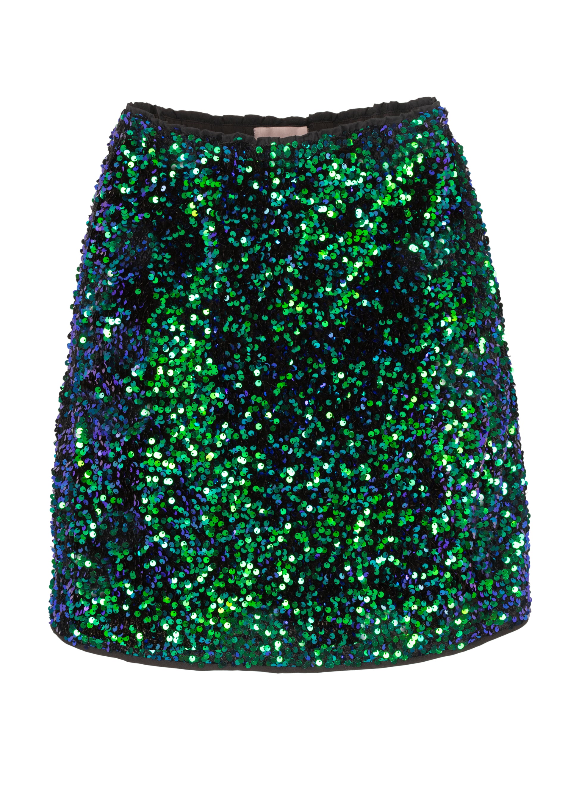 This striking mini skirt is made from a soft velour jersey fabric with sparkling sequins for a festive look. The skirt has a fitted silhouette and features a side zipper for easy on and off. Pair the skirt with the matching Tamar top for a complete, dazzling outfit.