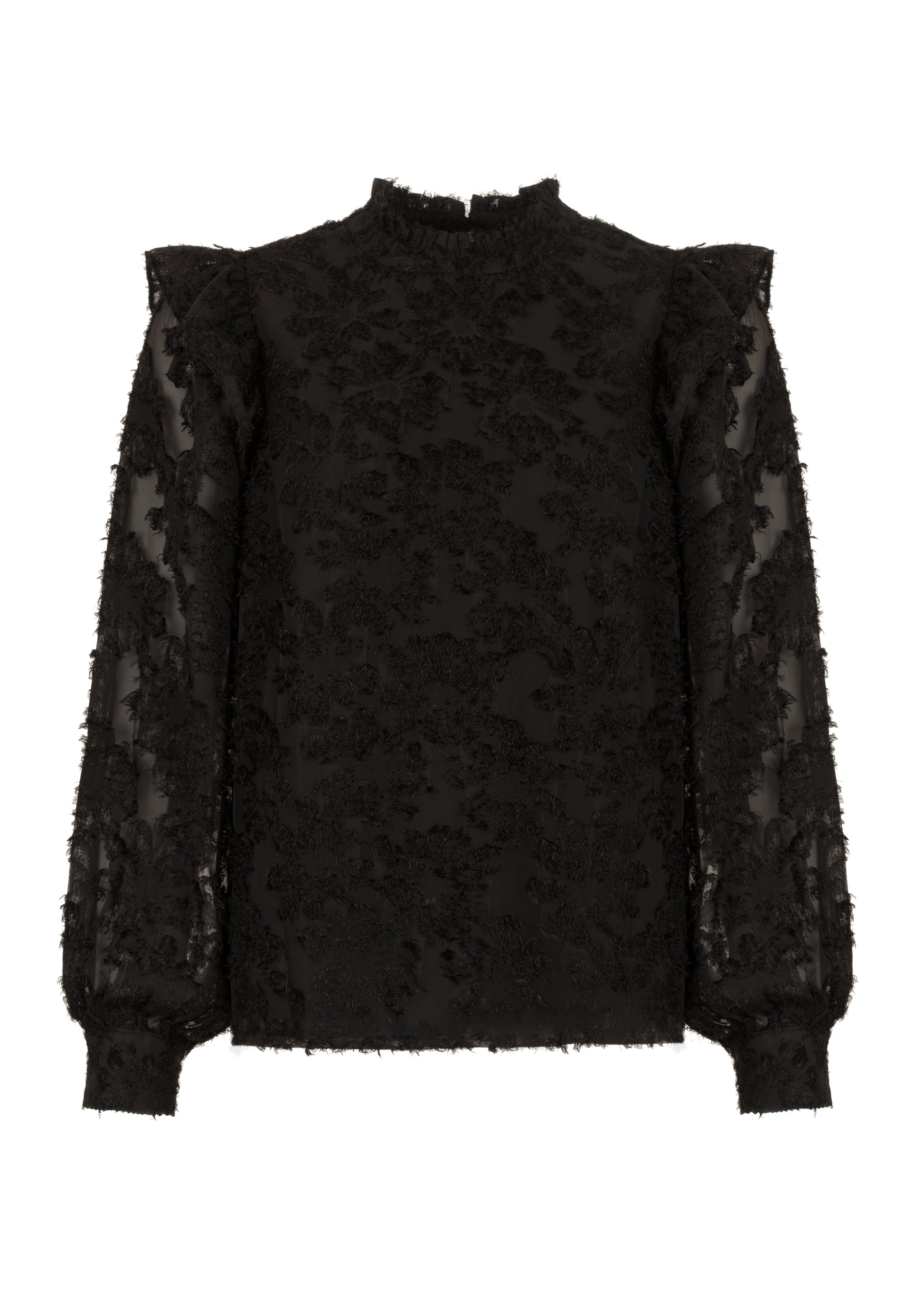 De Bambie Blouse is gemaakt van een zachte polyesterstof met subtiele haartjes, biedt deze blouse een rijke textuur en een elegante uitstraling. Het opstaande kraagje en de ruffle-details op de schouders zorgen voor een vrouwelijke, eigentijdse twist. De transparante mouwen voegen een luchtig contrast toe aan het gestructureerde lijfje.