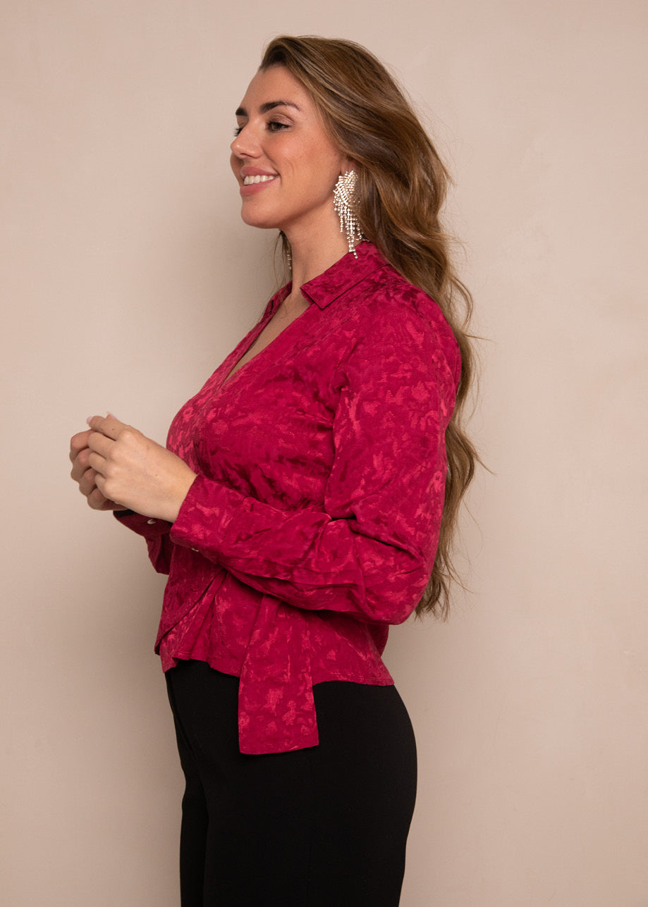 De blouse is uitgevoerd in een luxe jacquardkwaliteit met subtiel patroon, wat zorgt voor een verfijnde en moderne uitstraling. De D-ring sluiting accentueert de taille op stijlvolle wijze en creëert een flatterend silhouet. De lange mouwen met manchetten geven de top een klassieke touch, waardoor hij moeiteloos geschikt is voor zowel een casual als een geklede look.