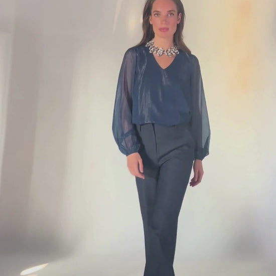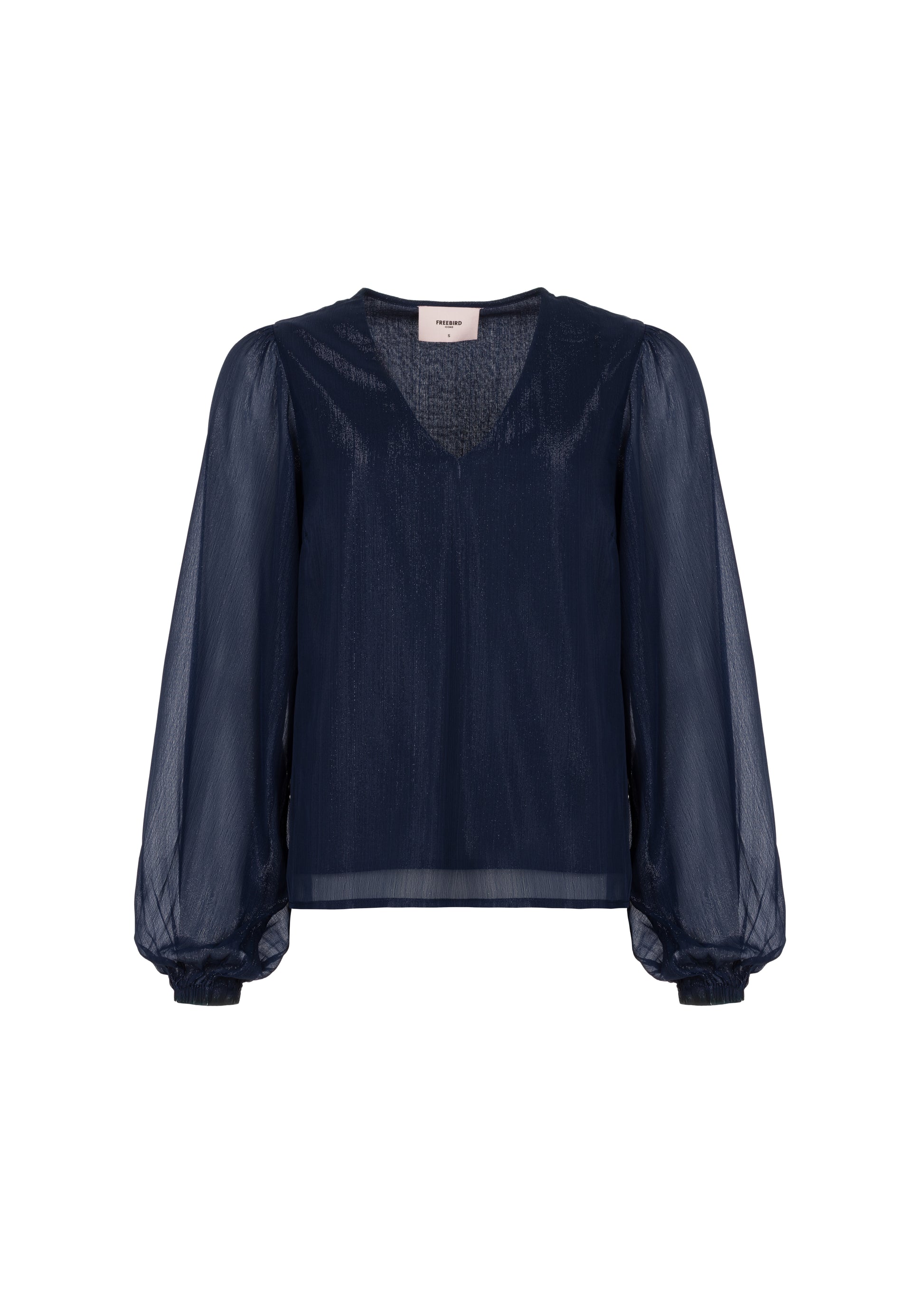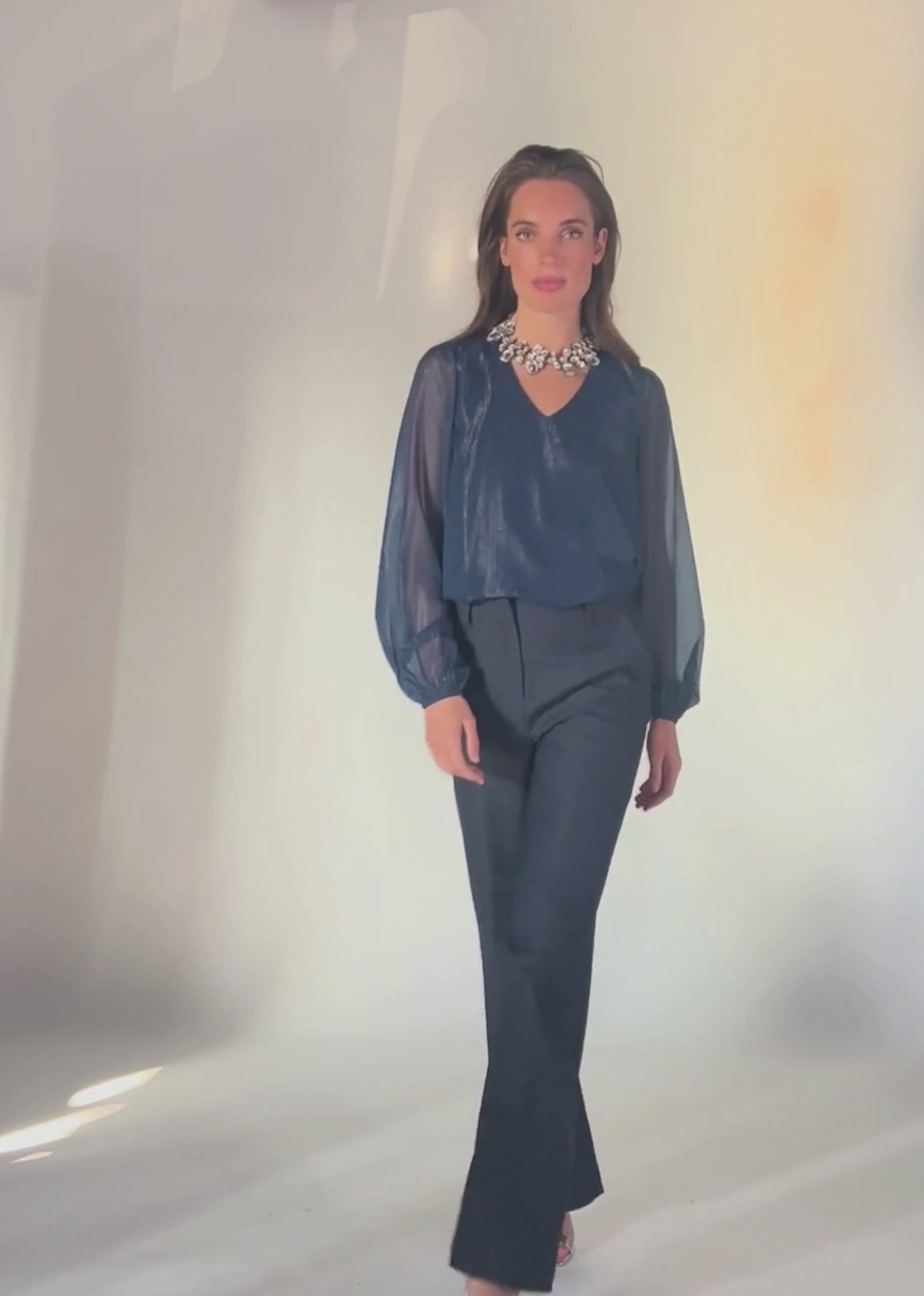 De blouse is gemaakt van een luchtige woven kwaliteit met subtiele zilverkleurige lurexstrepen die bij elke beweging een verfijnde glans geven. De diepe V-hals zorgt voor een vrouwelijke uitstraling, terwijl de ballonmouwen met elastische manchetten het ontwerp een speelse en stijlvolle twist geven. Perfect te combineren met zowel een jeans voor een casual look als een rok of pantalon voor een feestelijke avond.